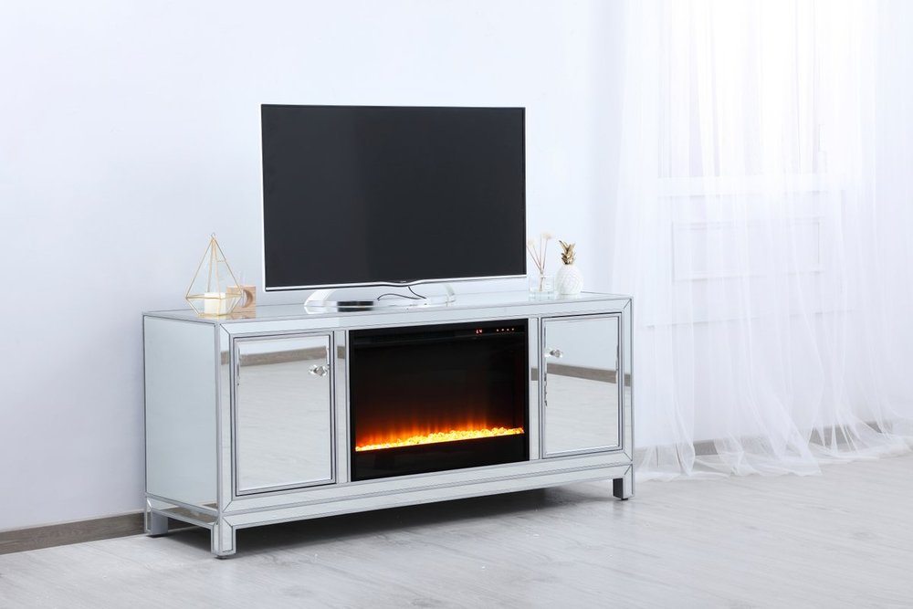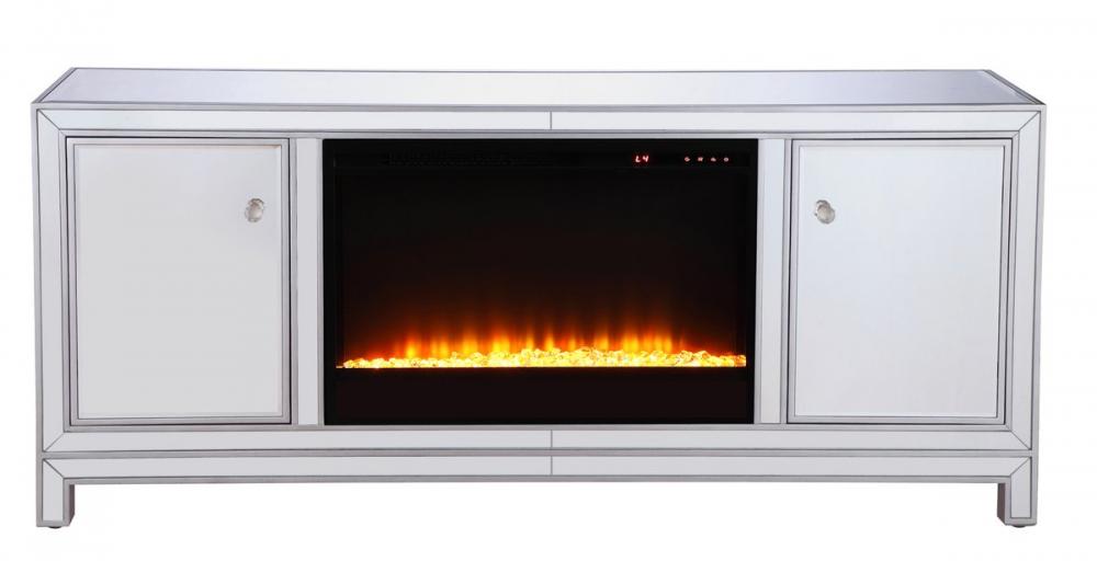 Sleek and vibrant, this classy media fireplace cabinet combo will make a striking statement in any room can showcase up to a 60" flat screen TV at a perfect height. Featuring gleaming criss-cross style mirror panel and hand-rubbed silver finish, brushed steel knobs. Functional and chic, with 2 soft-closing side doors. This includes the electric crystal fireplace insert that is easy to install into the cabinet. Beautiful crystals adorn the base of the fireplace. Set the mood with adjustable temperature and lighting settings.