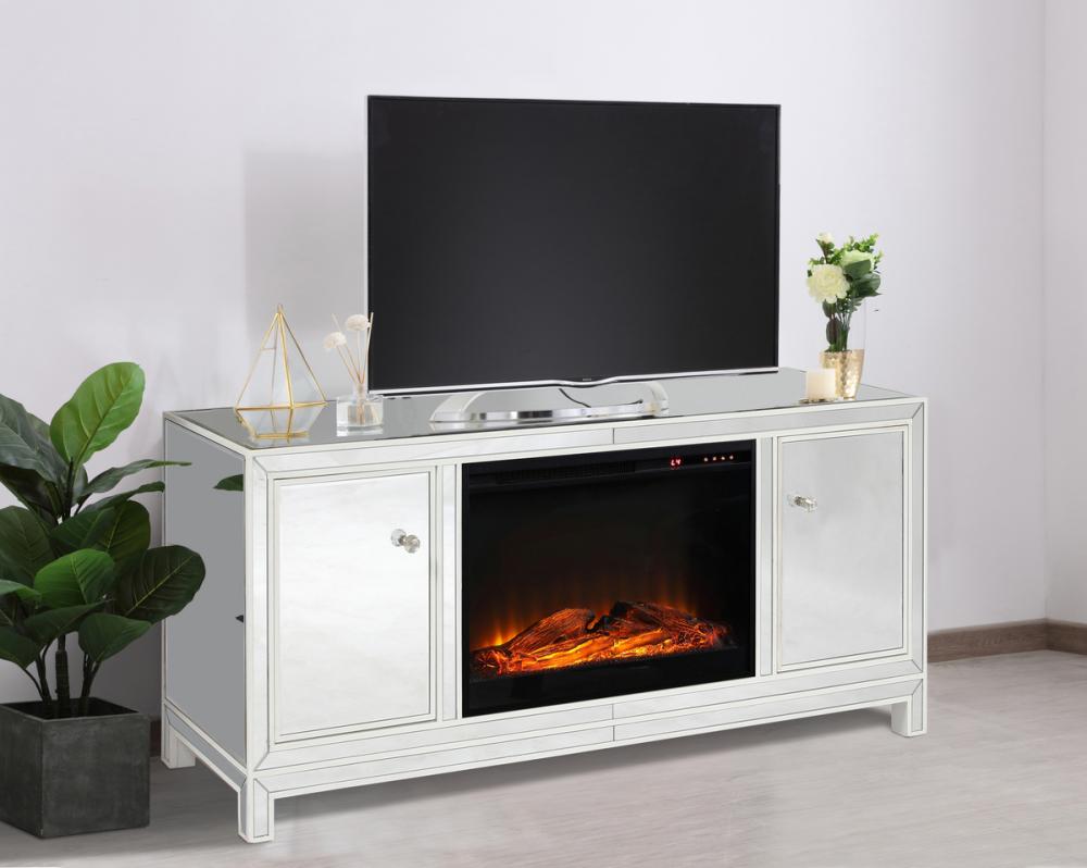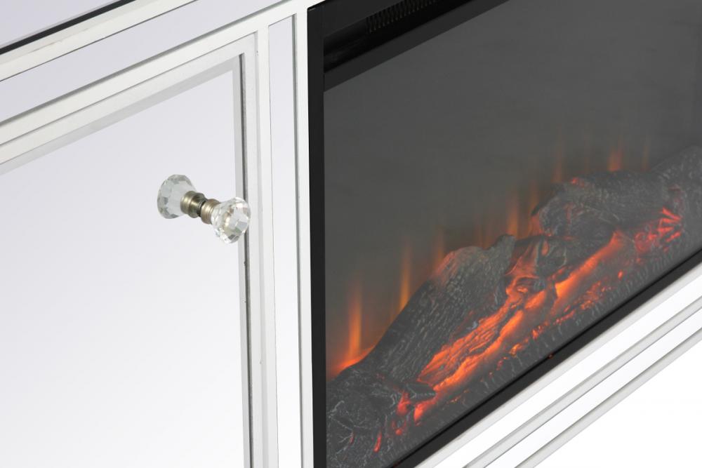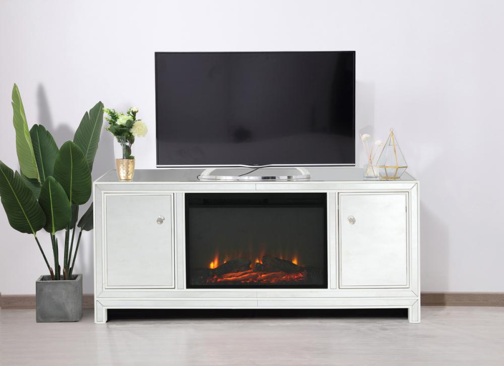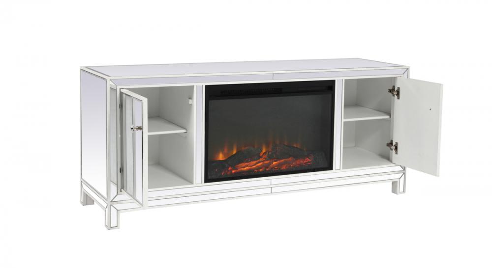 60 in. mirrored TV stand with wood fireplace insert in white