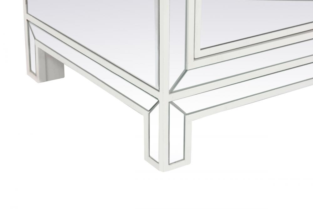 This TV stand is a showstopper with its clean white finish, clear mirror panels, and sparkling crystal knobs. It's a piece of furniture that adds a touch of glamour and sophistication to any room.
