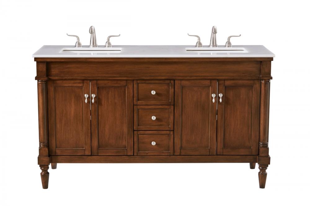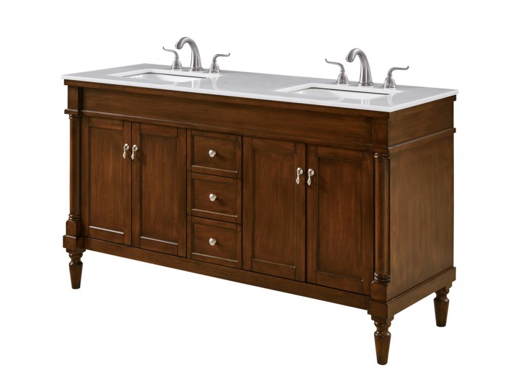 This traditionally styled, yet fashionably designed vanity can add distinction and grace to your home or office bathroom. Beautifully combining a lustrous natural white marble countertop with 2 large rectangular white porcelain under mount sink, and a hand painted walnut cabinet with 3 full extension drawers and 4 doors with shelf inside, brushed steel door pulls, standing on turned, tapering legs. You’ll enjoy its charming allure for many years to come. Measurements: W60” x D21” x H35”