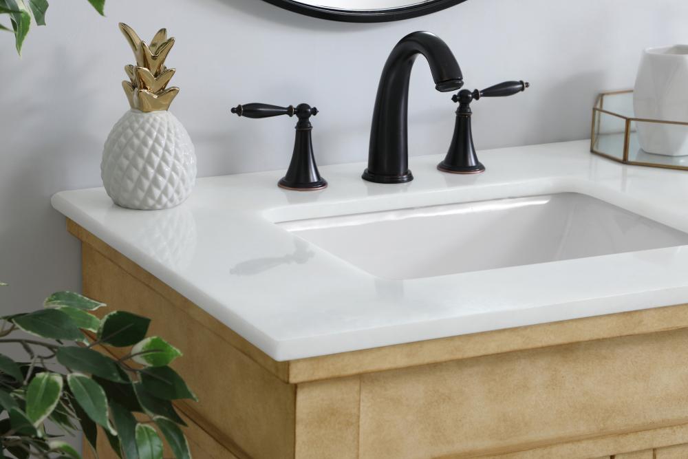 Designed with an ivory white engineered marble countertop with straight edge cut