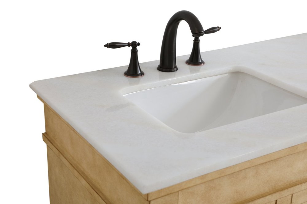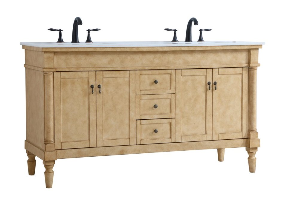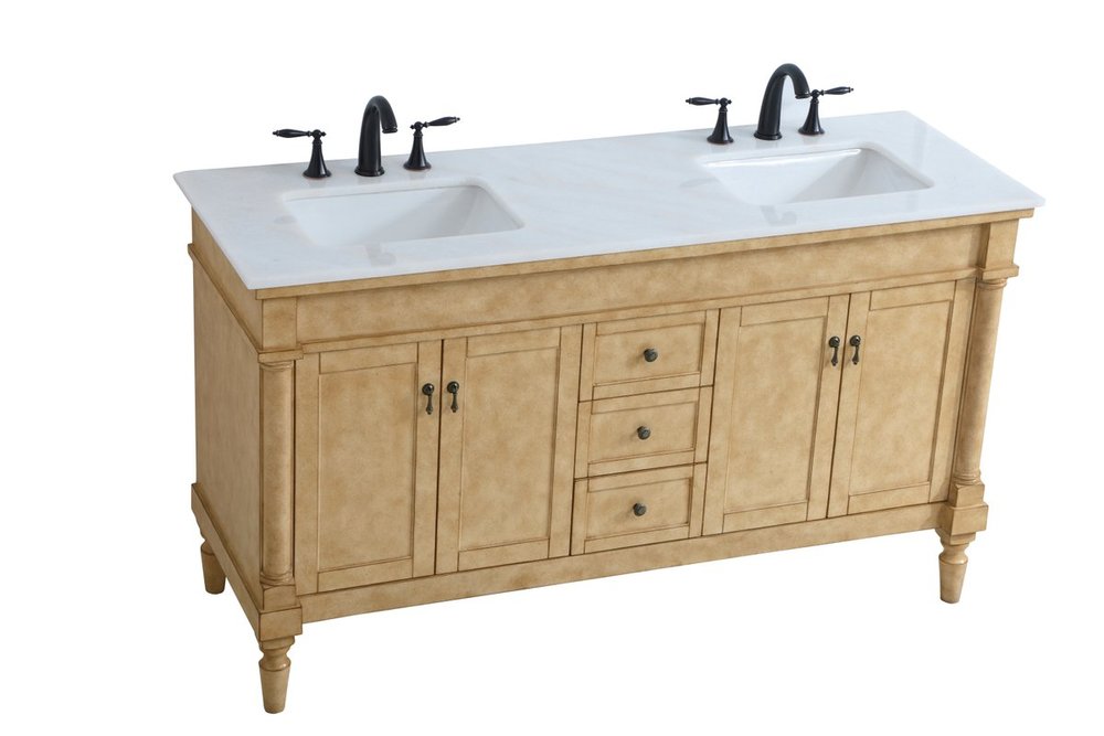 The subtle beauty of the Lexington collection 60" double sink vanity in an antique beige finish exudes comfortable luxury. Its modern, yet traditional beauty will surely dress up your bathroom or powder room without any fuss. The white marble countertop with occasional coffee color veins and porcelain undermount sinks show quiet opulence, and the legs support upright without fail. Antique bronze hardware complements the refined beige finish, with pulls adorning the four cabinet doors and ornate knobs dressing the three center drawers, showcasing ample storage space within. Plentiful countertop space makes it easy to get ready without bumping into the other person. Whether this vanity is in your bathroom or for guests, its presence will surely elevate the aesthetics of your room.