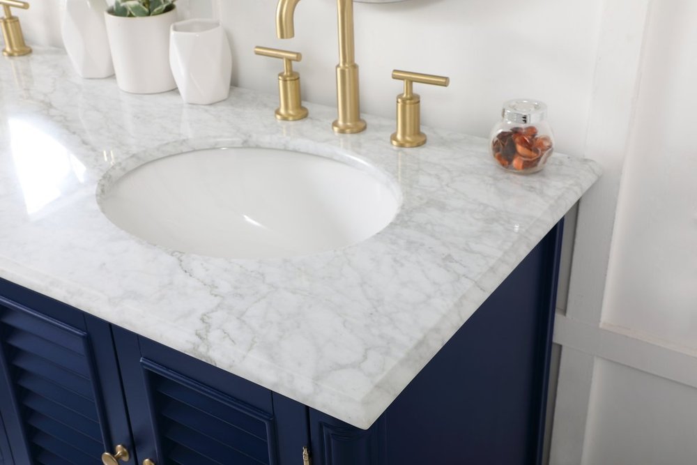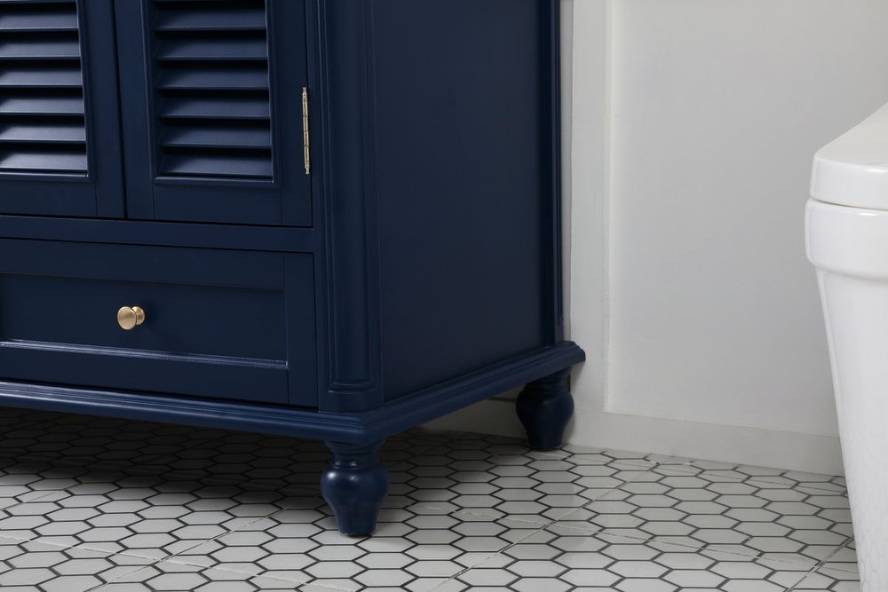 The Rhodes collection compact vanity will add lovely sophistication and complement any small bathroom or powder room, while utilizing its charm and function to provide you with ample storage spaces. Metal round knobs gently adorn the shuttered cabinet door and drawer at the base, allowing for you to store away your bathroom essentials. The Carrara white marble countertop, porcelain undermount sink, dignified subtle engravings on the side edges, and rounded legs all come together to create contemporary beauty. Work with your space, and design a beautiful room, no matter the size.