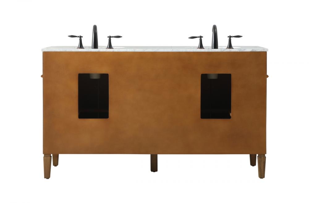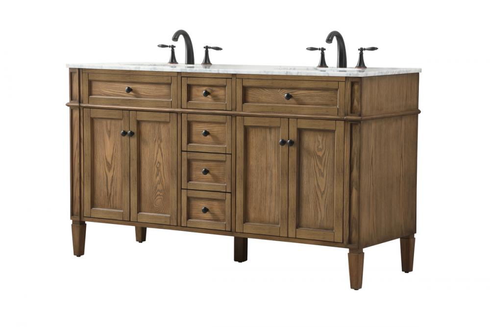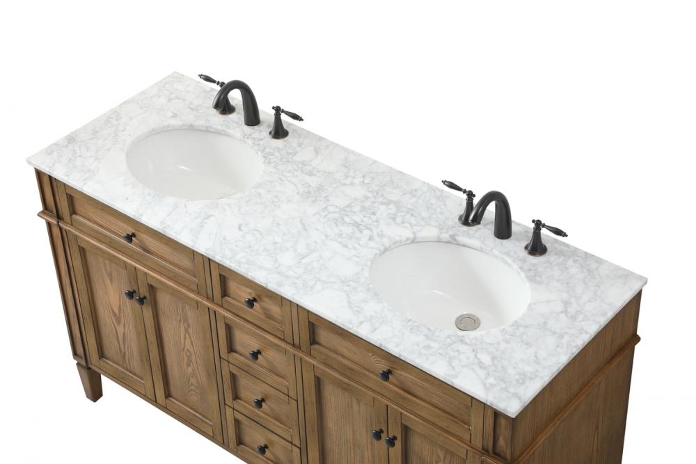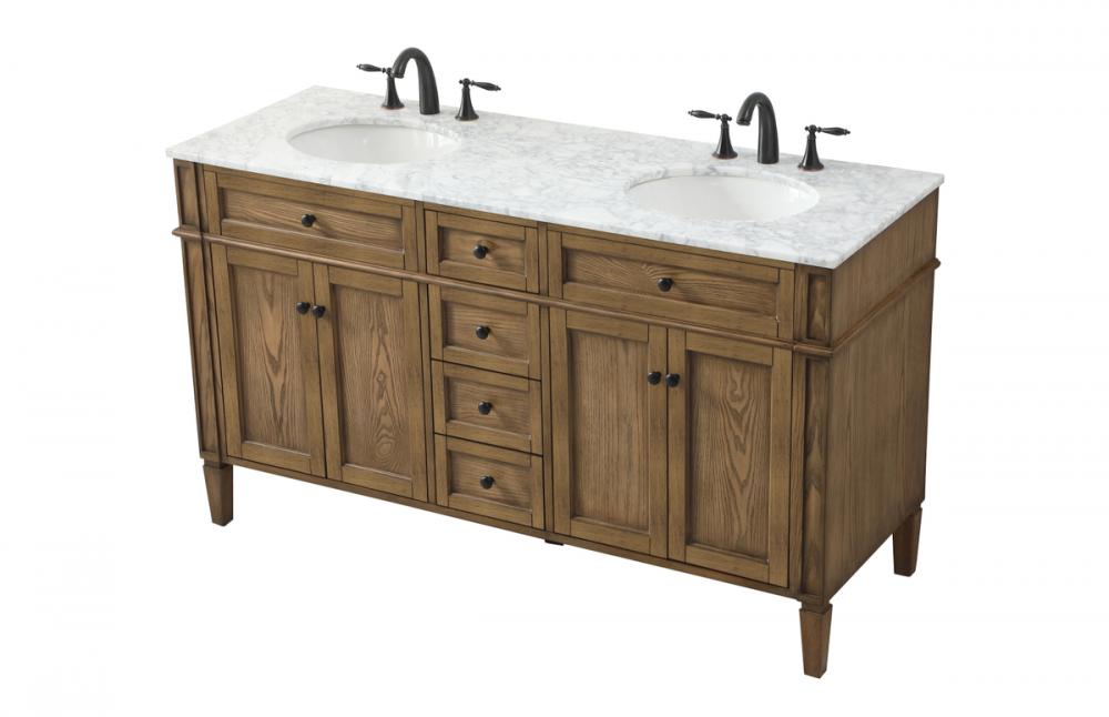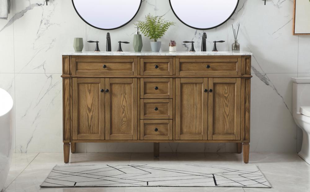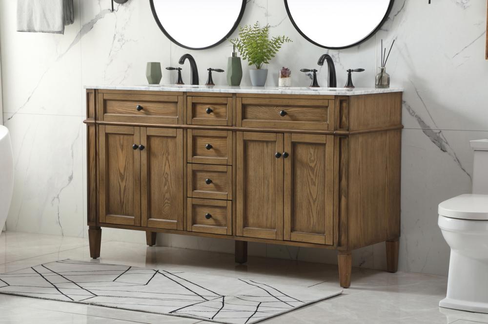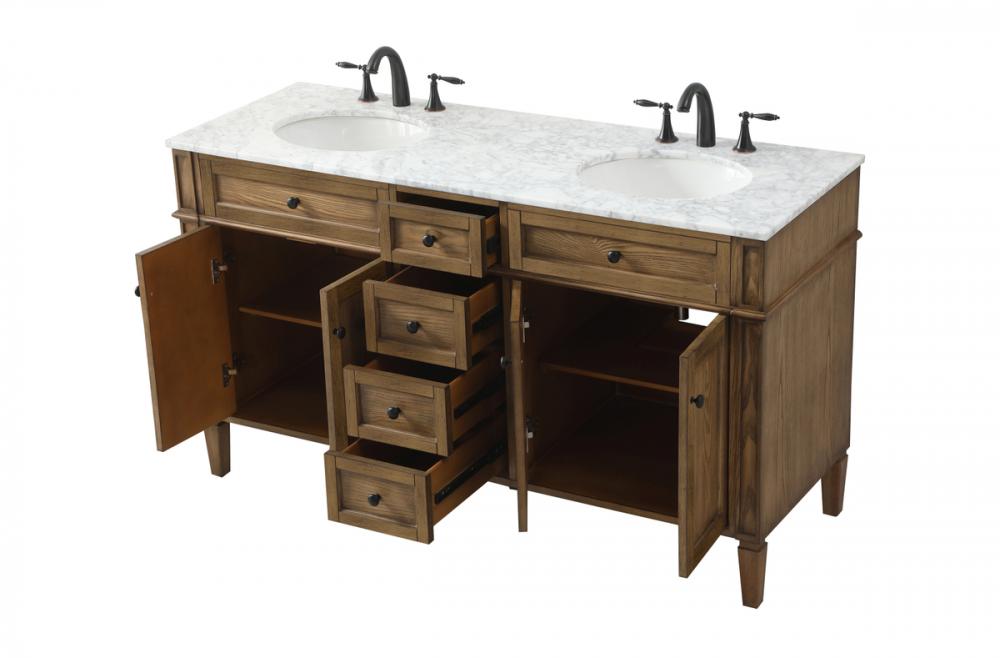 Comes with a double undermount porcelain sink and a carrara white marble countertop