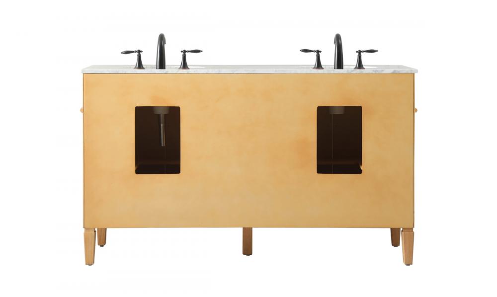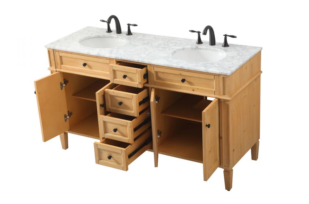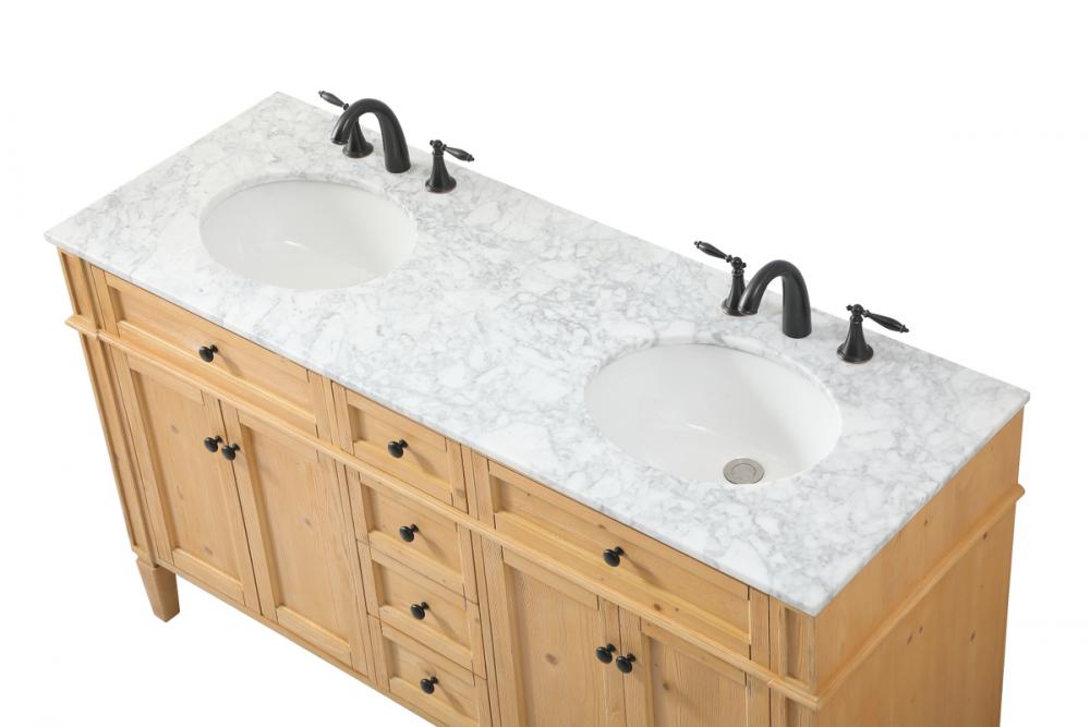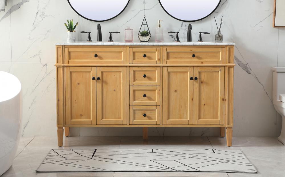 Comes with a double undermount porcelain sink and a carrara white marble countertop