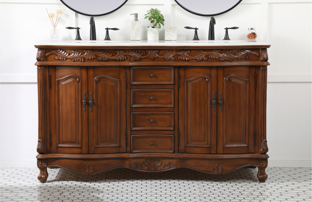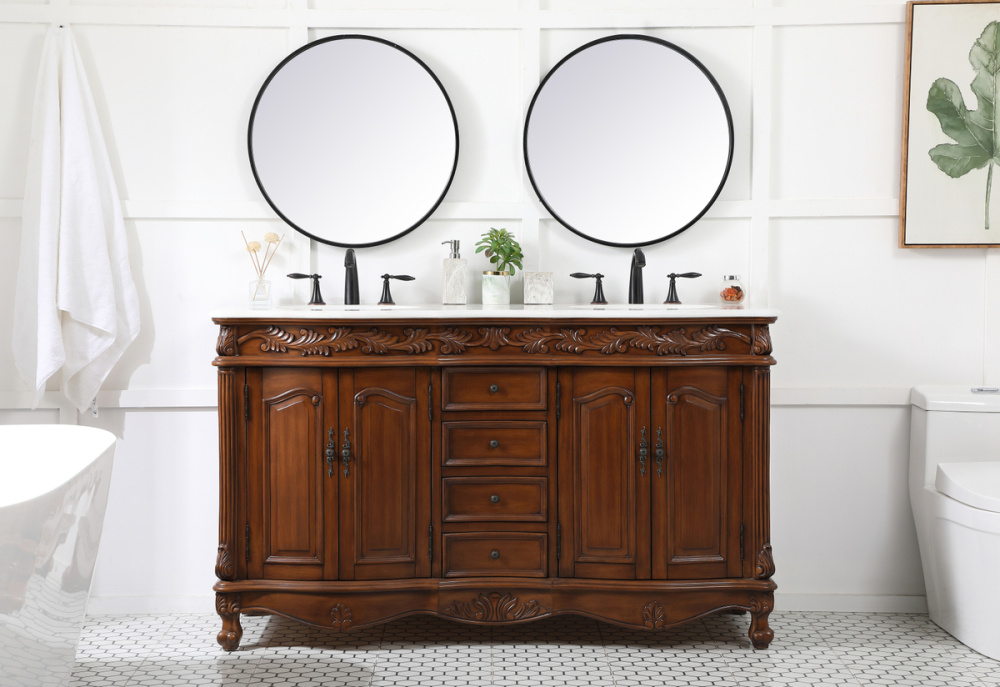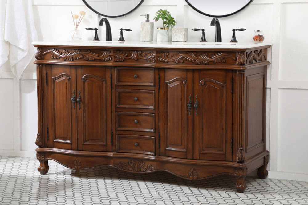 60 inch double Bathroom vanity in teak with ivory white engineered marble
