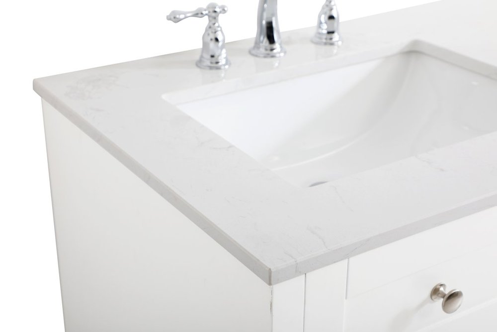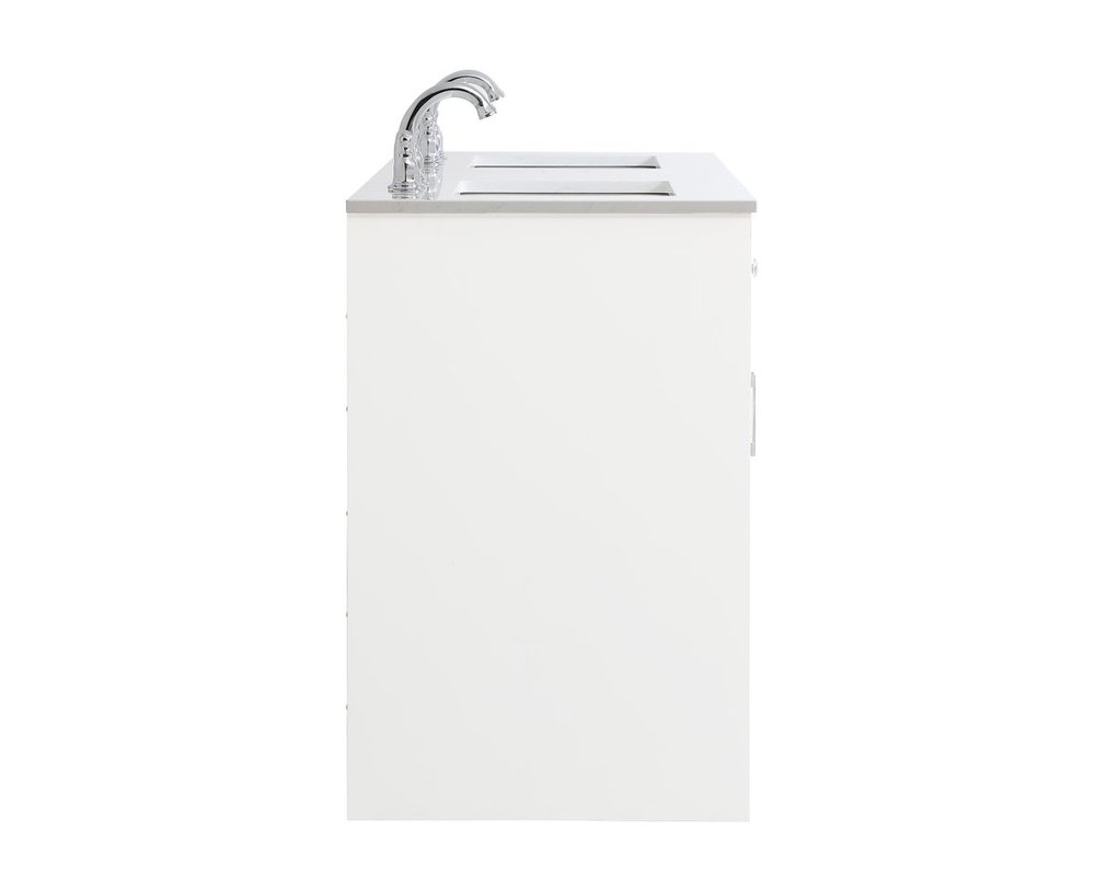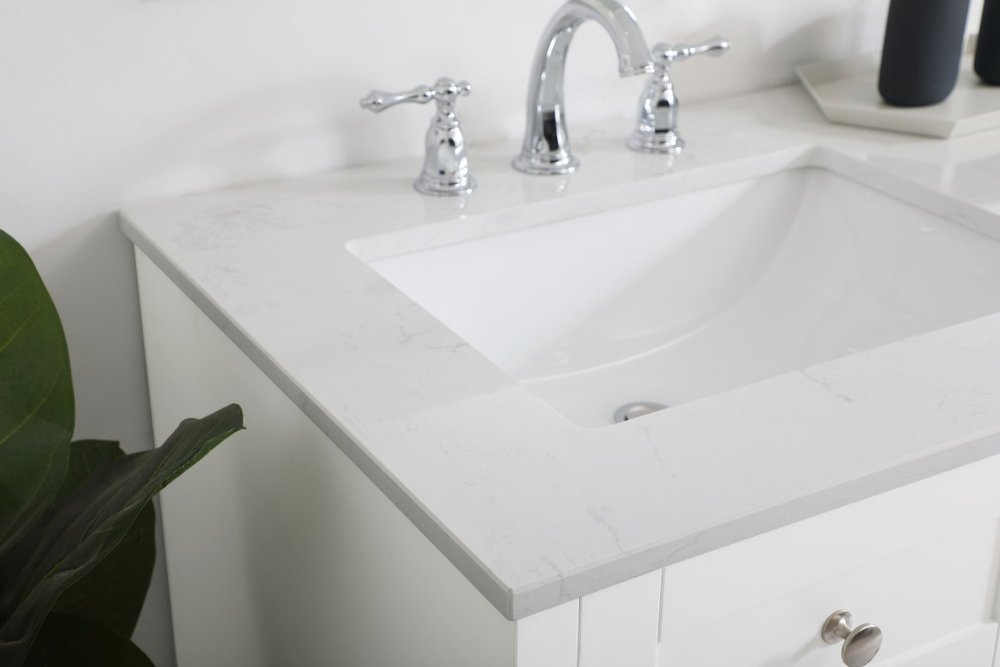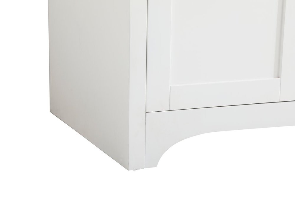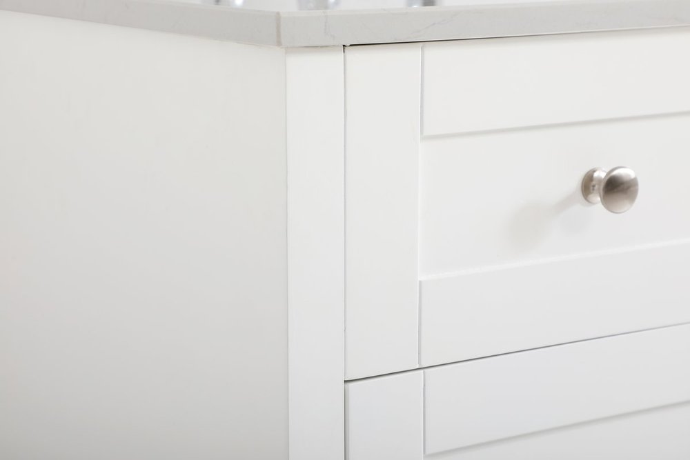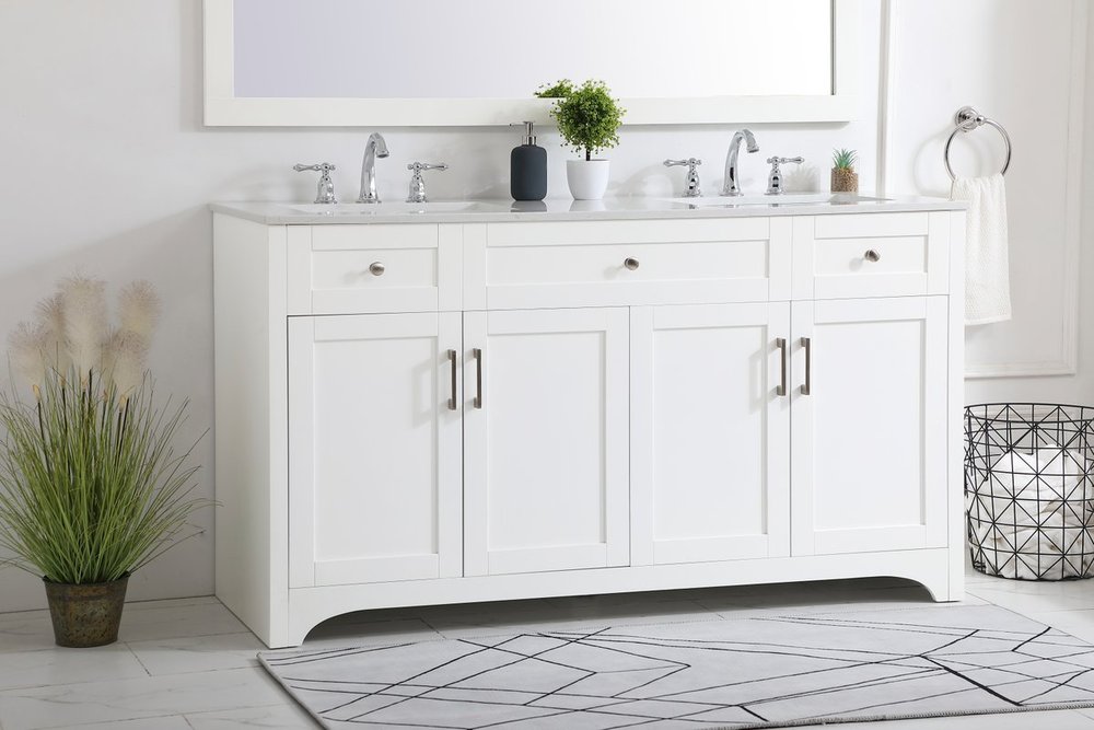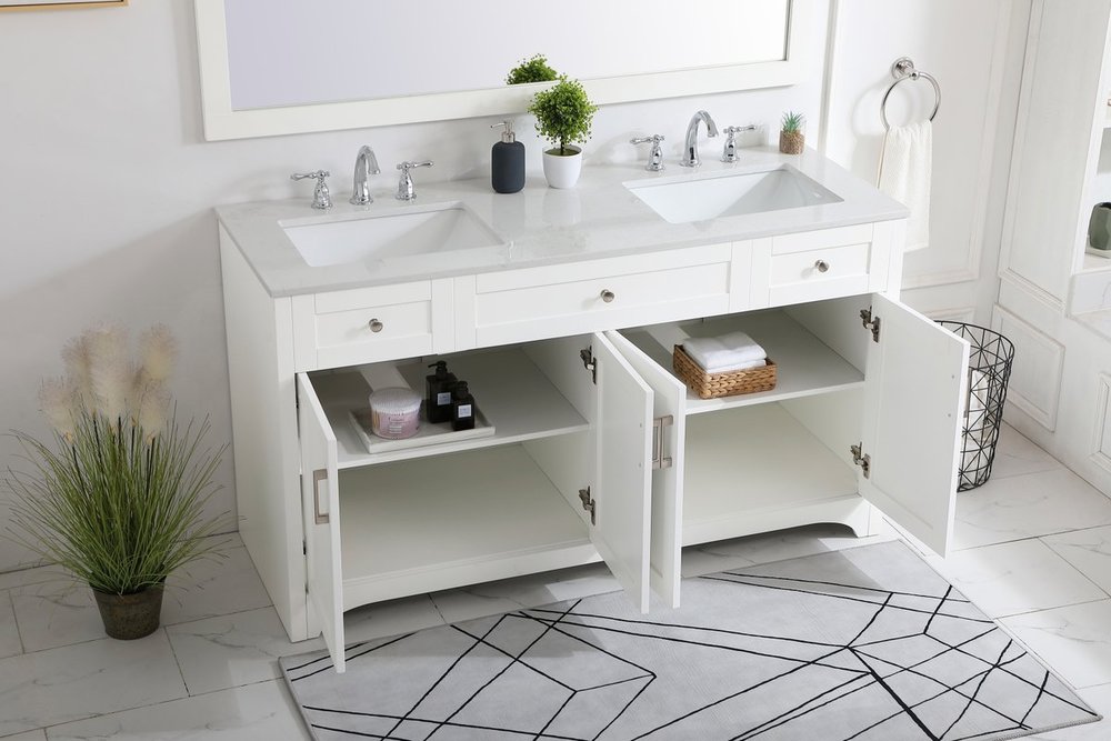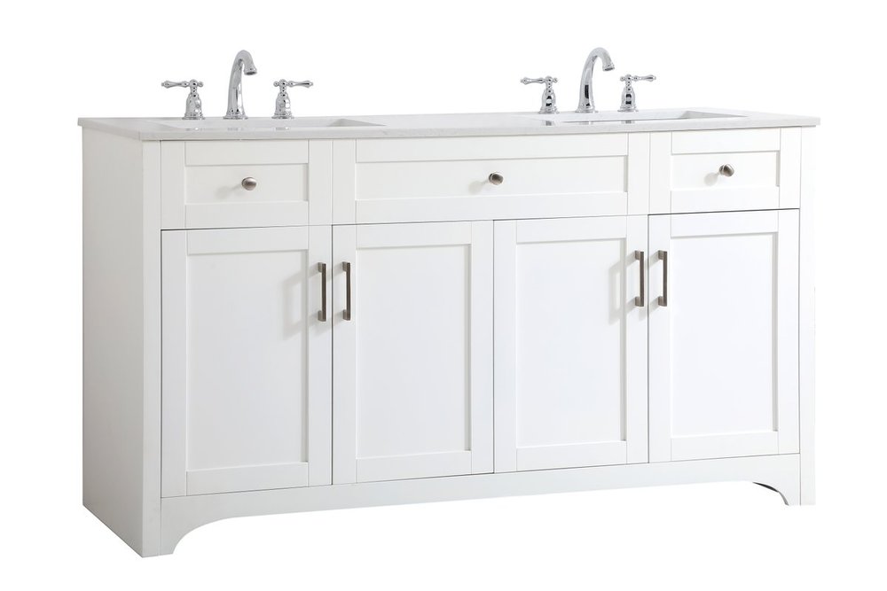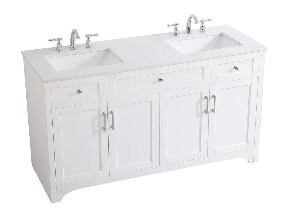 The refined simplicity of this 60" white finish vanity creates a peaceful, yet stylish, atmosphere. Its traditional modernity adds a mature beauty that will elevate any bathroom or powder room--the Calacatta engineered marble counter top with double porcelain sinks add refined luxe while the brushed nickel handle bars open the 4 cabinet doors, revealing ample storage space to store and hide away an assortment of bathroom essentials. Whether your home is large or small, this vanity will surely fit in well.