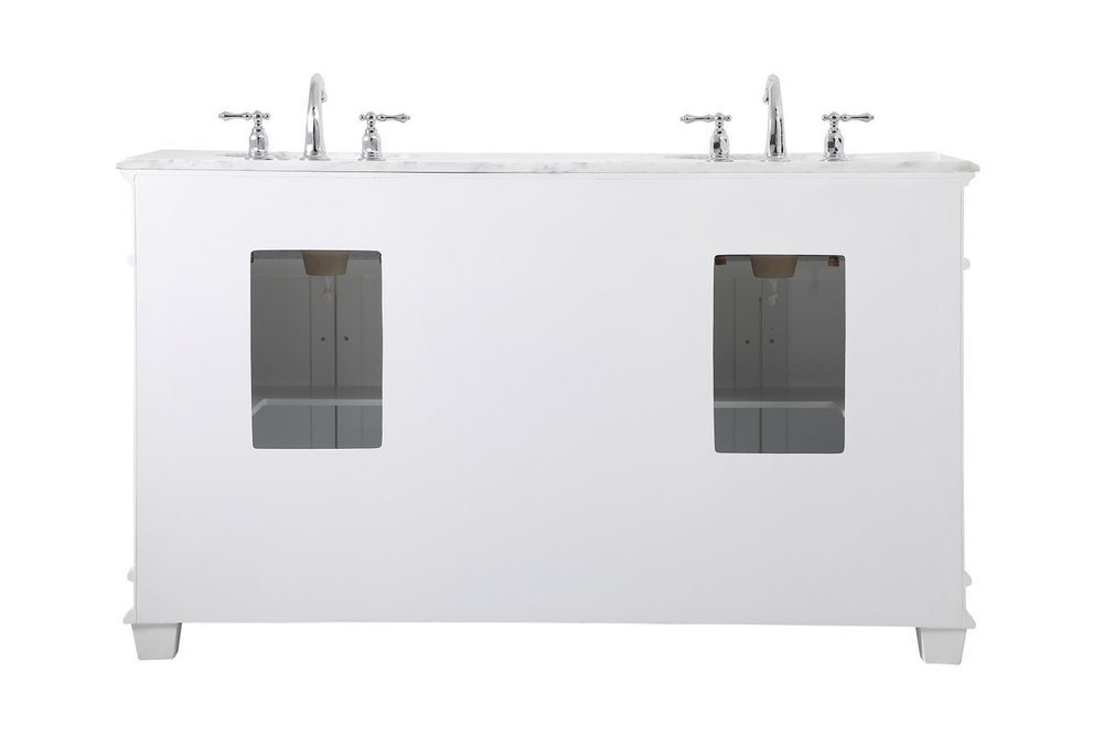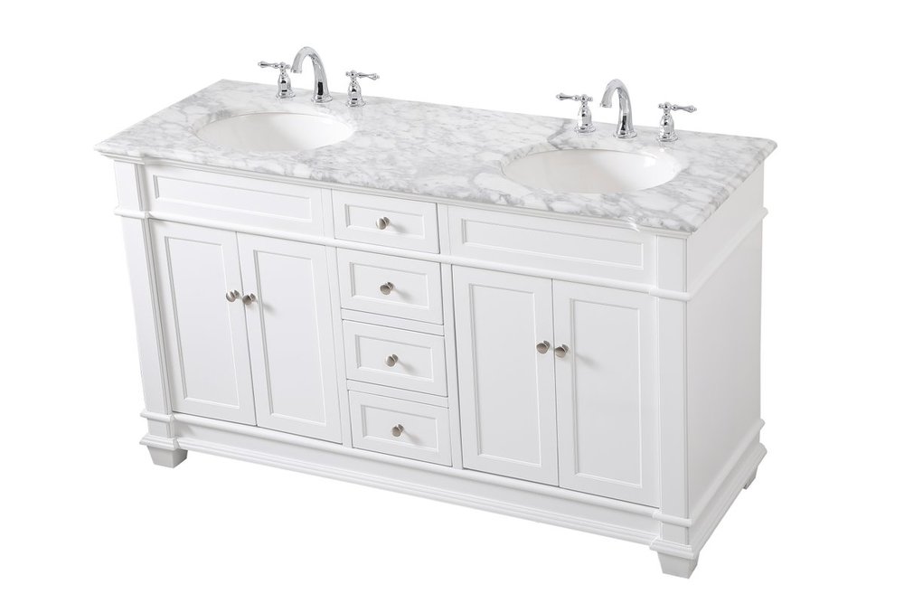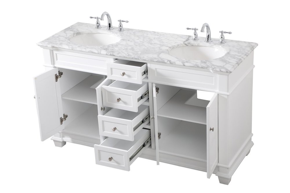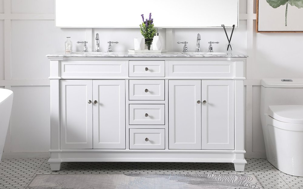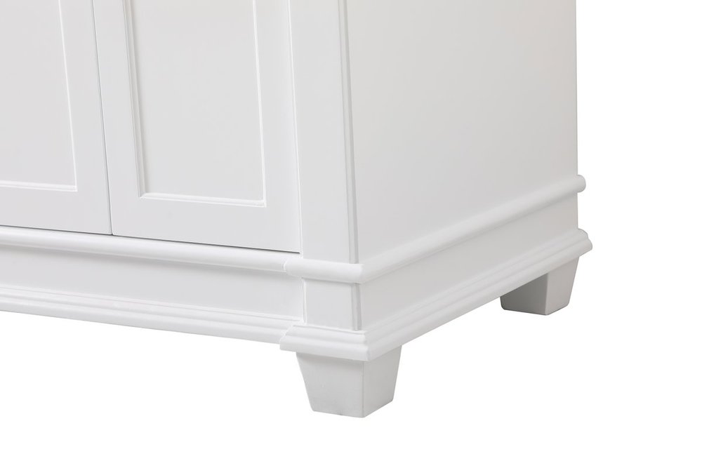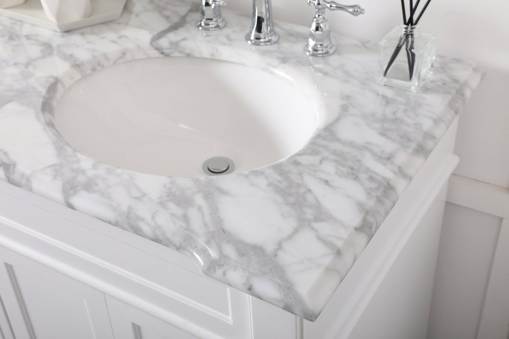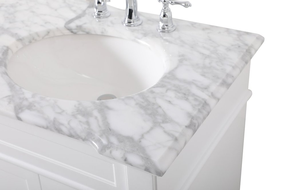 The Wesley Collection vanity cabinet will bring a settle pop of color into your bathroom. The white finish is a sophisticated color which creates a calming atmosphere in the room. The brushed nickel knobs bring a vibrant touch to balance the vanity. With the detailed engravings, the cabinet catches eyes with its beautiful lining work. Open the cabinet doors to store what you desire and make use of the spacious area. To top it off, the Carrara white marble adds a luxury and modern finish to the countertop.