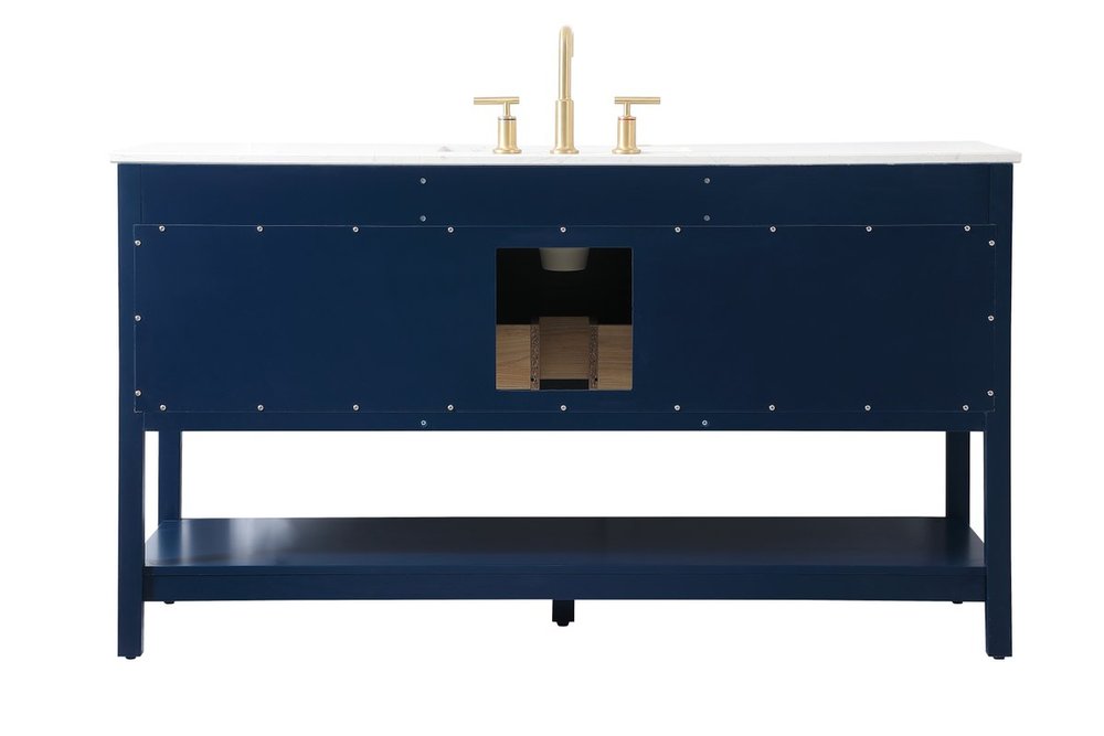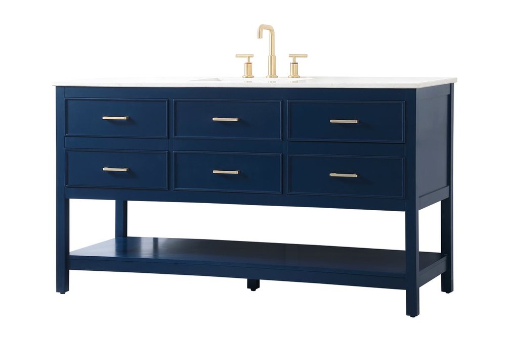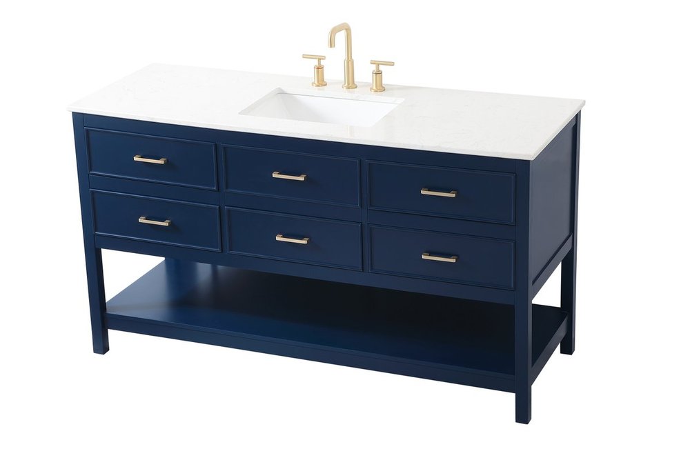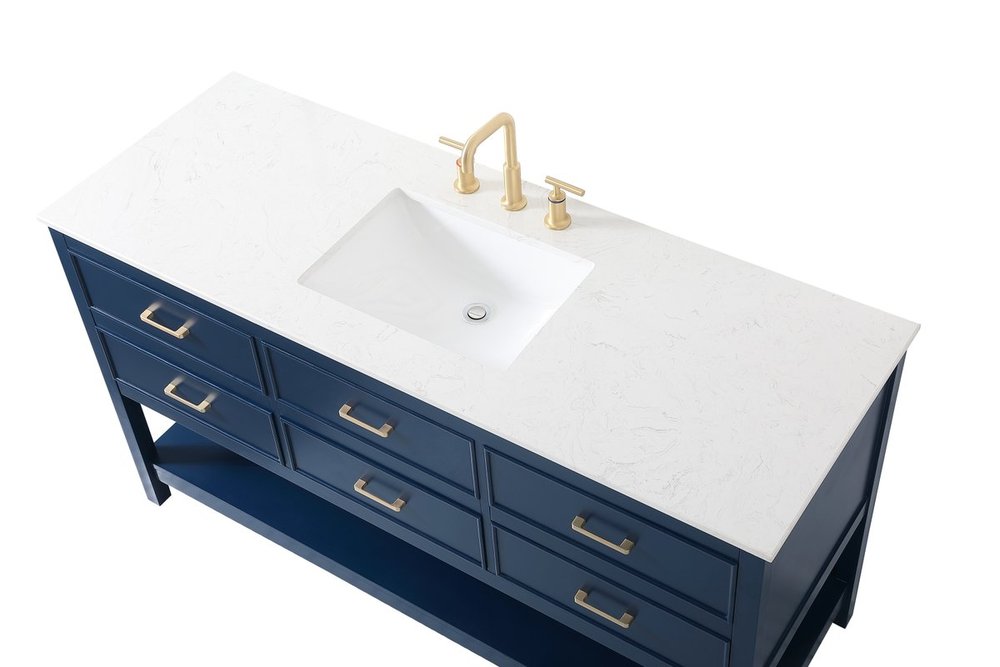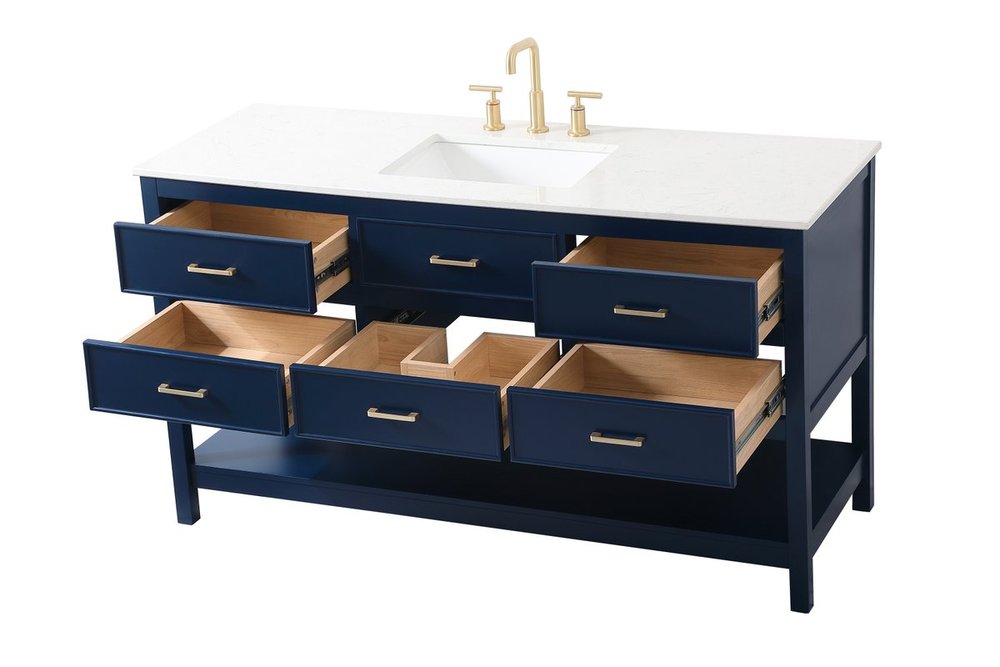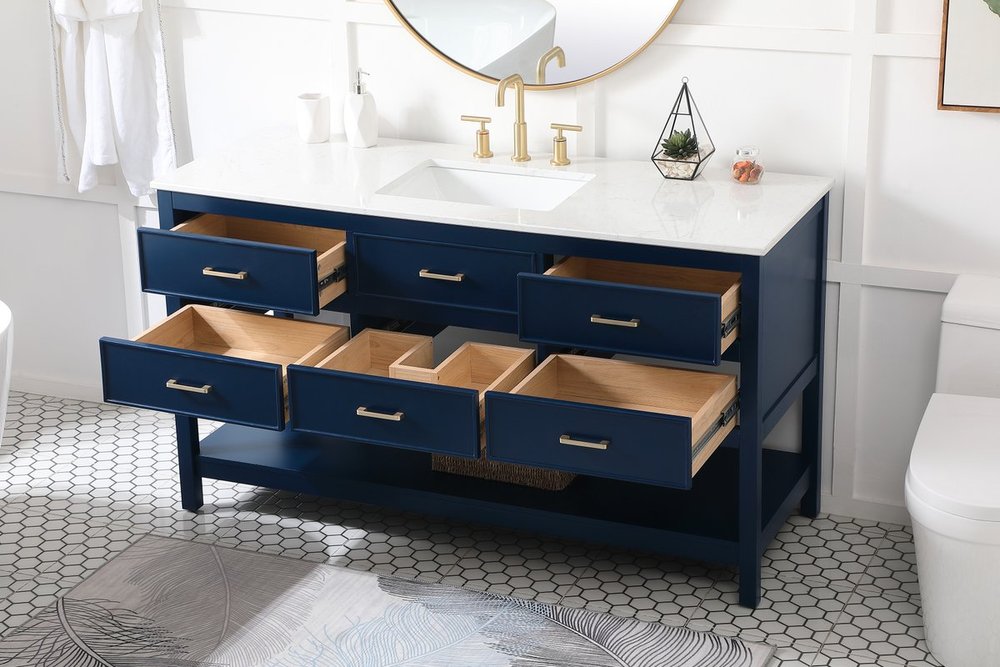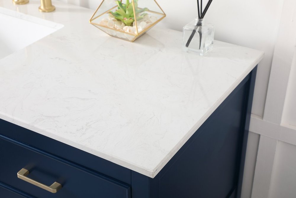 Make the most of your space with this traditional style bathroom vanity. Complements well with many aesthetics with its beautiful finish, calacatta engineered marble countertop, and the contemporary slender handle bar that sits on six functional drawers with soft closing mechanism, allowing you to store an assortment of bathroom essentials. The lower shelf makes it the perfect space to hold new towels for your guests. This compact vanity ensures both form and function in your bathroom or powder room for you and your guests.
