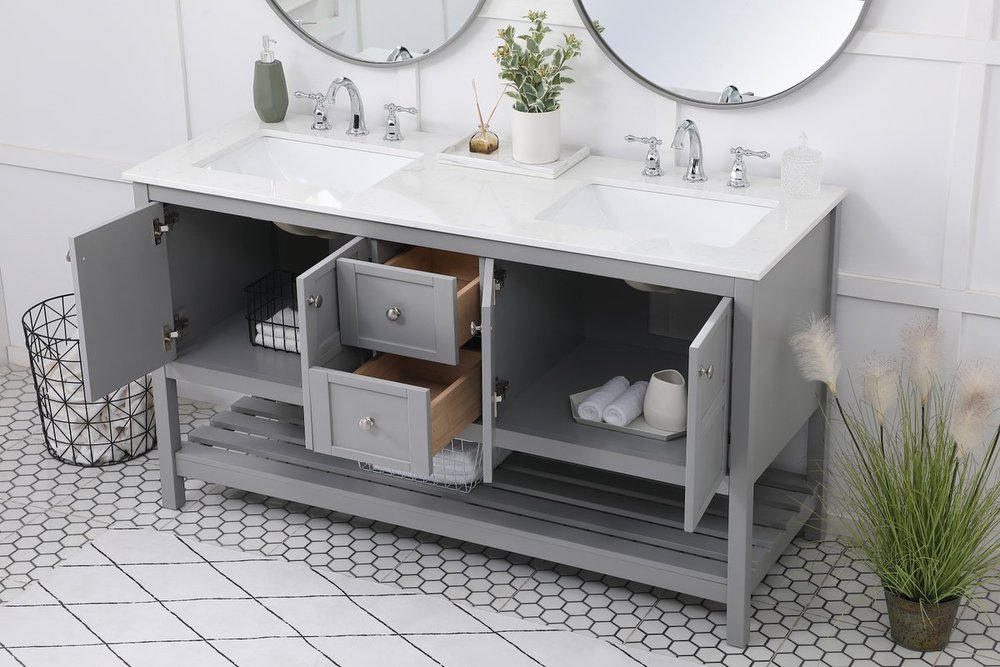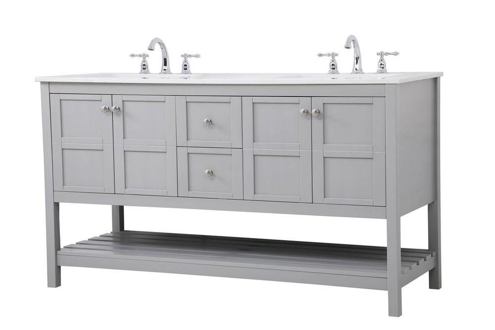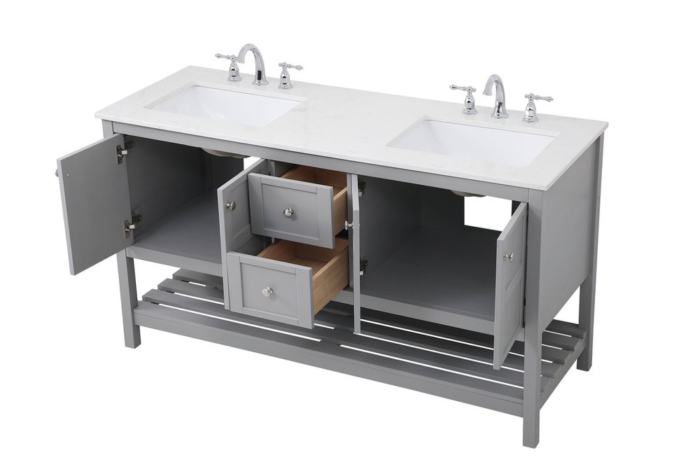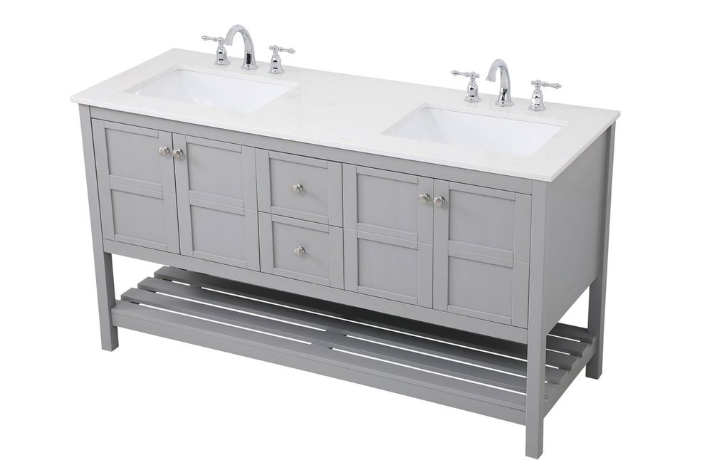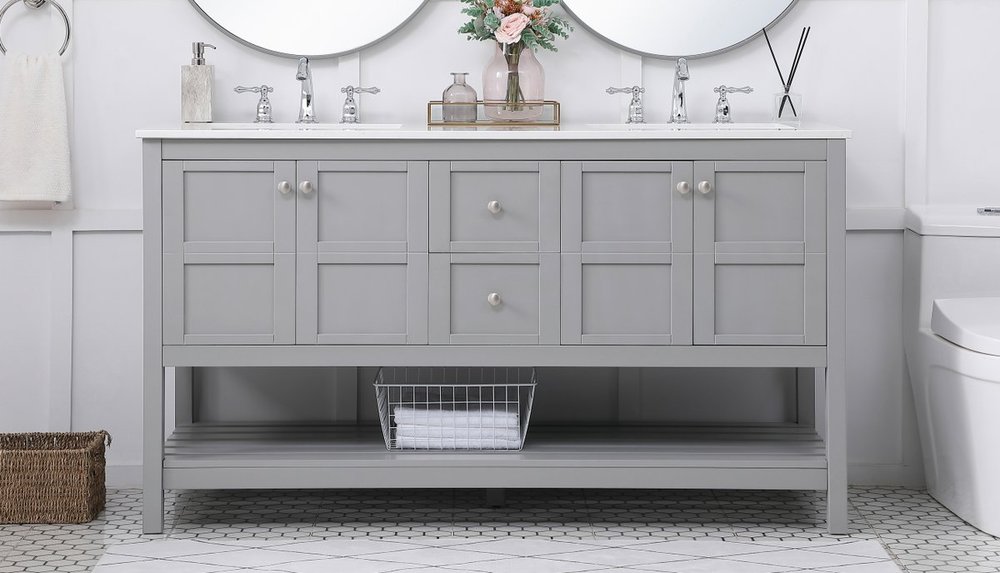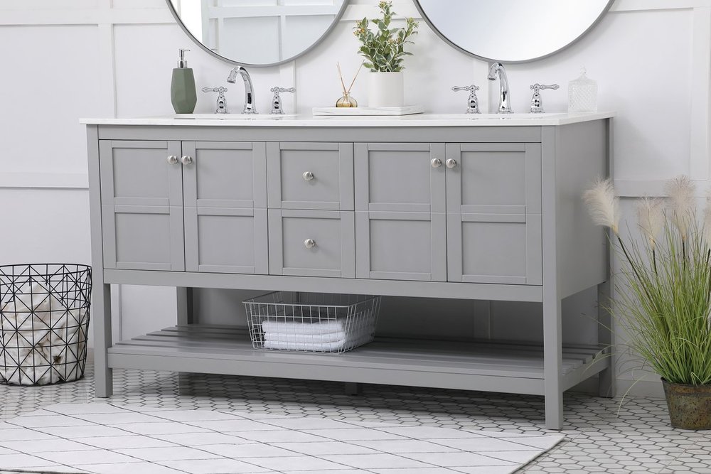 The subtle beauty of the Theo collection 60" vanity in a gray finish exudes comfortable luxury. Its modern, yet traditional beauty will surely dress up your bathroom or powder room without any fuss. The white stone countertop and porcelain undermount sink shows quiet opulence, and the legs support upright without fail. Brushed Nickel hardware complements the trendy gray finish, with pulls adorning the four cabinet doors and two drawers, showcasing ample storage space within. Slated shelf allows for additional space to organize your towels. Whether this vanity is in your bathroom or for guests, its presence will surely elevate the aesthetics of your room.