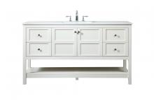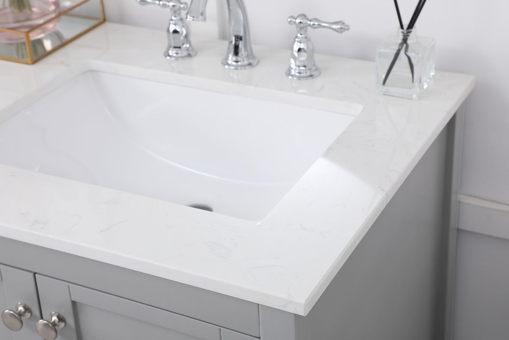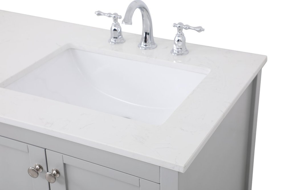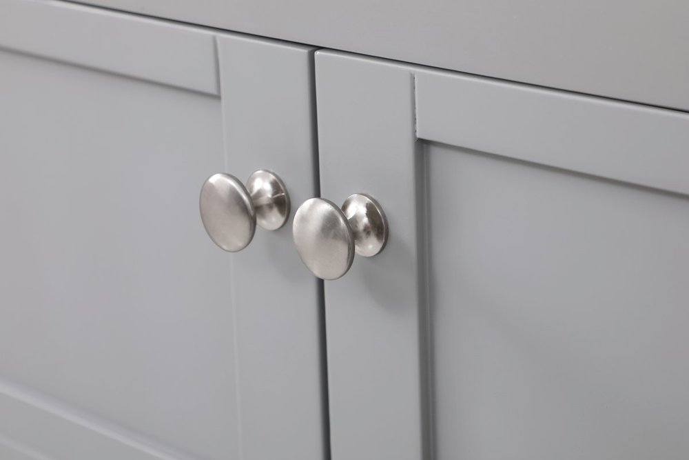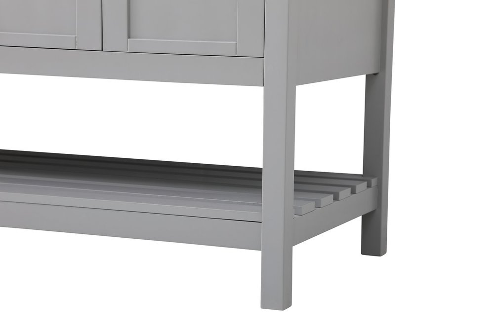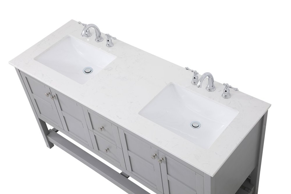 The subtle beauty of the Theo collection 60" vanity in a gray finish exudes comfortable luxury. Its modern, yet traditional beauty will surely dress up your bathroom or powder room without any fuss. The white stone countertop and porcelain undermount sink shows quiet opulence, and the legs support upright without fail. Brushed Nickel hardware complements the trendy gray finish, with pulls adorning the four cabinet doors and two drawers, showcasing ample storage space within. Slated shelf allows for additional space to organize your towels. Whether this vanity is in your bathroom or for guests, its presence will surely elevate the aesthetics of your room.