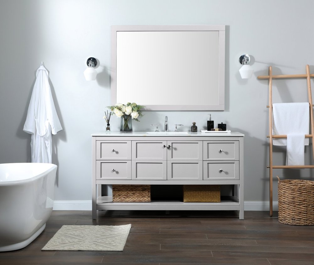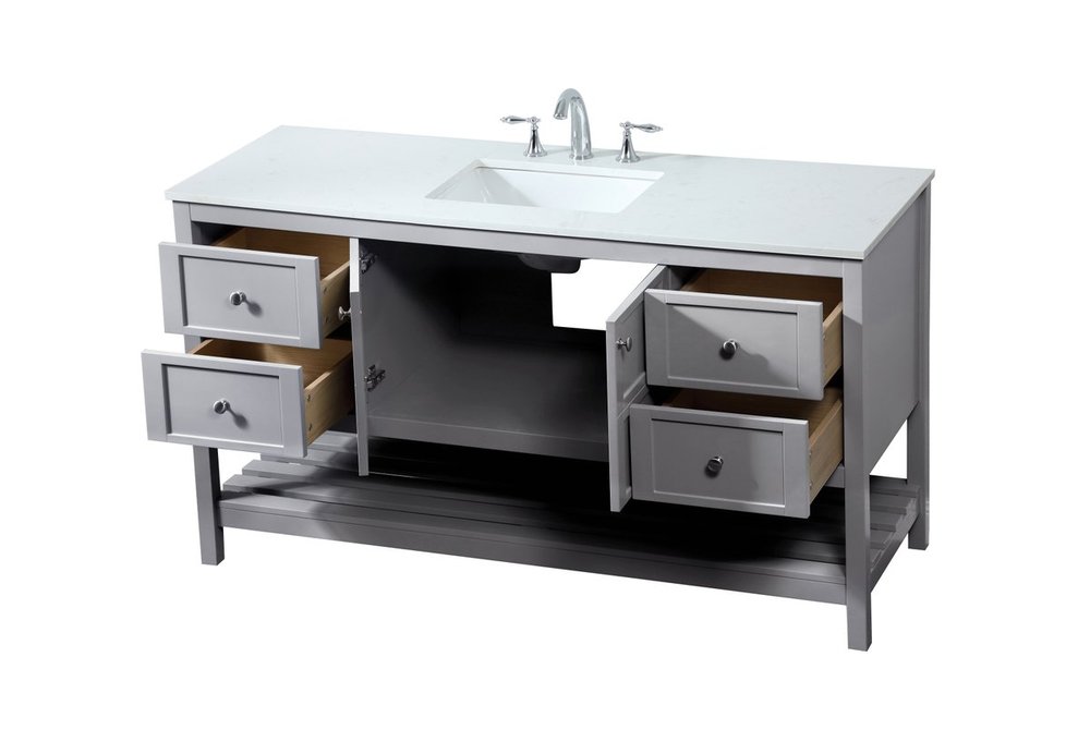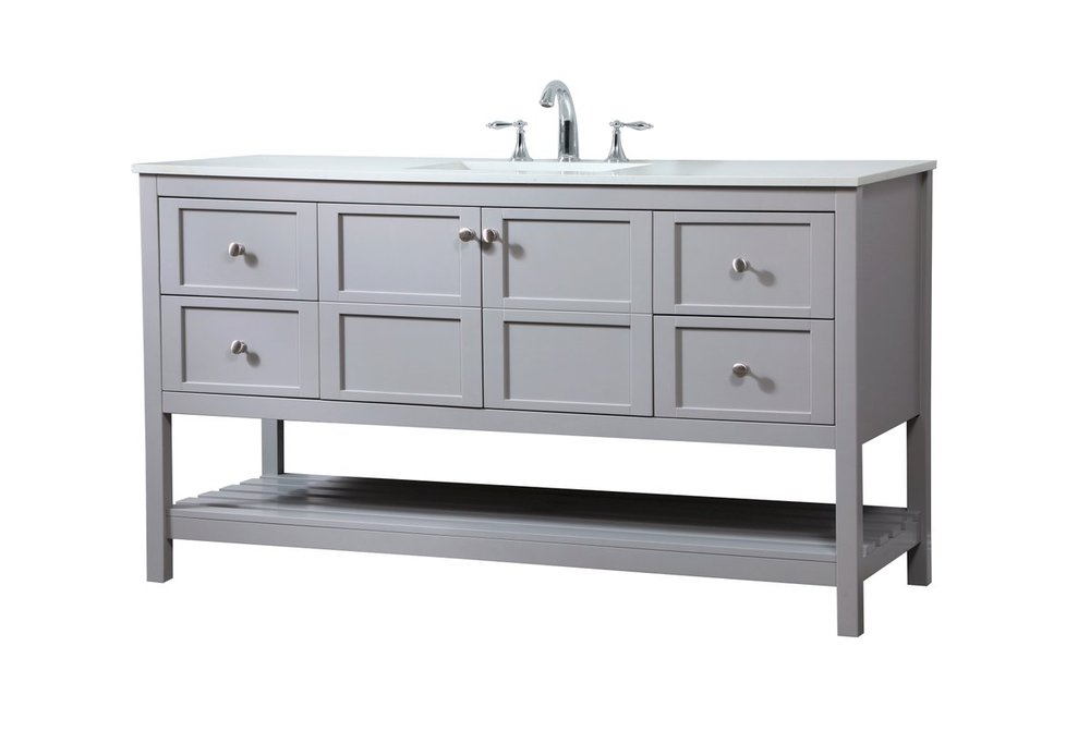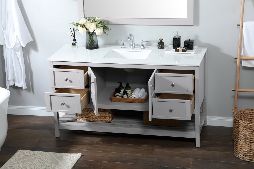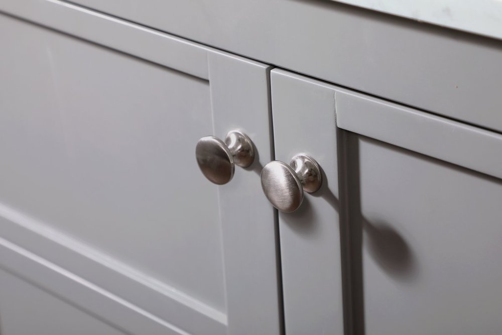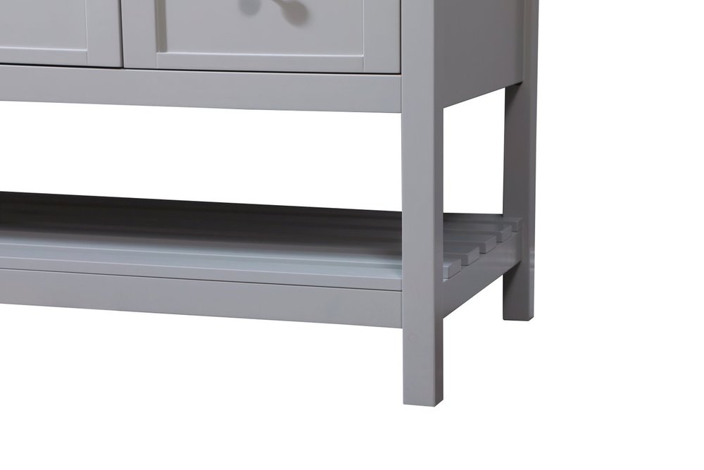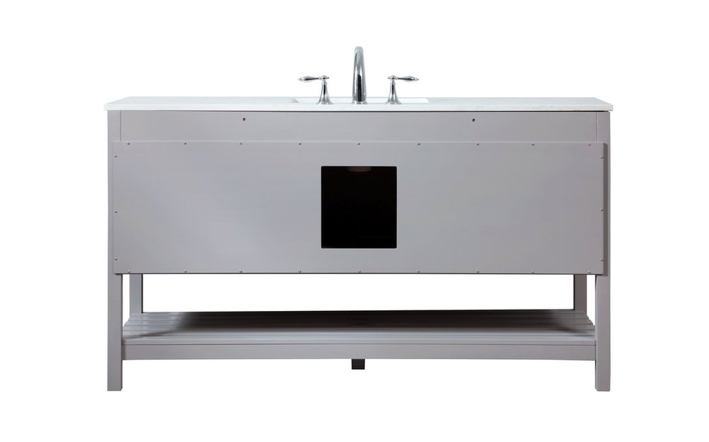 The subtle beauty of the Theo collection vanity exudes comfortable luxury. Its modern, yet traditional beauty will surely dress up your bathroom or powder room without any fuss. The calacatta engineered marble countertop and porcelain undermount sink shows quiet opulence, and the legs support upright without fail. Brushed nickel hardware complements the trendy gray finish, with pulls adorning the two cabinet doors, showcasing ample storage space within. Slated shelf allows for additional space to organize your towels. Whether this vanity is in your bathroom or for guests, its presence will surely elevate the aesthetics of your room.