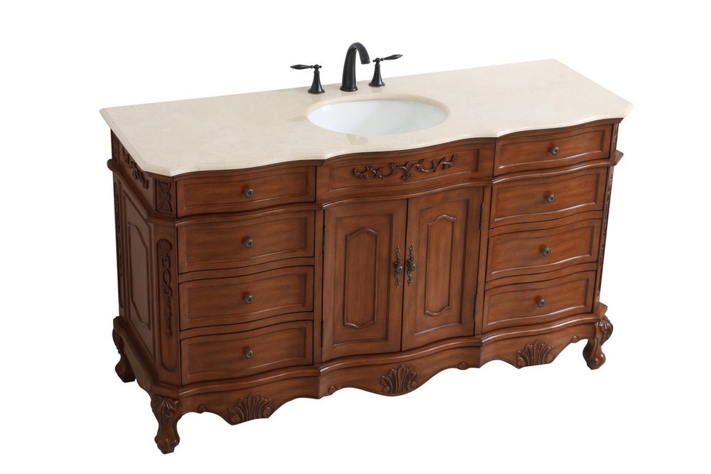 The Danville collection 60" vanity in a teak finish brings about traditional beauty. Decorated with ornate filigrees and engravings throughout, your bathroom or powder room will exude refined beauty. Don't let the design fool you, the cream marble countertop and porcelain undermount sink allows for ample space to get ready, while the antique bronze hardware allows you to discover storage spaces with ease. The simple knobs allows you to glide the 8 side drawers out, while the ornate knobs help you open the two center cabinet doors. You and your guests will marvel at this vanity that will both store away your bathroom essentials and enhance the aesthetics of your room.