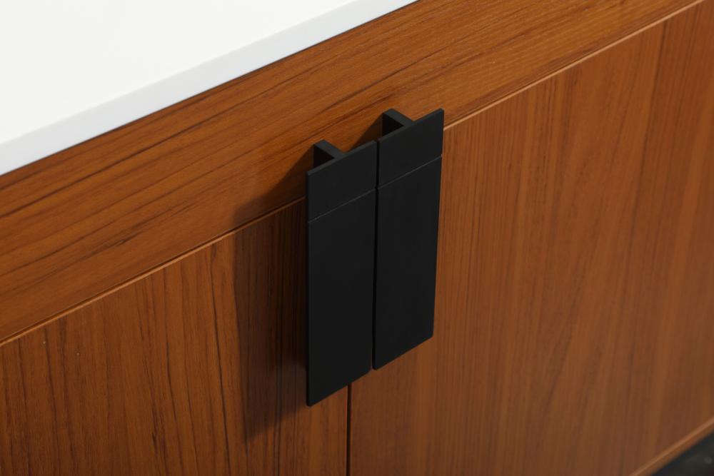 Oversized modern handles accentuates the smooth mdf wood base