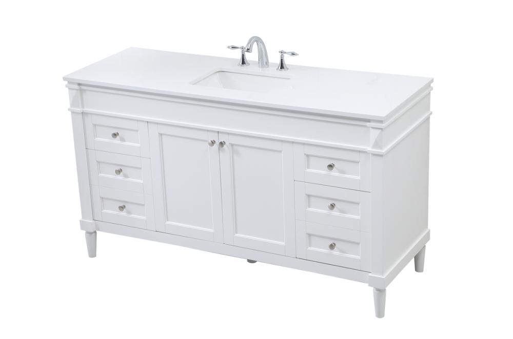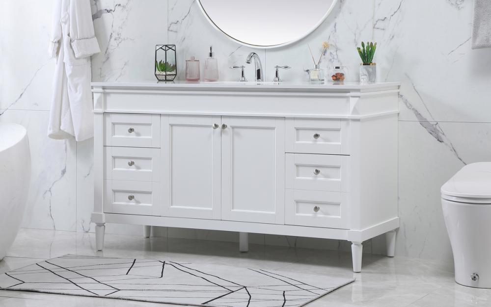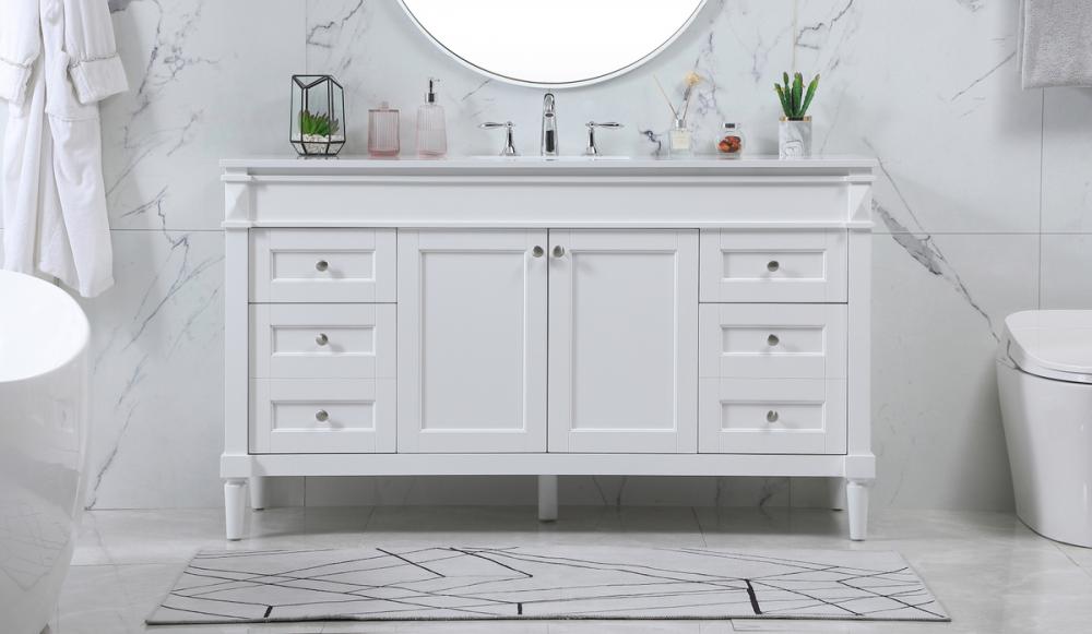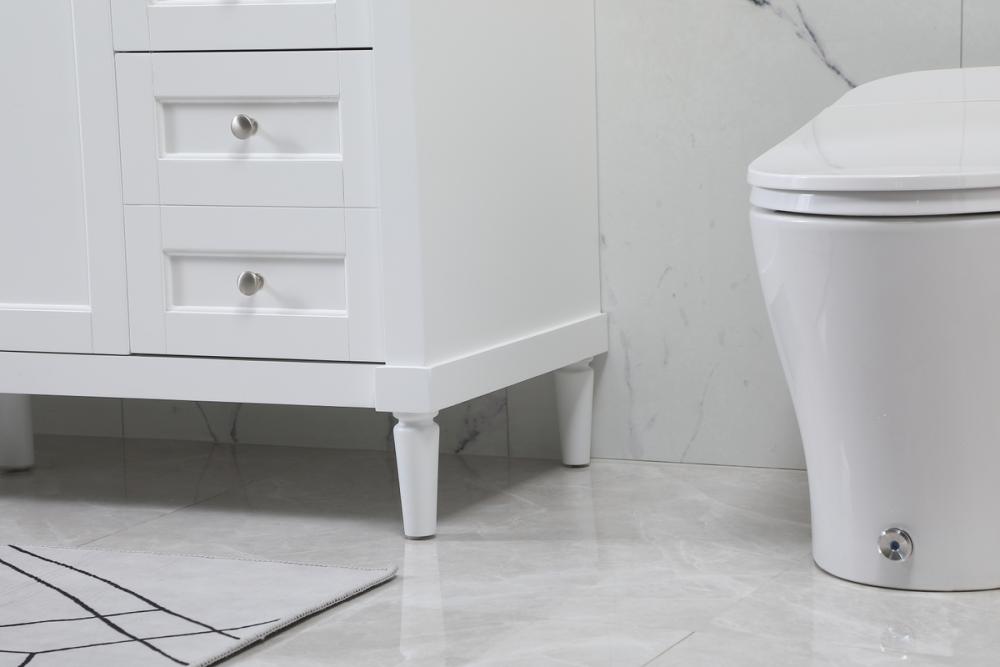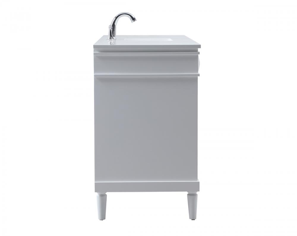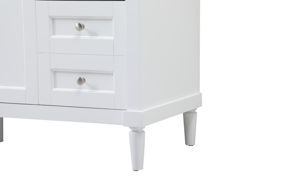 This transitional vanity is a beautiful piece of bathroom furniture will look amazing in your design scheme. The cabinet features a shaker style smooth door panel with simple round knobs and soft close hinges provide ample room for accessories. Packed with multiple side drawers with soft close glides for added comfort and full access to bath supplies. Convenient deep drawer stores all of your tall bath essentials. Constructed of engineered wood and solid wood legs with hand painted finish. The durable engineered marble countertop is a versatile material in an ivory white finish. Minor assembly of the legs needed to get this vanity up and running.