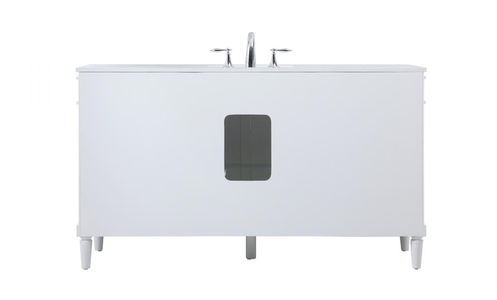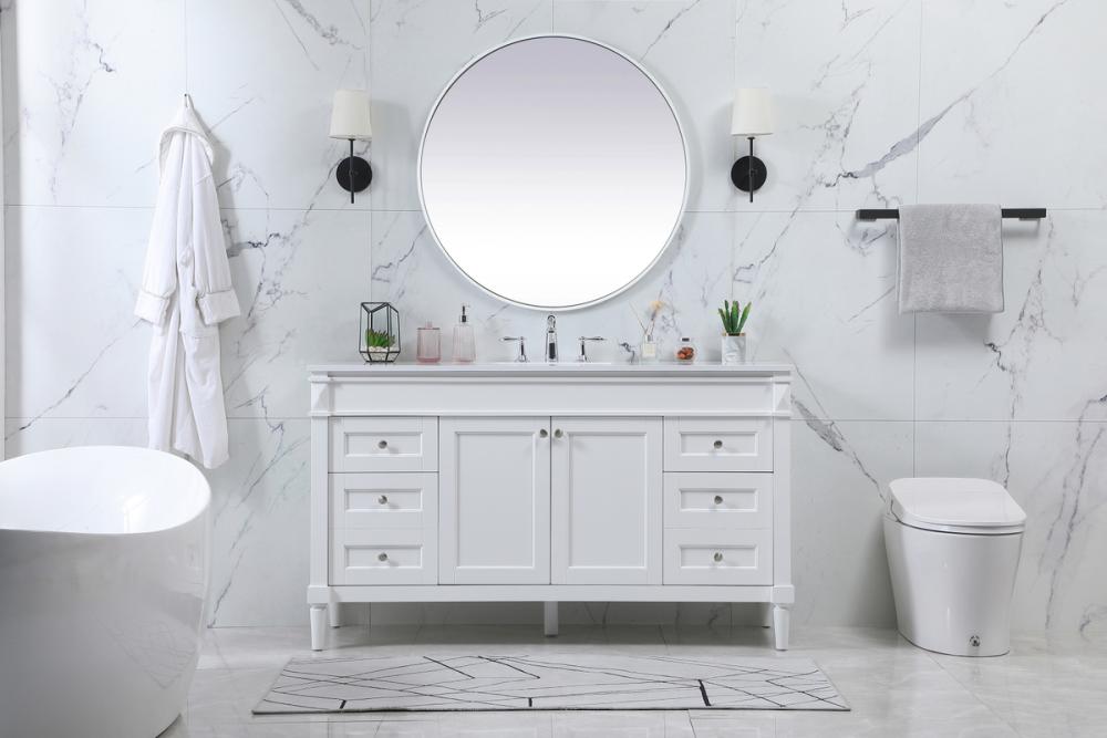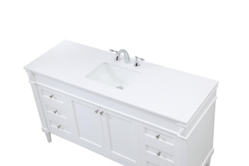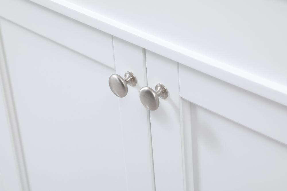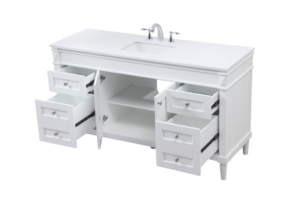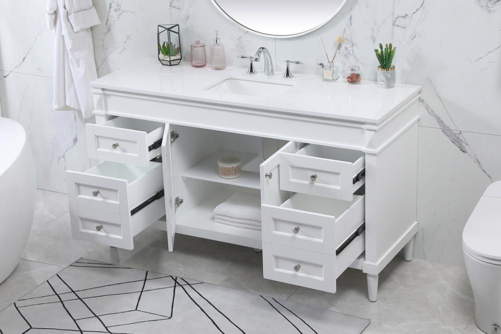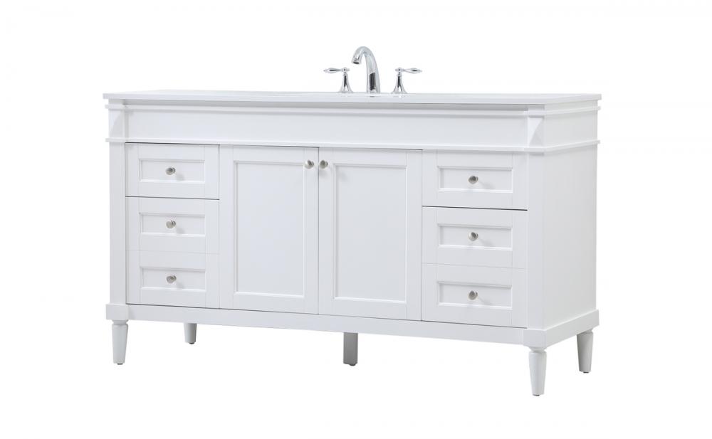 This transitional vanity is a beautiful piece of bathroom furniture will look amazing in your design scheme. The cabinet features a shaker style smooth door panel with simple round knobs and soft close hinges provide ample room for accessories. Packed with multiple side drawers with soft close glides for added comfort and full access to bath supplies. Convenient deep drawer stores all of your tall bath essentials. Constructed of engineered wood and solid wood legs with hand painted finish. The durable engineered marble countertop is a versatile material in an ivory white finish. Minor assembly of the legs needed to get this vanity up and running.