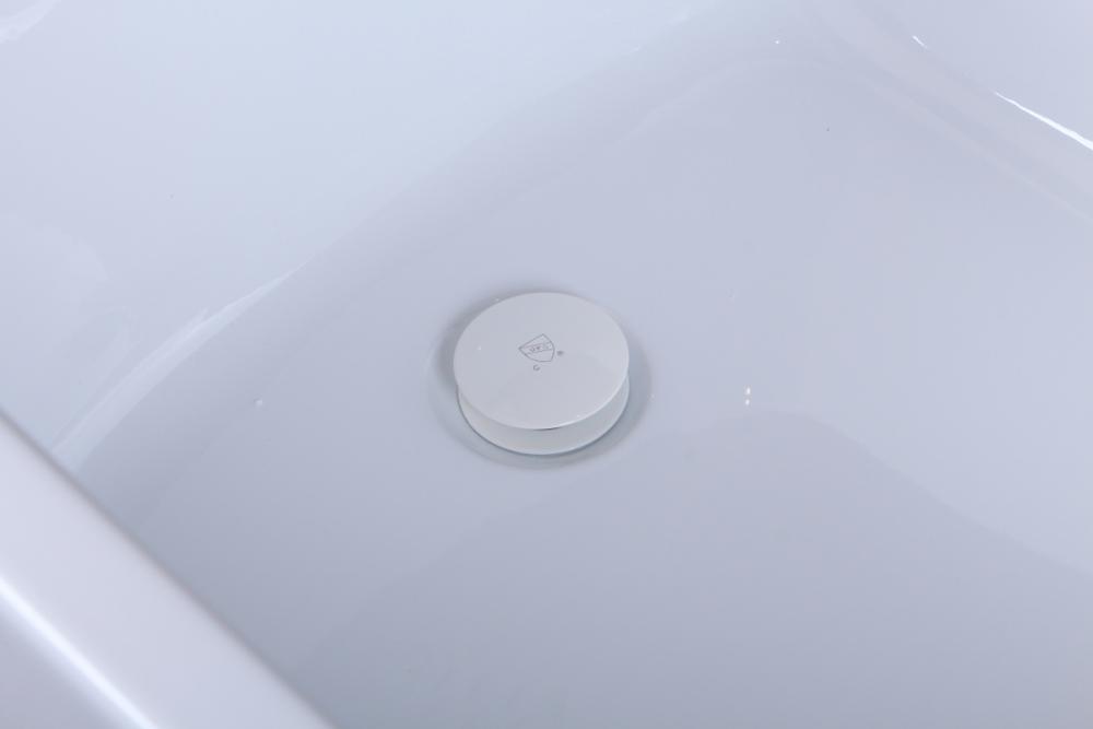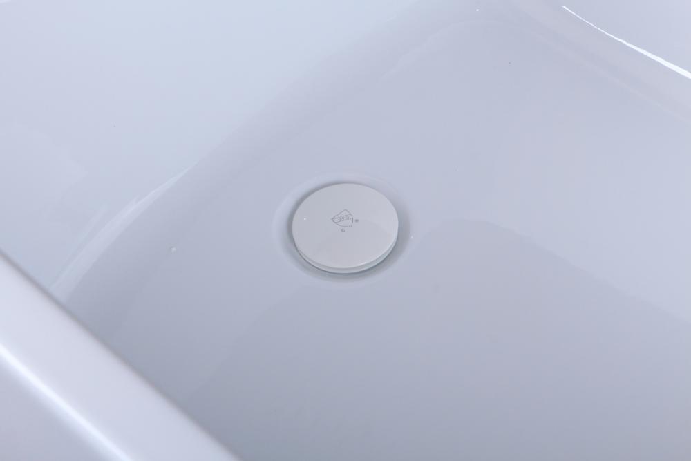 The all-white drain trim seamlessly blends with the bathtub's design, maintaining its modern look while providing efficient drainage through the flexible 35 inch long drain pipe.