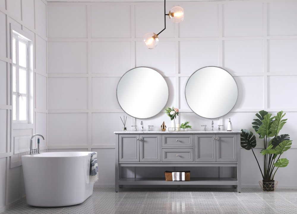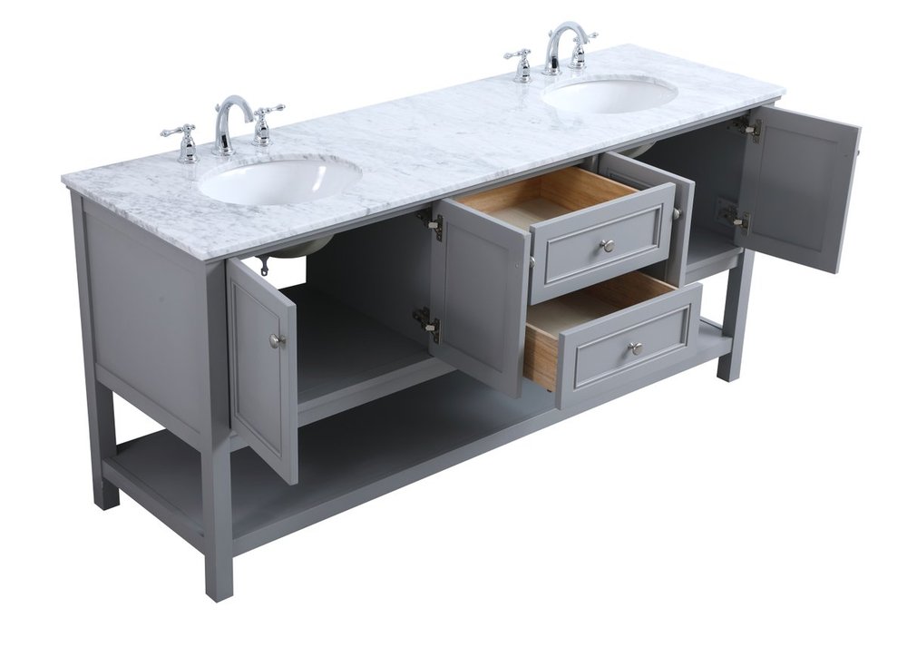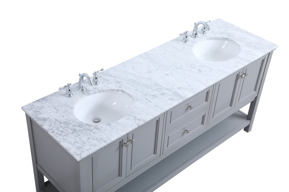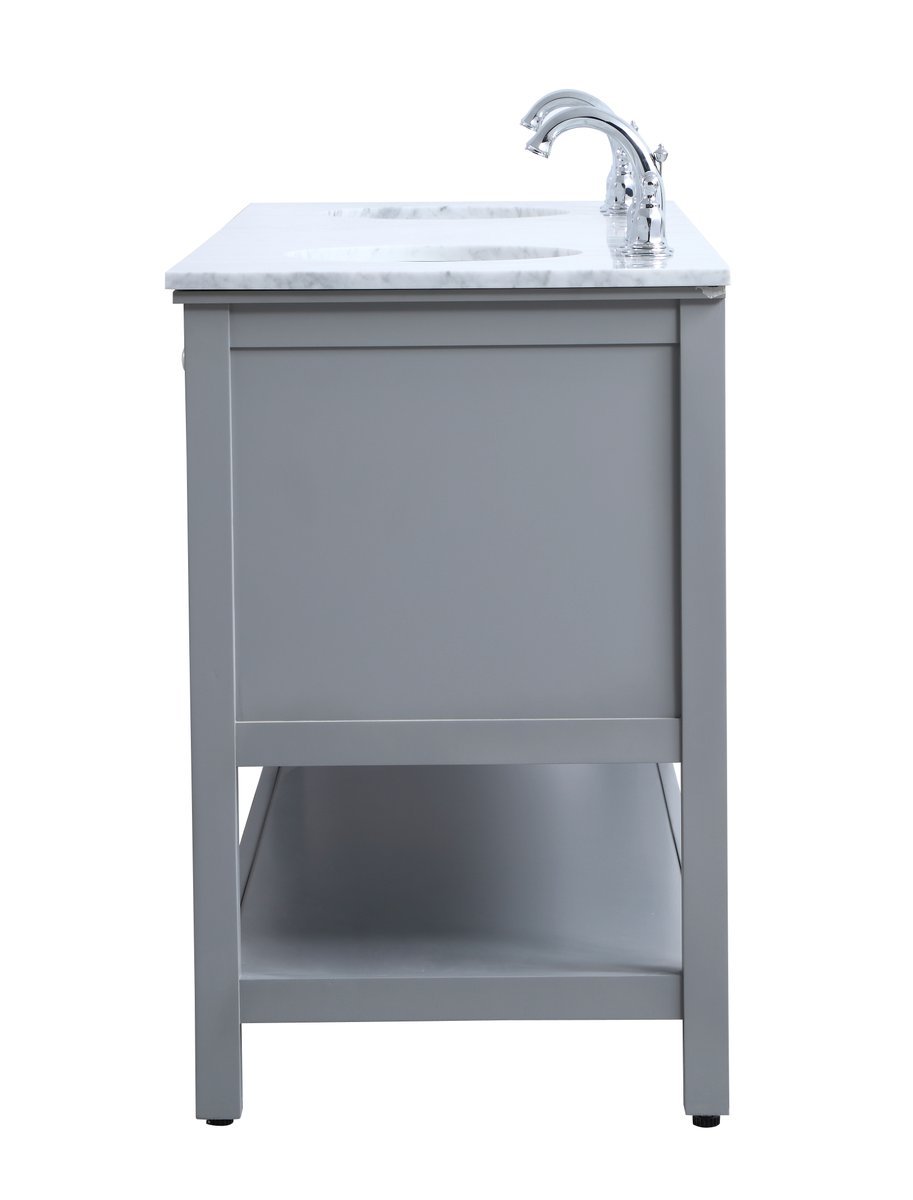 Create a refined and relaxing bath space with this contemporary design vanity, presenting its simplicity and clean straight lines in a minimalist appeal. This 60" freestanding vanity, crafted of solid poplar wood in soft-grey finish, provides ample storage within its double center drawers and 4 side doors, all equipped with soft closing mechanism and accentuated with gleaming chrome hardware. Rounding out the design is a luxurious Itallian Carrara white marble countertop and double white porcelain under-mount oval sink.