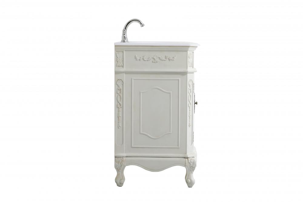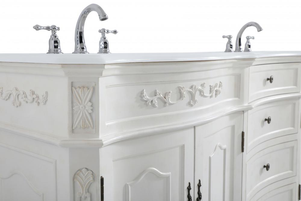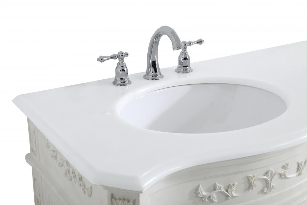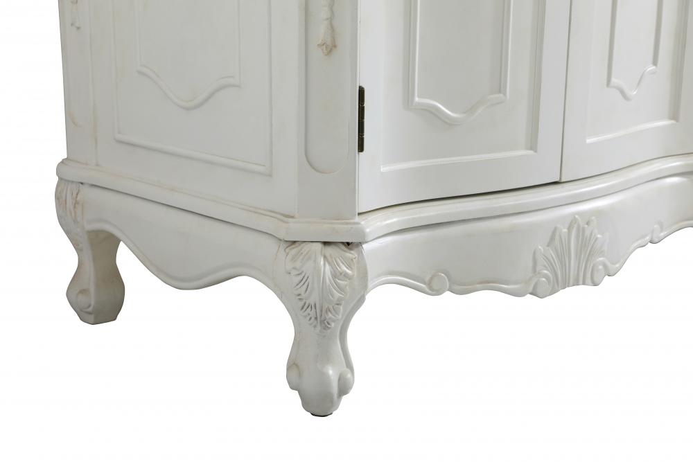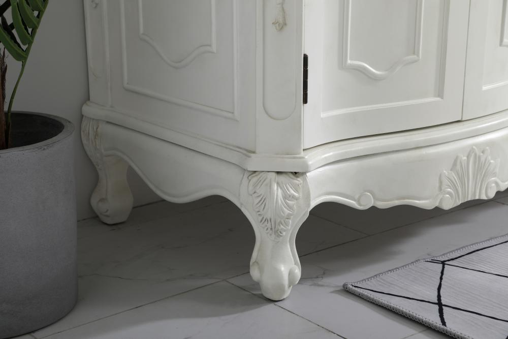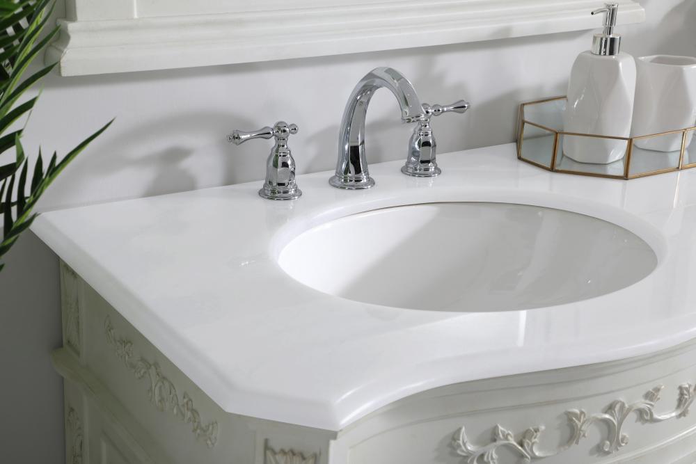 This superb balance of timeless tradition and opulent beauty in a engineered marble-topped vanity will certainly enhance the aesthetics of any home or office bathroom! Featuring an ivory white durable engineered marble countertop complimenting the hand painted cabinet with a delicate carved floral design, stands on stylishly carved solid wood French scroll feet. Don't let the design fool you, the engineered marble countertop and porcelain undermount sink allows for space to get ready, while the antique bronze hardware allows you to discover storage spaces with ease. You and your guests will marvel at this vanity that will both store away your bathroom essentials and enhance the aesthetics of your room.
