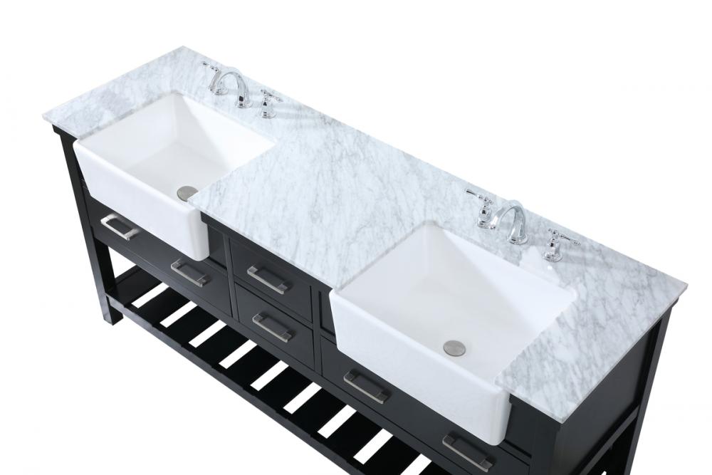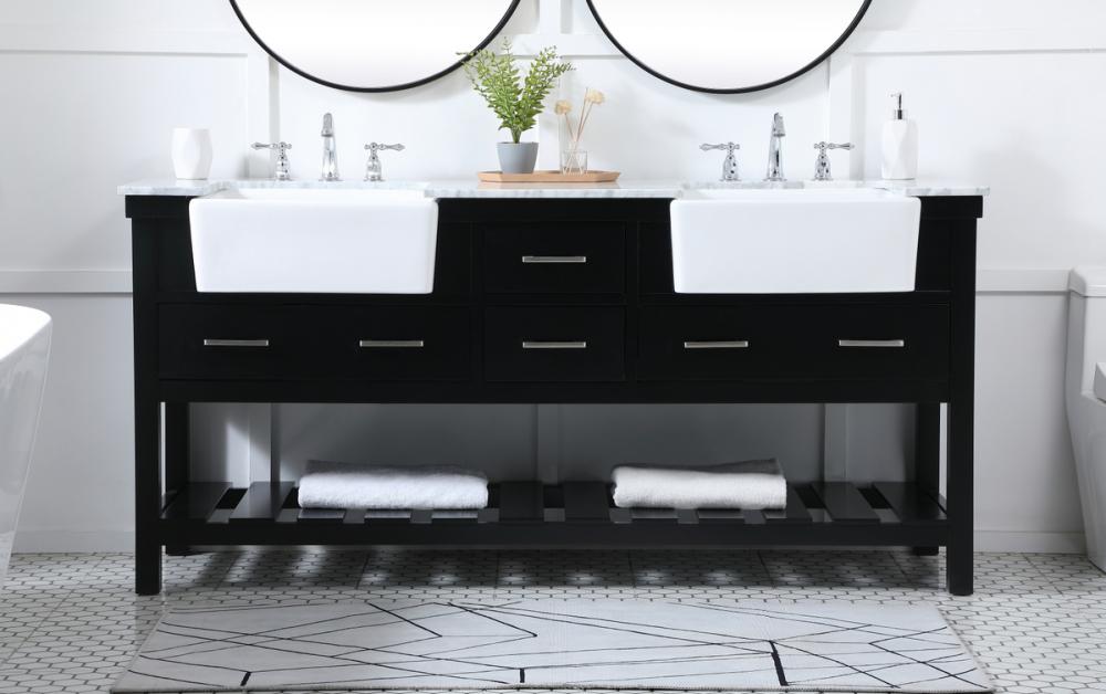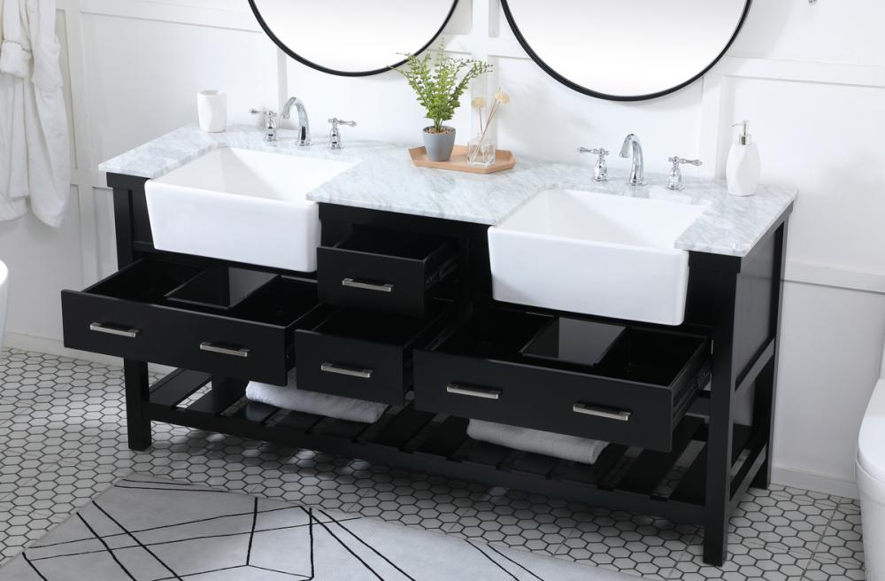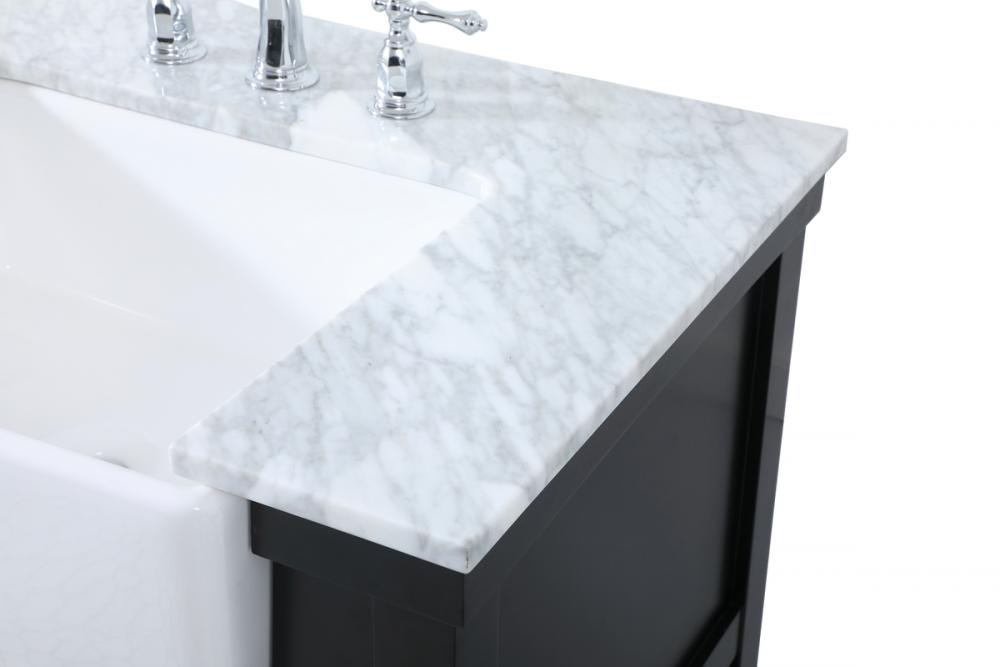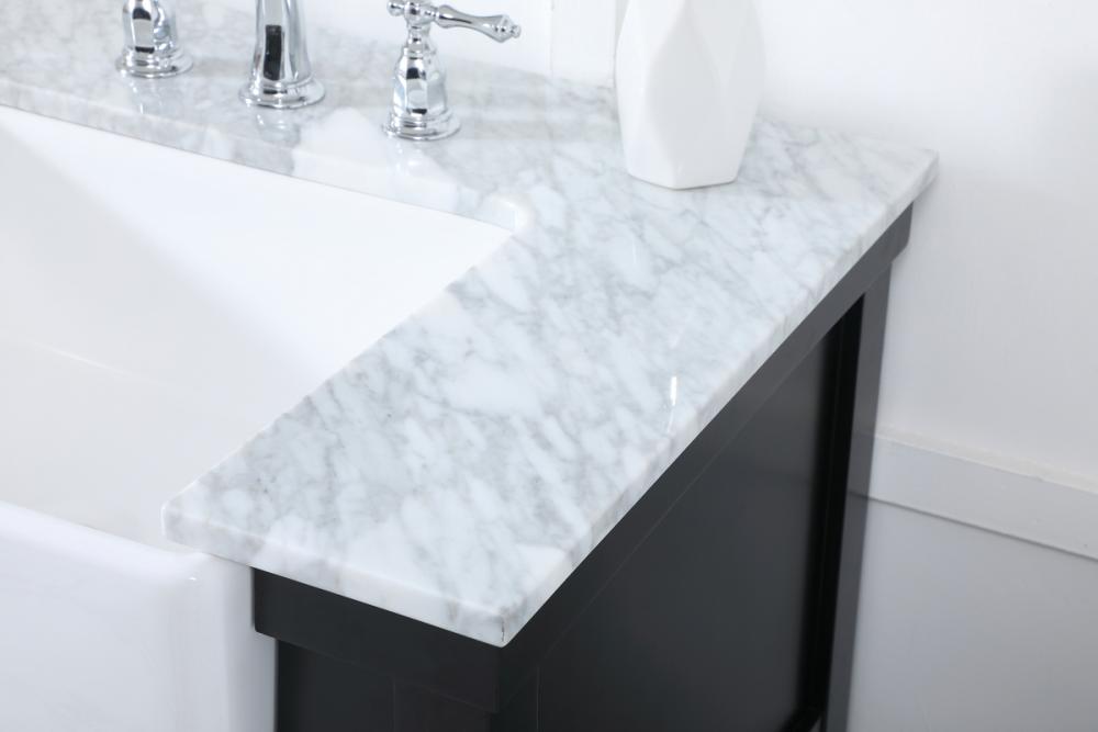 Make the most of your space with this farmhouse style bathroom vanity. Complements well with its beautiful finish, carrara white marble countertop, and the contemporary slender handle bar that sits on the functional drawers with soft closing mechanism, allowing you to store an assortment of bathroom essentials. The lower shelf makes it the perfect space to hold new towels for your guests. This stylish vanity ensures both form and function in your bathroom for you and your guests.
