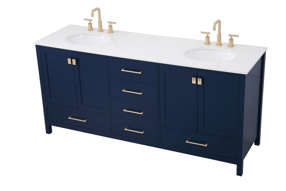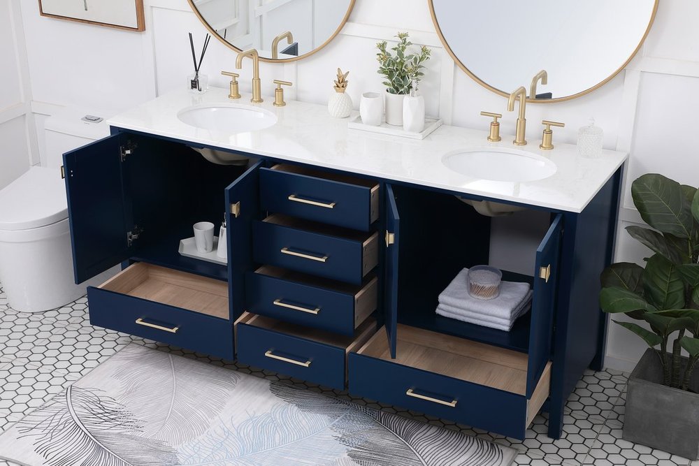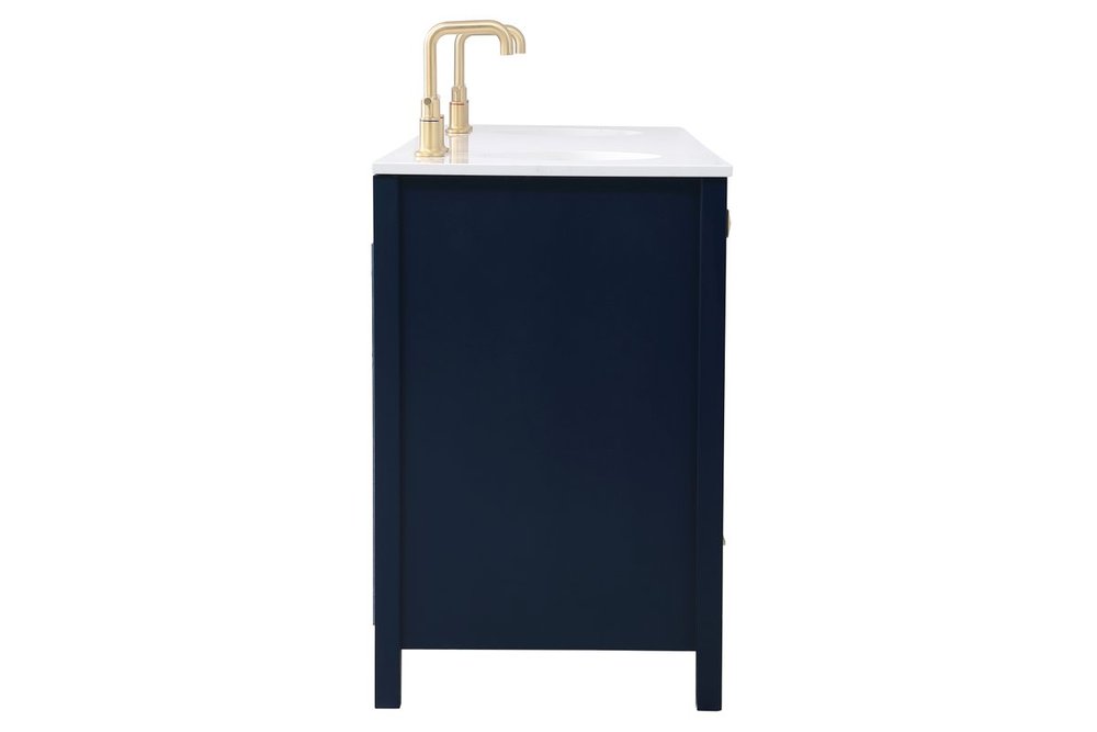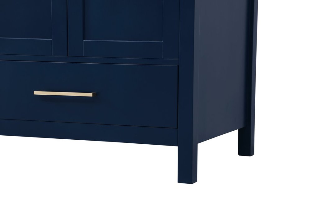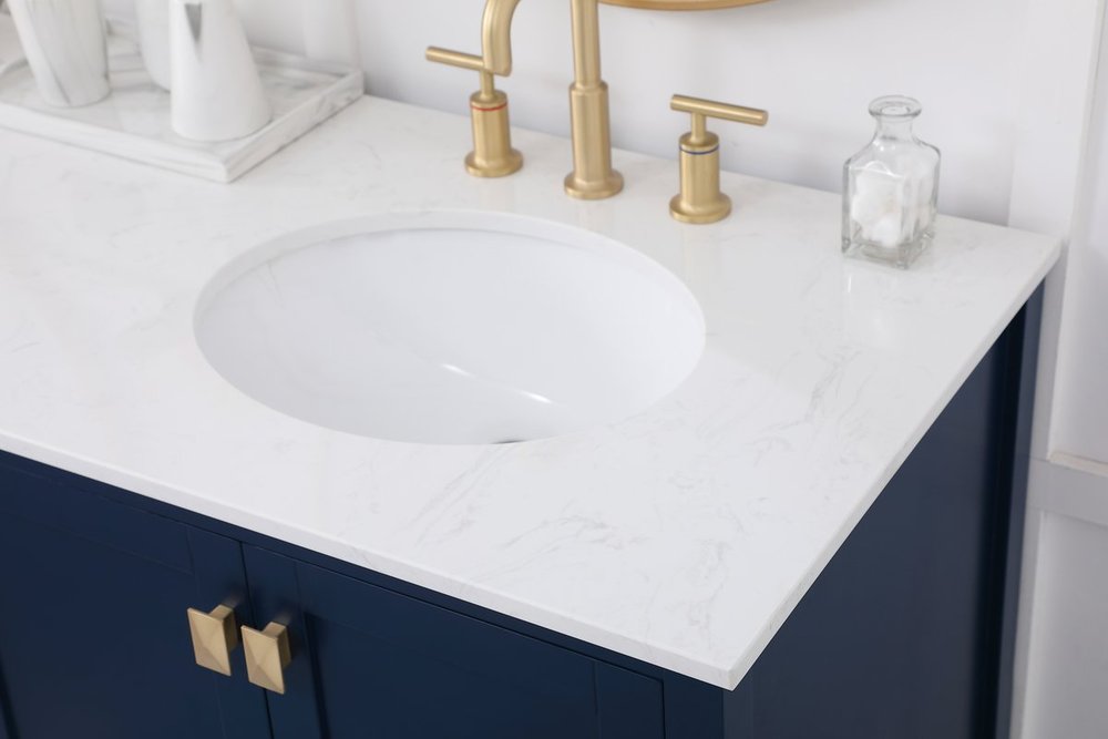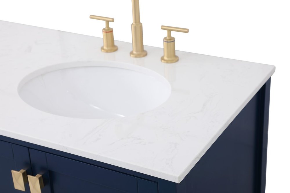 Never compromise beauty--the Irene collection stunning vanity in a blue finish will add lovely sophistication and complement any bathroom or powder room, while utilizing its charm and function to provide you with ample storage spaces. Satin gold pulls gently adorn the minimalist cabinet doors and drawers at the base, allowing for you to store away your bathroom essentials. The calacatta engineered marble countertop, porcelain undermount sink, dignified subtle engravings on the side edges, and squared legs all come together to create contemporary beauty. Work with your space, and design a beautiful room, no matter the size.