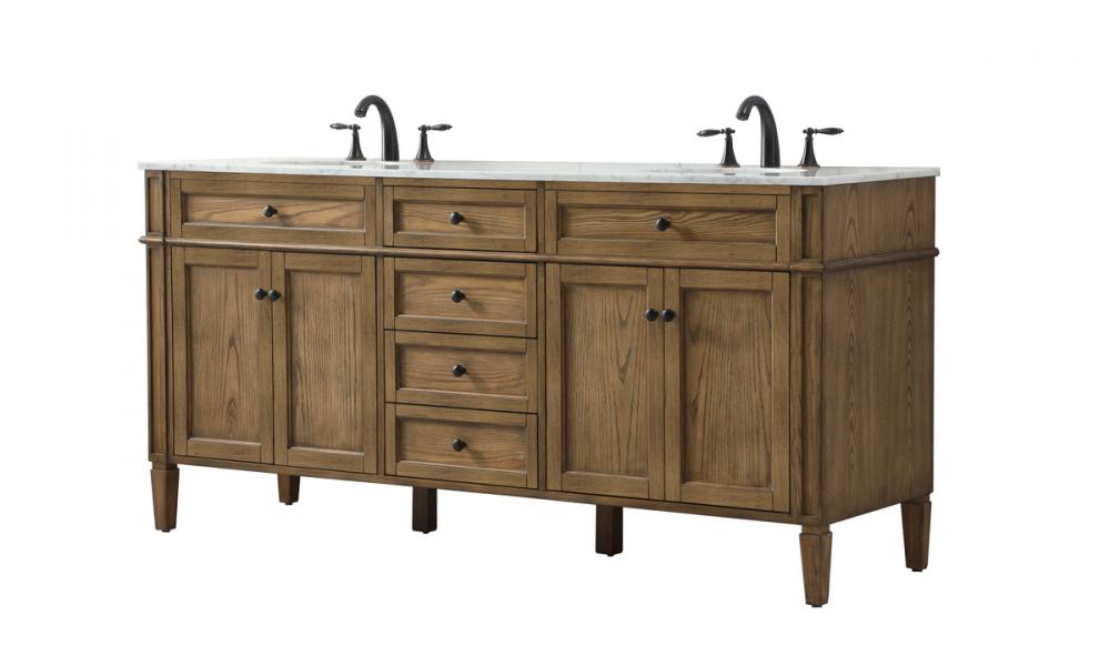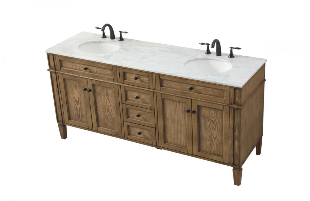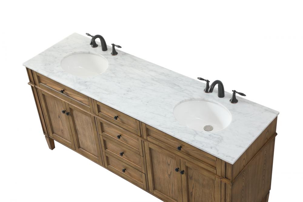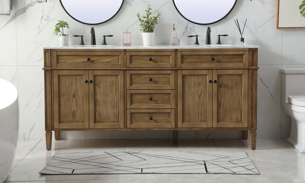 Comes with a double undermount porcelain sink and a carrara white marble countertop