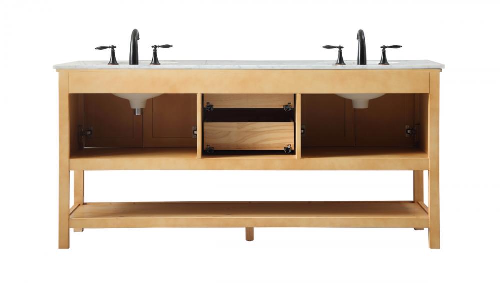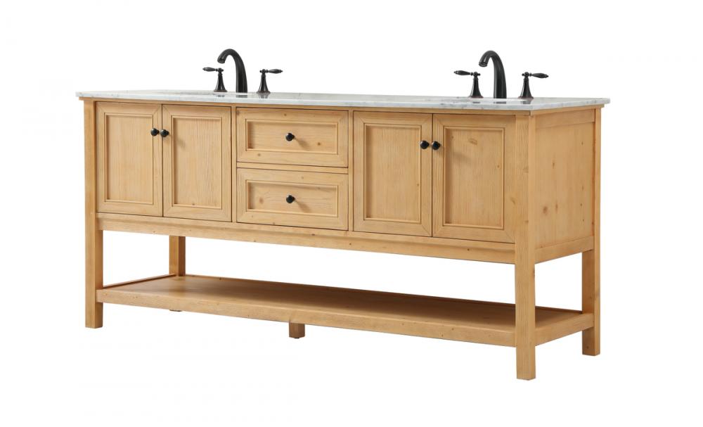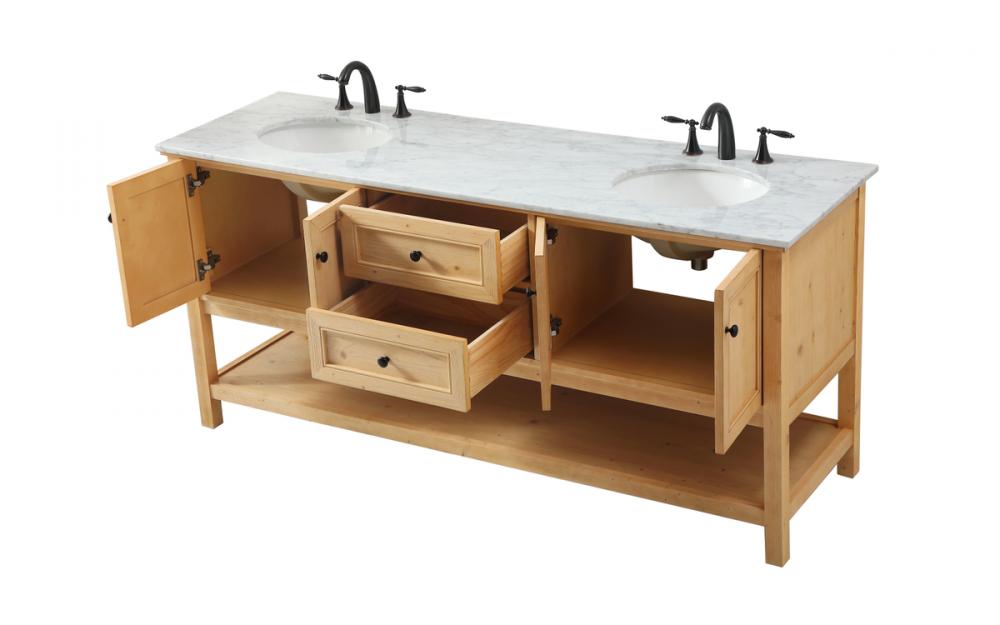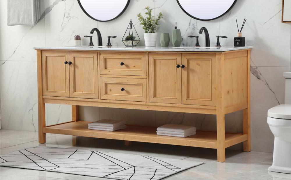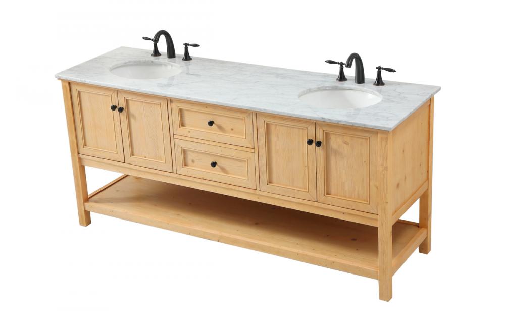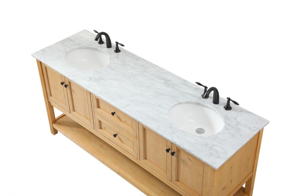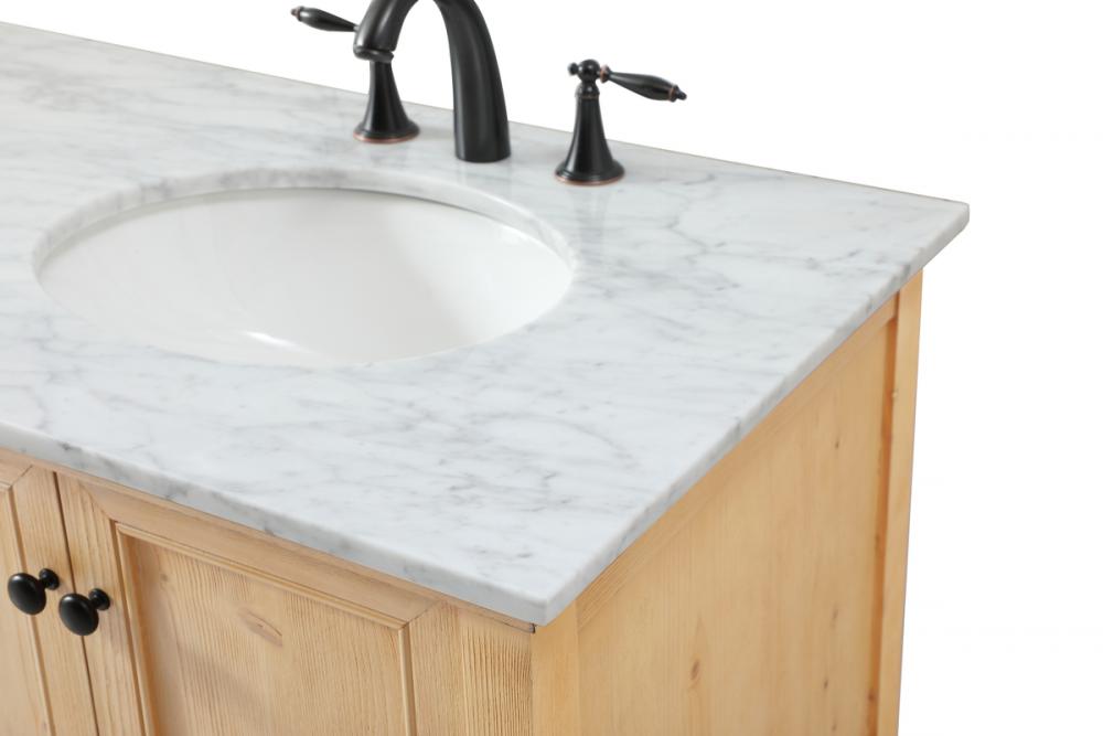 Comes with a double undermount porcelain sink and a carrara white marble countertop