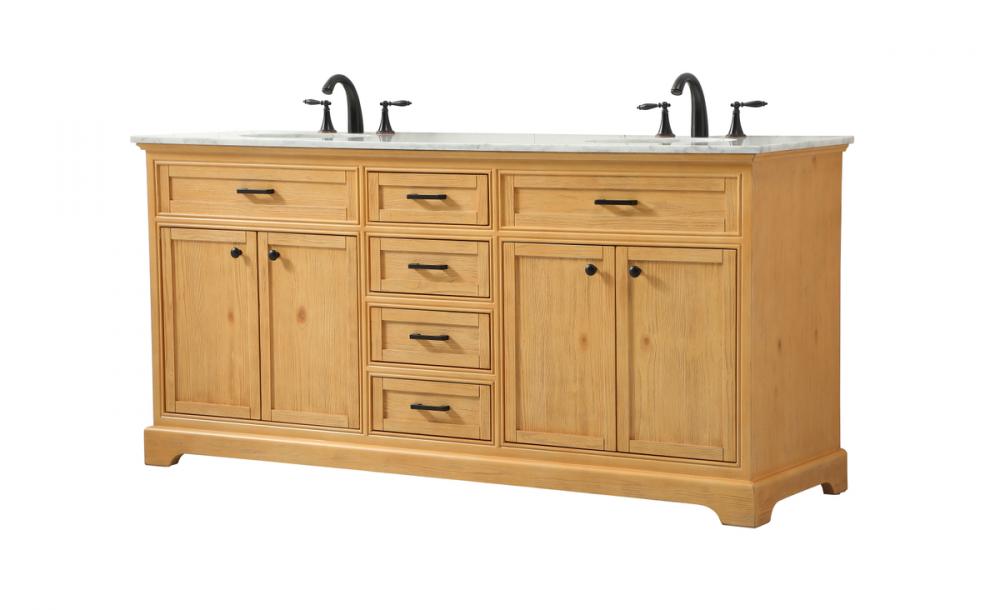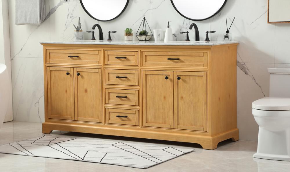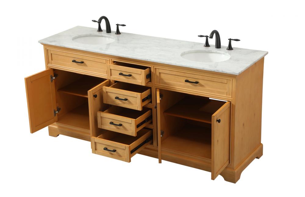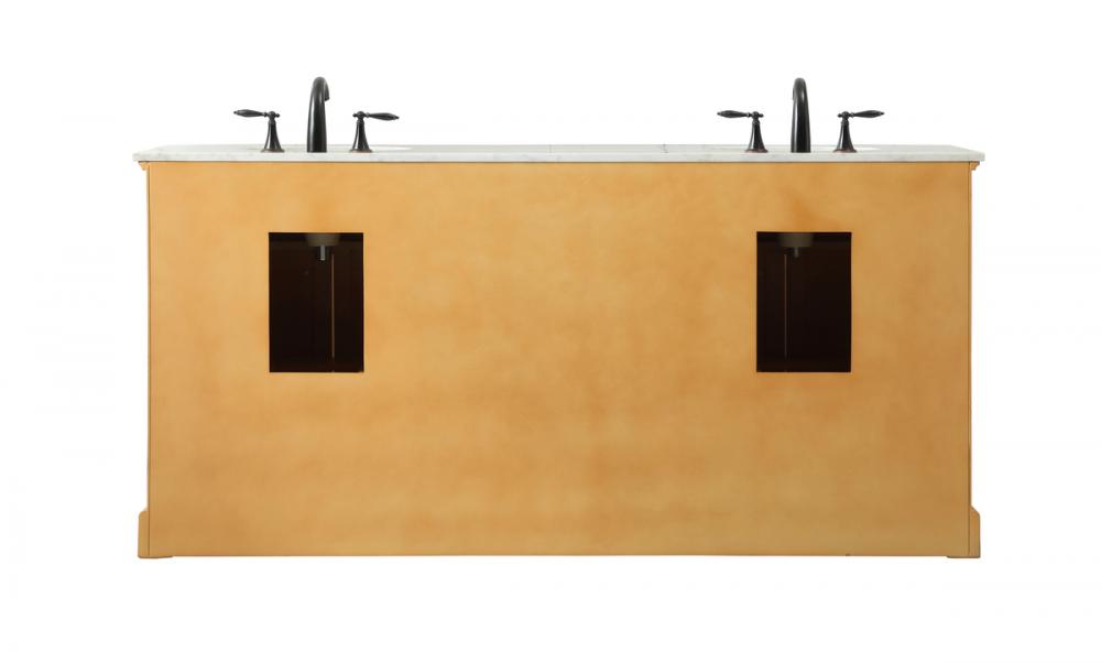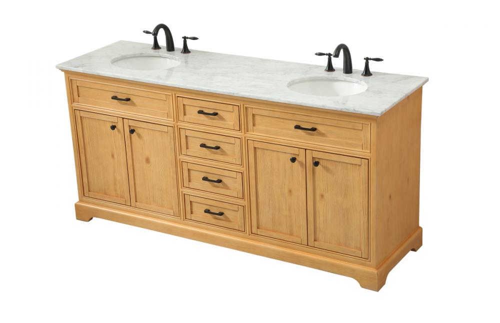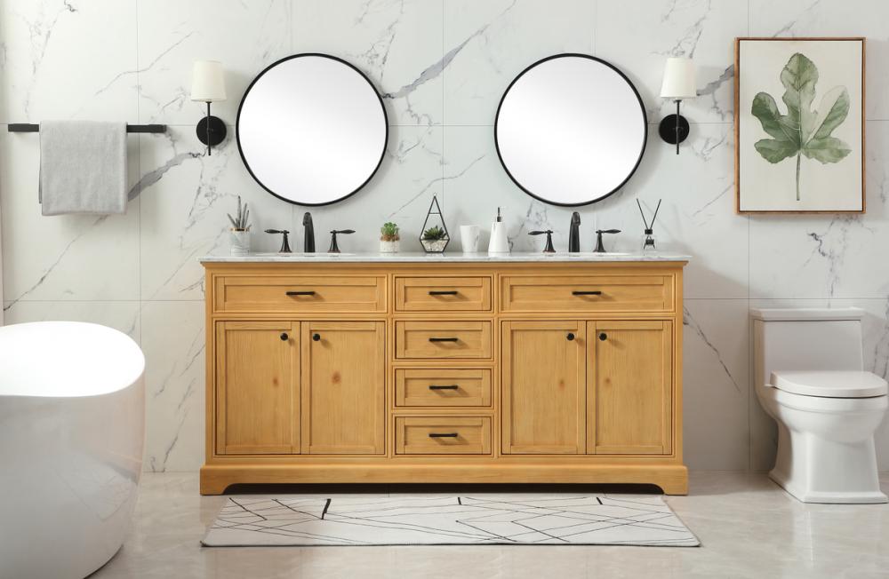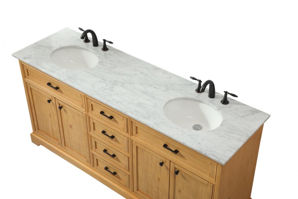 Comes with two undermount porcelain sinks and a carrara white marble countertop