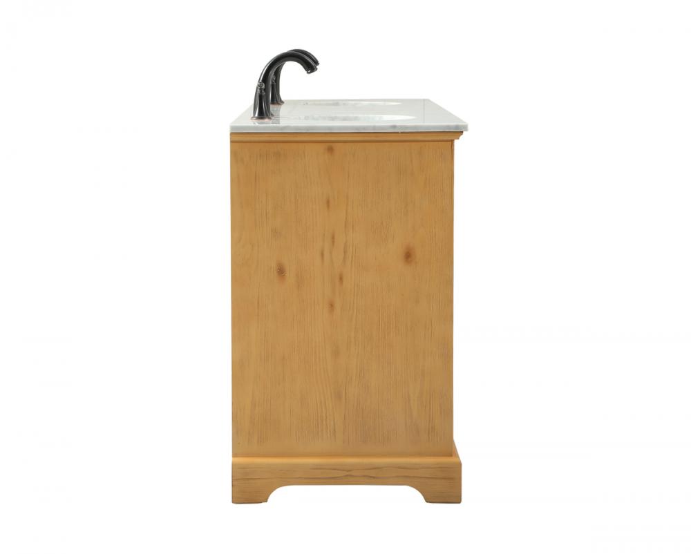 Clean lines and classic form can truly add a fresh look to your bathroom or powder room. This vanity, complemented by round hardware, will surely charm you with its confident style and subtle charisma. This vanity can store all of your bathroom toiletries, from extra towels to make up essentials. The vanity is crowned with carrara white marble and includes a porcelain undermount sink--adding both function and form that will truly amaze.