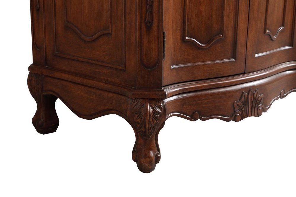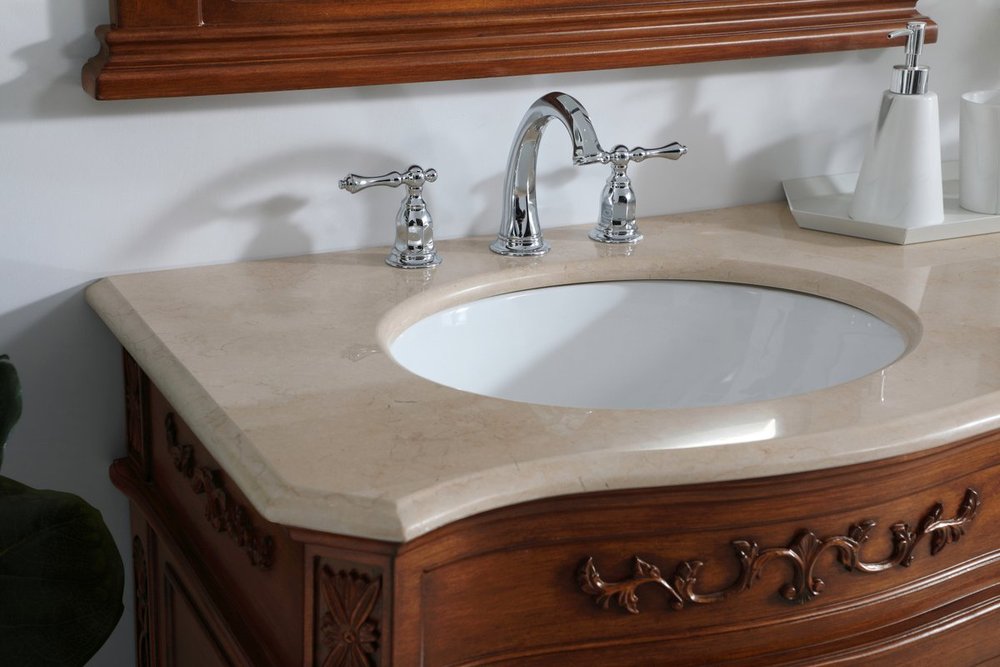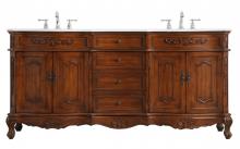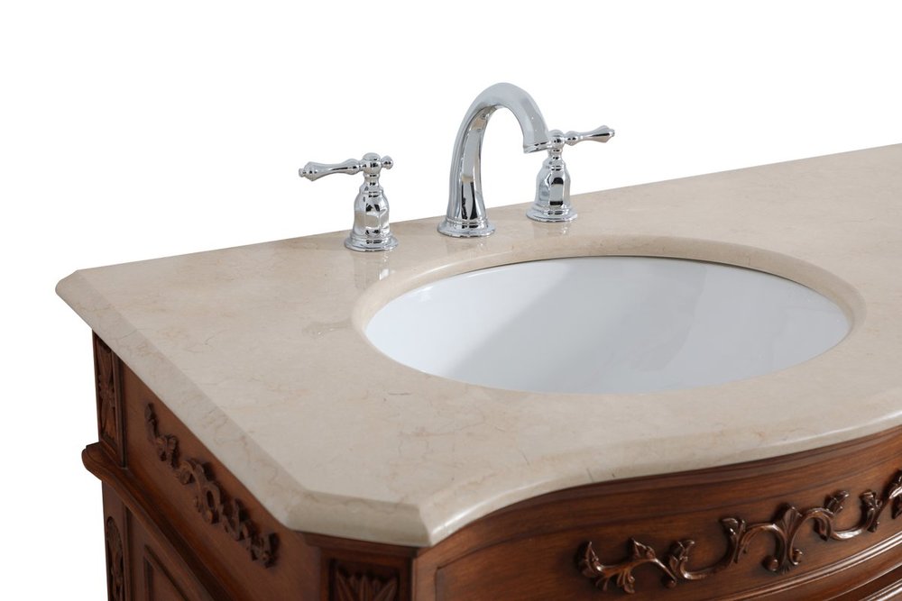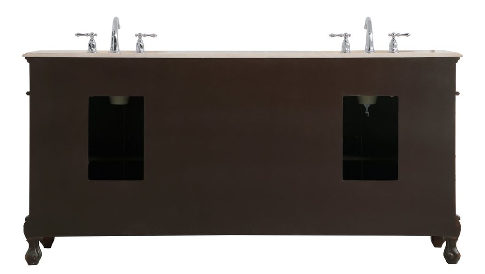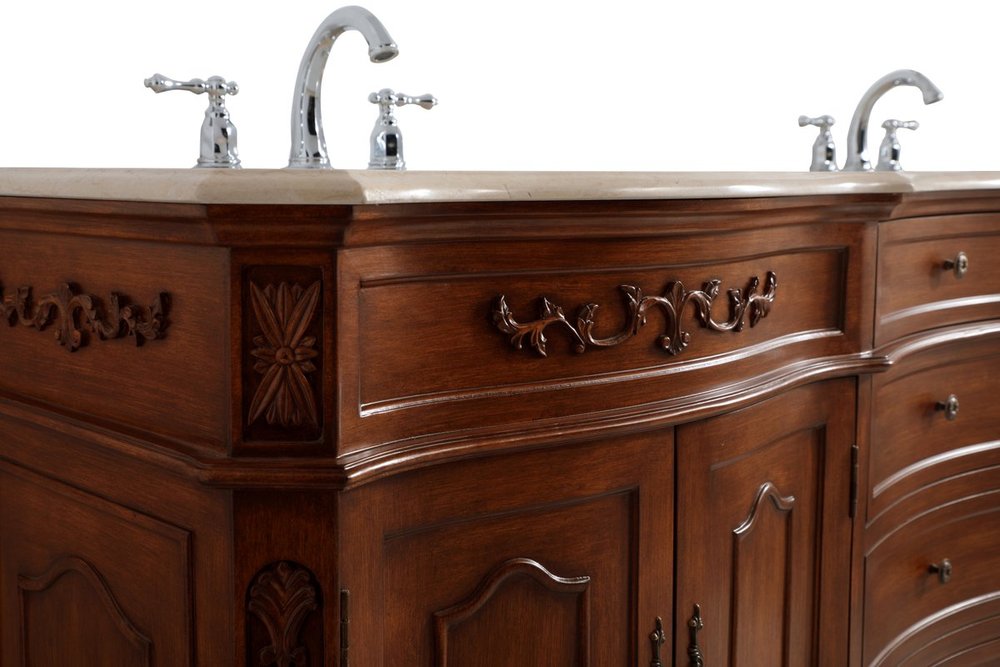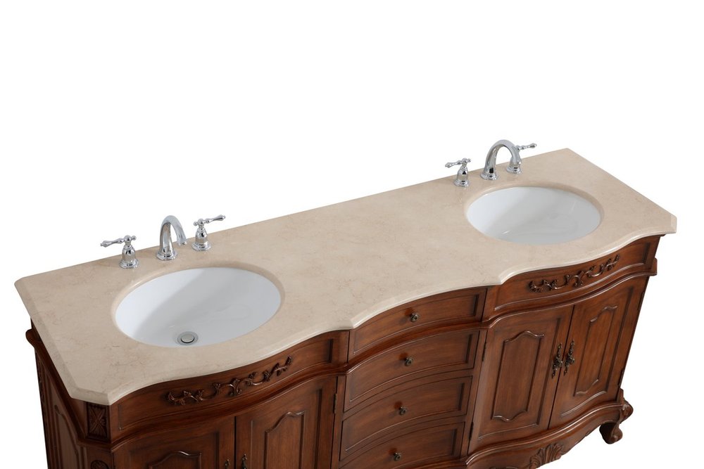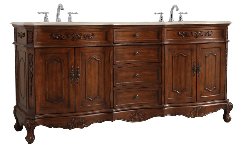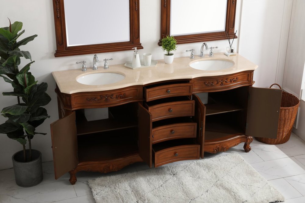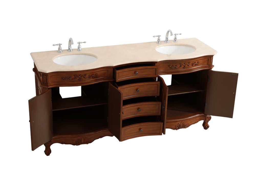 The Danville collection 72" vanity in a teak finish and double sink brings about traditional beauty. Decorated with ornate filigrees and engravings throughout, your bathroom or powder room will exude refined beauty. Don't let the design fool you, the antique bronze hardware allows you to discover storage spaces with ease. The simple knobs allows you to glide the 4 center drawers out, while the ornate knobs help you open the four cabinet doors. With two porcelain undermount sinks and ample cream marble countertop space, two people can get ready with ease and comfort. You and your guests will marvel at this vanity that will both store away your bathroom essentials and enhance the aesthetics of your room.
