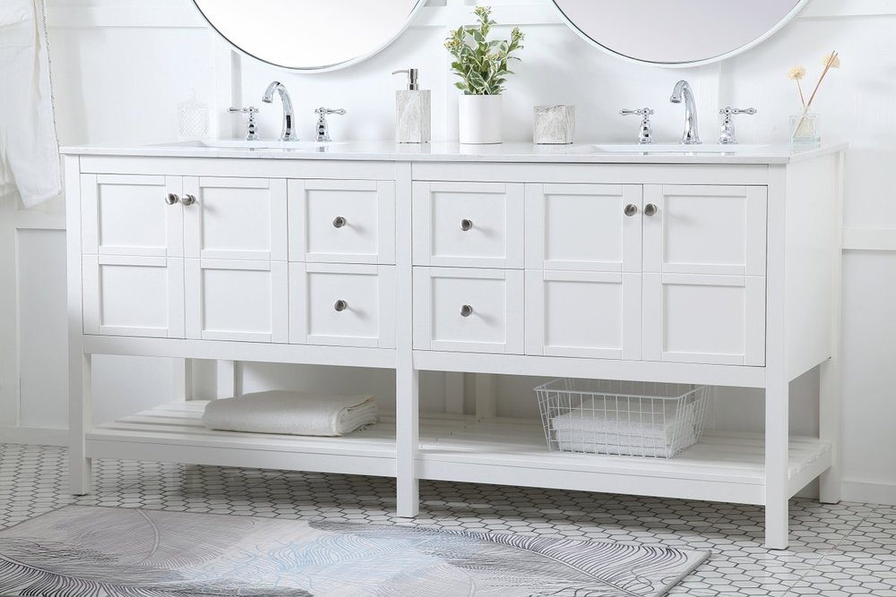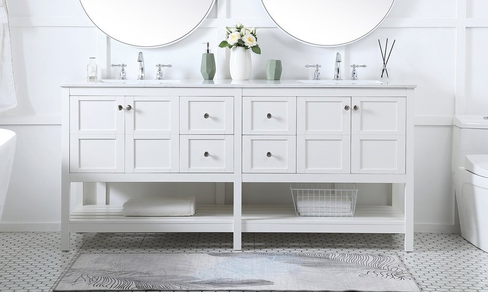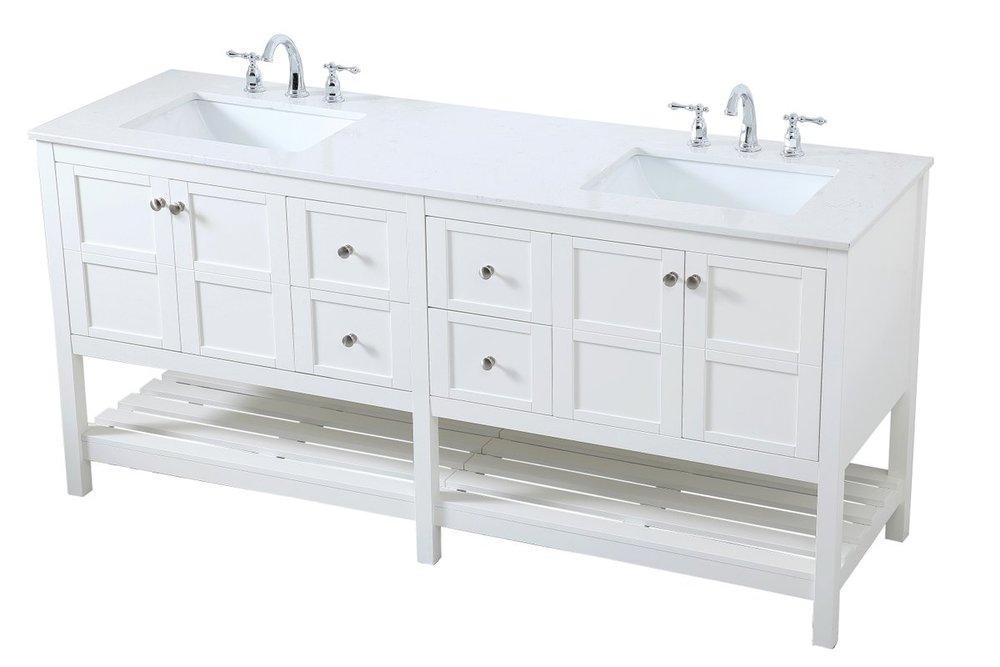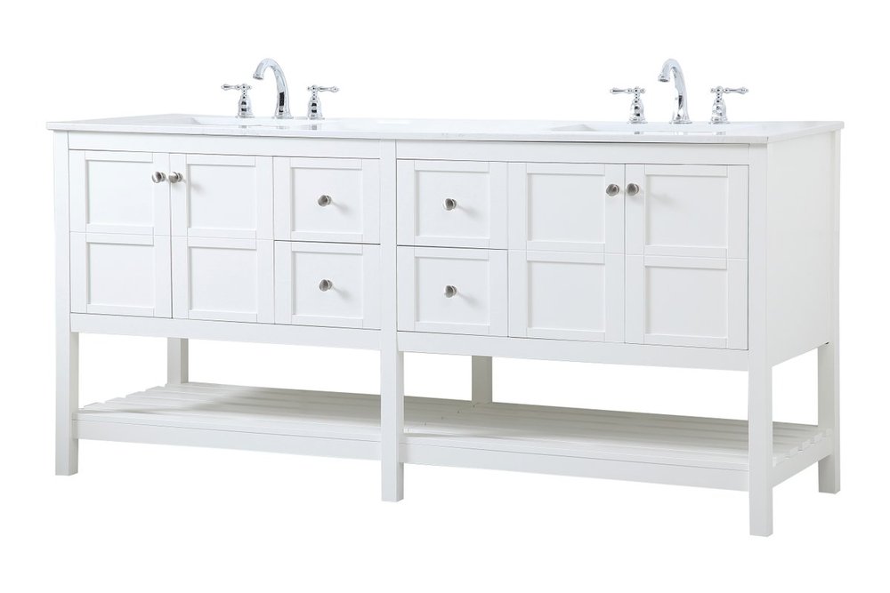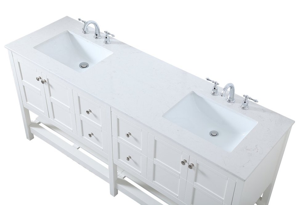 The subtle beauty of the Theo collection 72" vanity in a white finish exudes comfortable luxury. Its modern, yet traditional beauty will surely dress up your bathroom or powder room without any fuss. The white stone countertop and porcelain undermount sink shows quiet opulence, and the legs support upright without fail. Brushed Nickel hardware complements the trendy white finish, with pulls adorning the four cabinet doors and four drawers, showcasing ample storage space within. Slated shelf allows for additional space to organize your towels. Whether this vanity is in your bathroom or for guests, its presence will surely elevate the aesthetics of your room.
