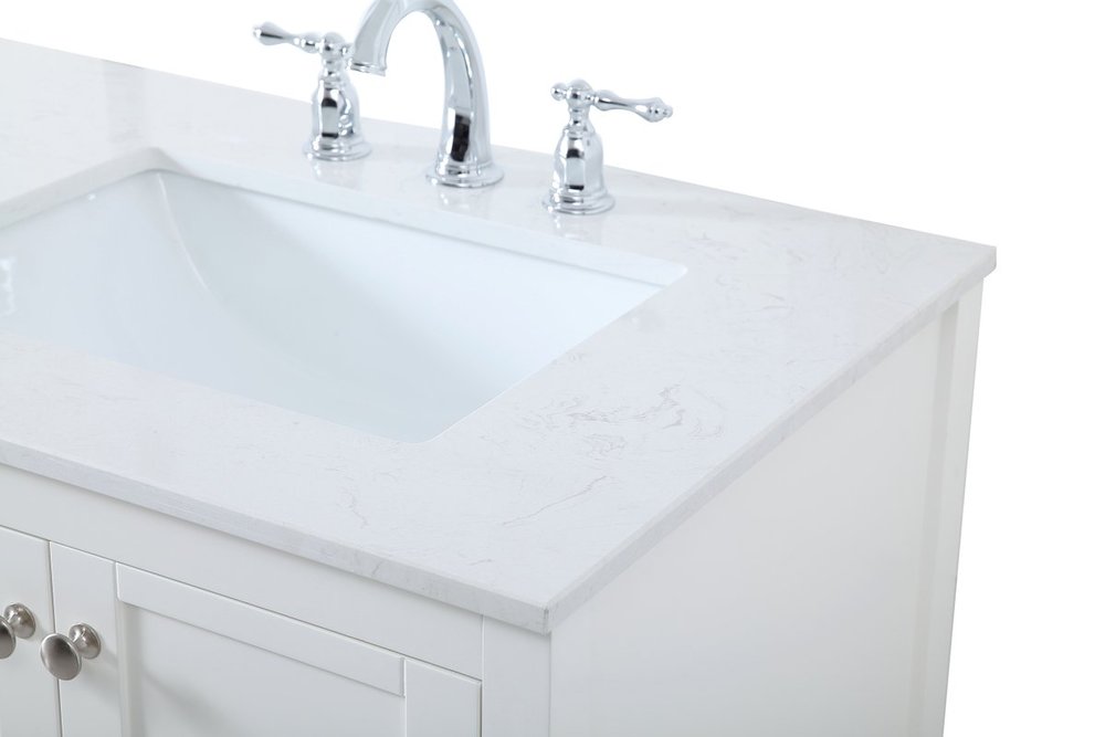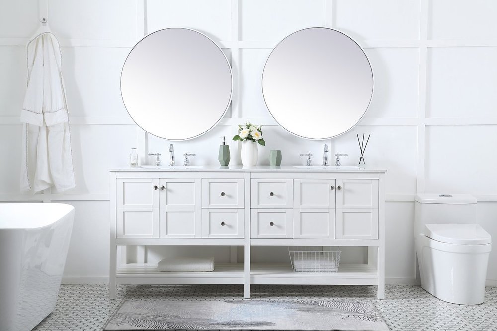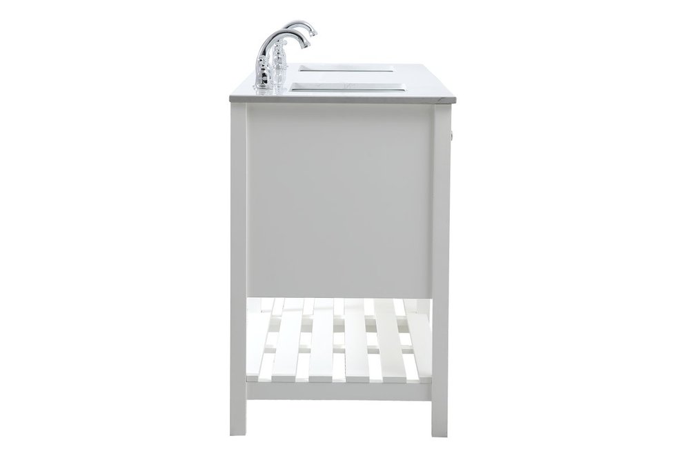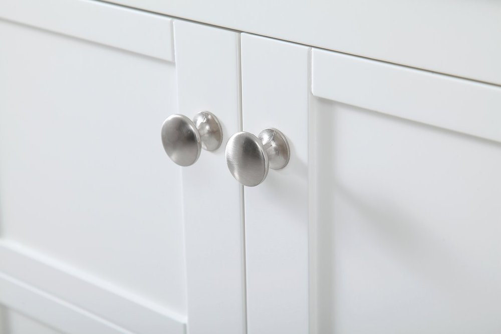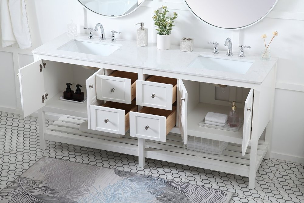 The subtle beauty of the Theo collection 72" vanity in a white finish exudes comfortable luxury. Its modern, yet traditional beauty will surely dress up your bathroom or powder room without any fuss. The white stone countertop and porcelain undermount sink shows quiet opulence, and the legs support upright without fail. Brushed Nickel hardware complements the trendy white finish, with pulls adorning the four cabinet doors and four drawers, showcasing ample storage space within. Slated shelf allows for additional space to organize your towels. Whether this vanity is in your bathroom or for guests, its presence will surely elevate the aesthetics of your room.