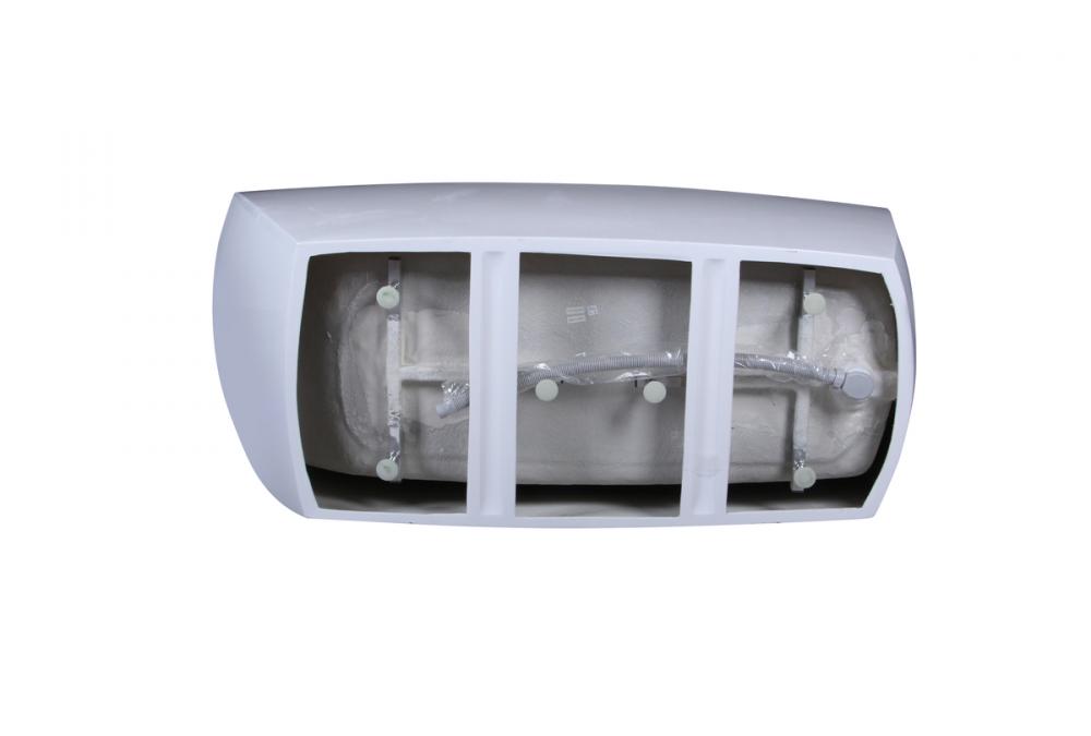 The all-white drain trim seamlessly blends with the bathtub's design, maintaining its modern look while providing efficient drainage through the flexible 35 inch long drain pipe.