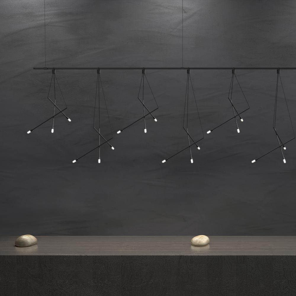 Joined in an organic arrangement, the stems of this delicate lighting branch are suspended by cords to a single point of connection. Each of the three stems of the branch composition has a diffused LED light source. Shown aligned along a linear Power Bar, Branch Luminaires can be arranged on a variety of other suspended configurations both level and inclined.