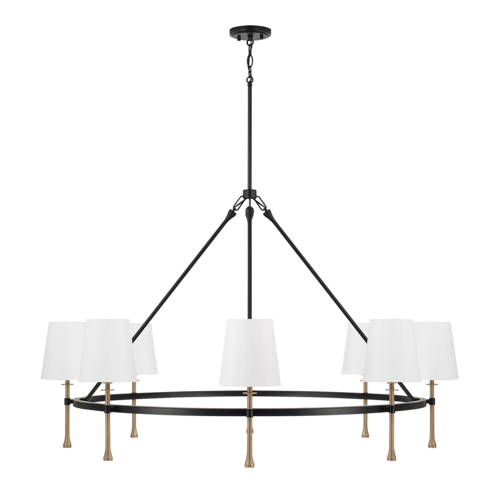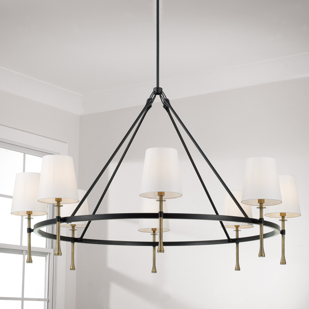 A fresh take on transitional design, the Hollis Grand Chandelier adds two-tone appeal and a touch of texture to a classic form. The ring silhouette seamlessly blends Matte Black with the textural, handcrafted Hammered Gold finish on the finials. Mini disc bobeche details draw the eye, while tapered White Fabric shades round out the style.
