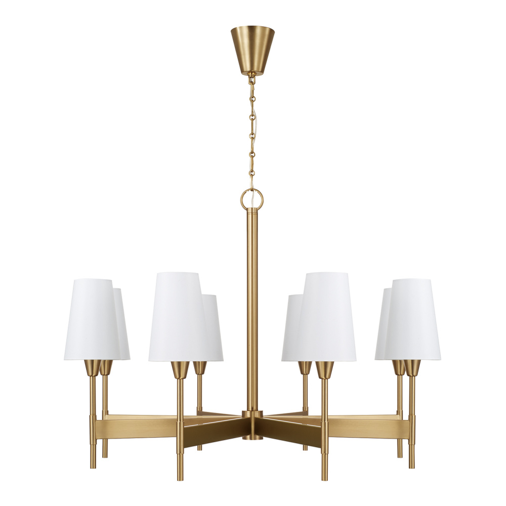 The Leland Large Chandelier exudes transitional design with bold and artful details. The wide lines bring structure to the classic silhouette, punctuated by tapered socket details and White fabric shades. This distinct luminaire is finished in Aged Brass and a unique designer canopy for timeless, elevated style.