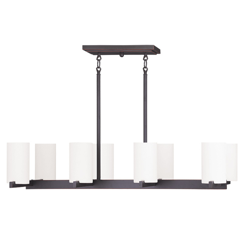 The minimalist Astoria collection draws the eye to the soft, warm glow of the light emitted from the cylindrical satin opal etched glass shades available in a subdued brushed nickel or soft olde bronze.