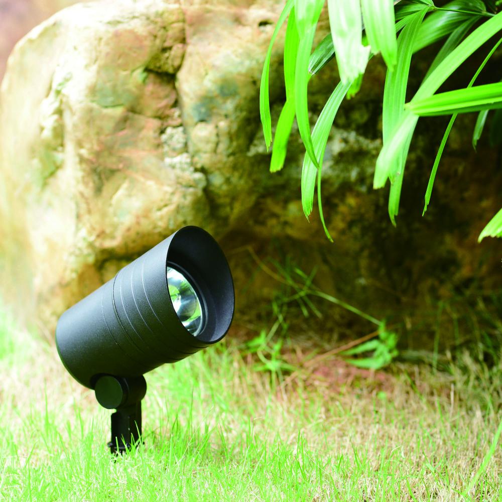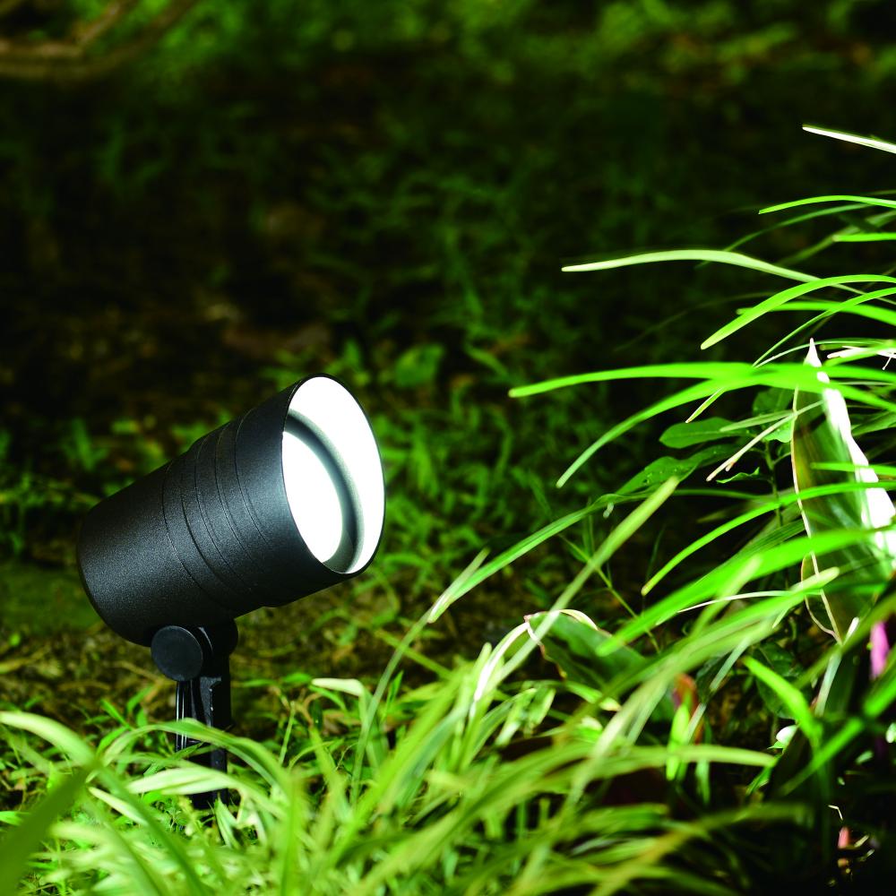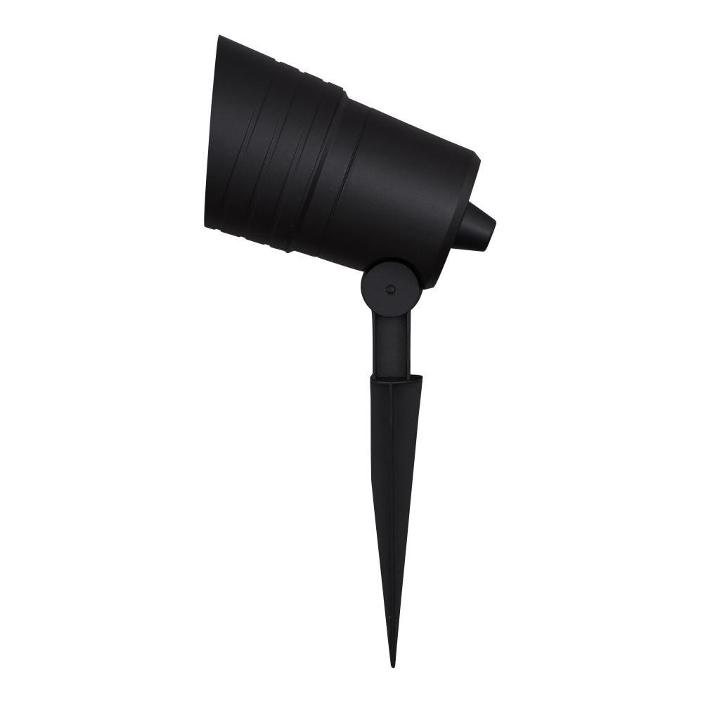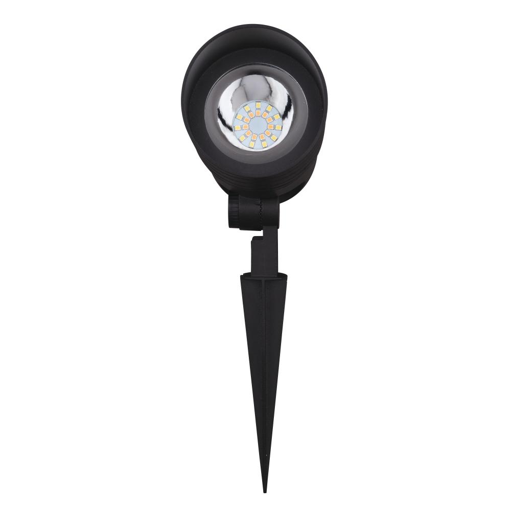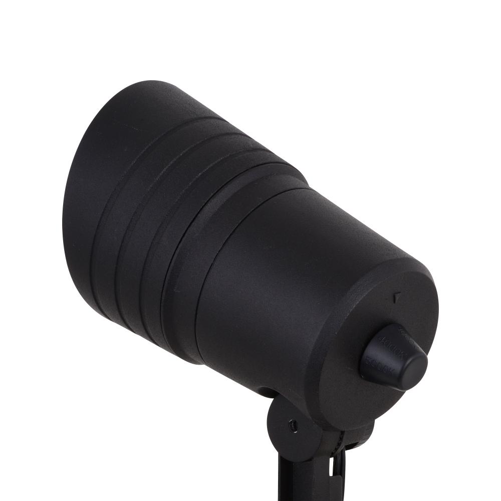 This contemporary low voltage landscape flood light with integrated LED is the perfect outdoor lighting solution. It offers functionality, energy savings, and security for your outdoor spaces. Rotate the single black light head vertically up or down to direct the light precisely where you need it. Bright 850 lumens of output plus three selectable color temperatures - 3000K warm white, 4000K bright white, 5000K daylight - allow you to choose the quality of brightness. Connect this stake spot light with other landscape lighting products to customize and highlight your outdoor spaces. Ground stake and connector cable included. Low voltage transformer required (sold separately).