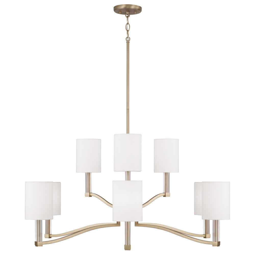 Blending transitional design with classic appeal, the Ingrid Two-Tier Chandelier brings sophistication to any space. The Matte Brass arms curve slightly to meet the crisp acrylic candlesleeves, topped with cylindrical White fabric shades for a neat, tailored look.