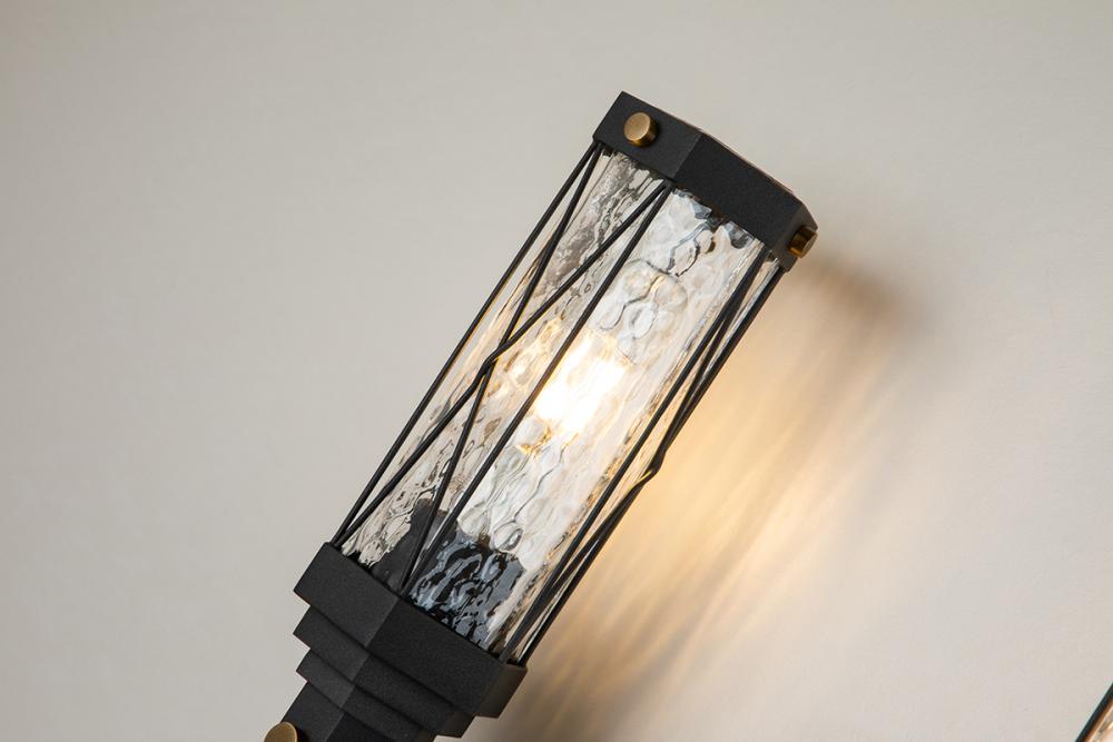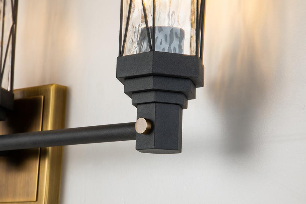 A hexagonal 3-light vanity in aged brass and black with X-patterned water glass shades. Mounts up or down, adding vintage charm and modern style to bathroom spaces.