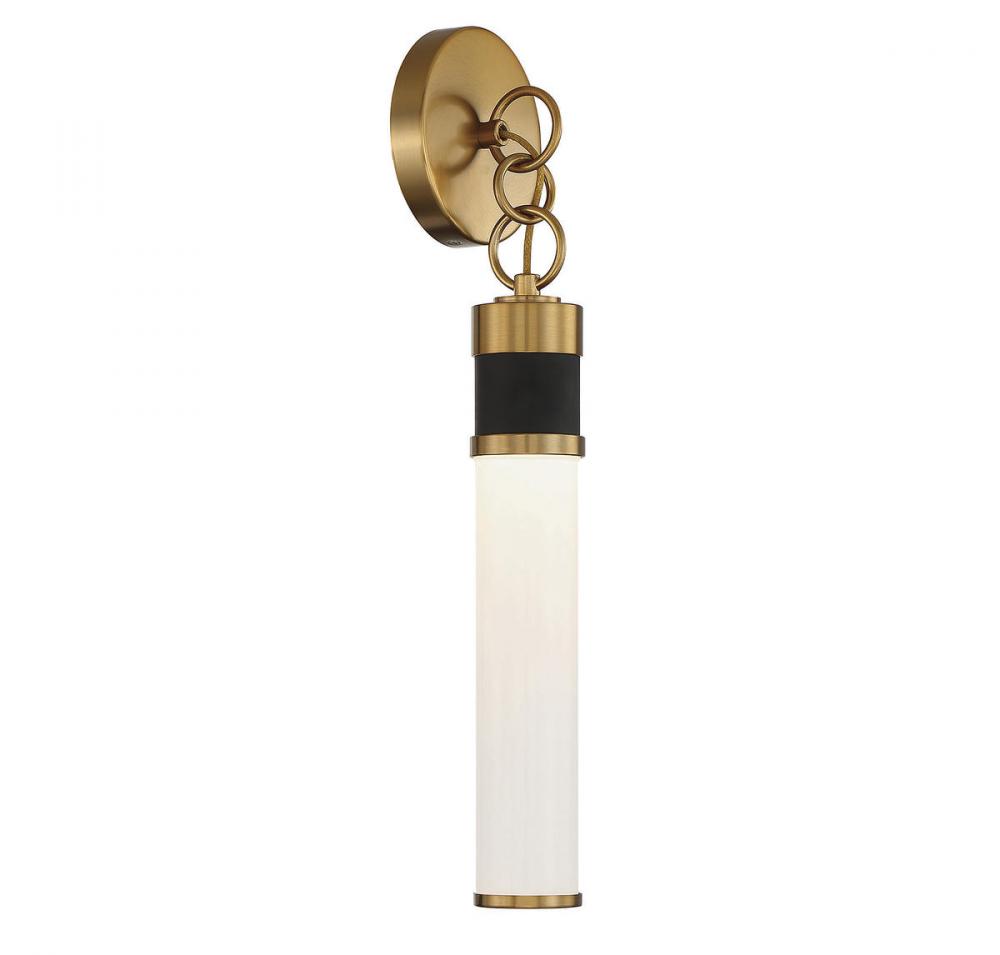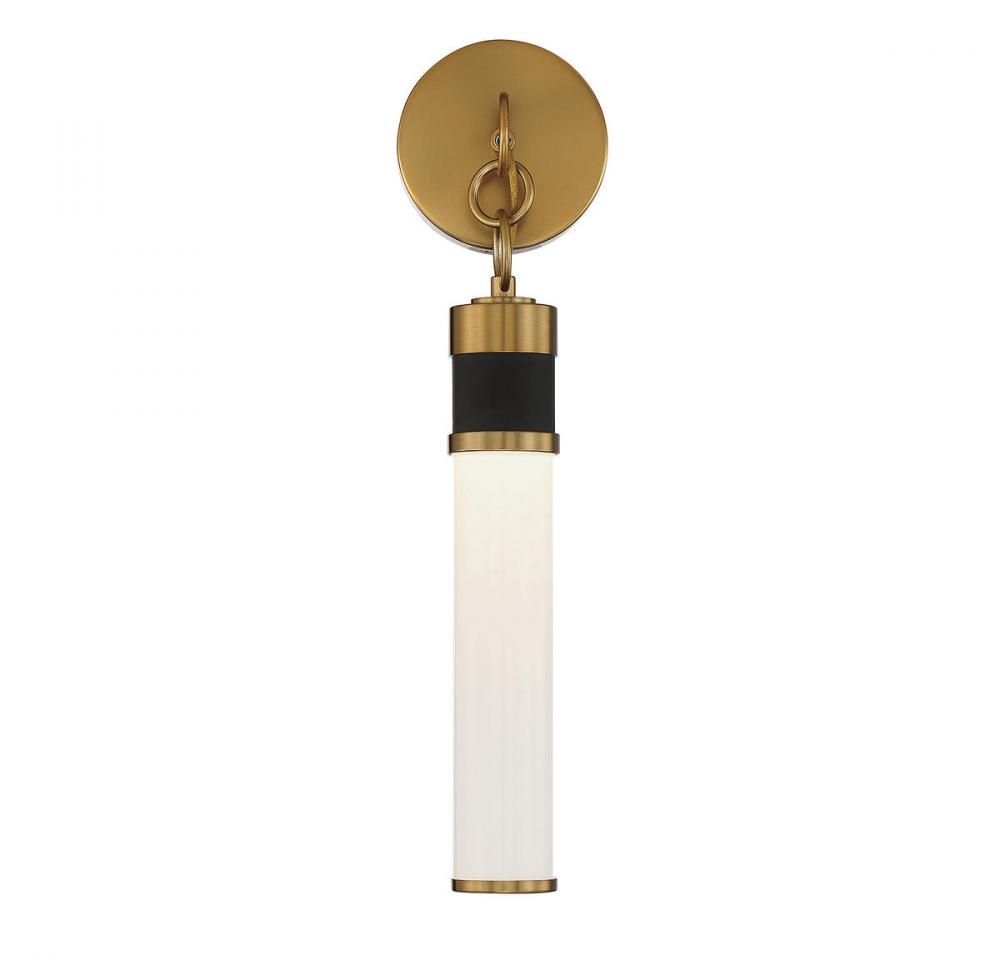 The Savoy House Abel 1-light sconce flaunts a sleek and airy look that creates a robust presence in any space. A tube of white opal glass is accentuated by ring accents and thoughtful hardware detailing in a rich combination of matte black with warm brass. An integrated LED light source contributes to the style. Abel is 19.5" in height, 5" in width and extends 4" from the wall. Damp area rated.
