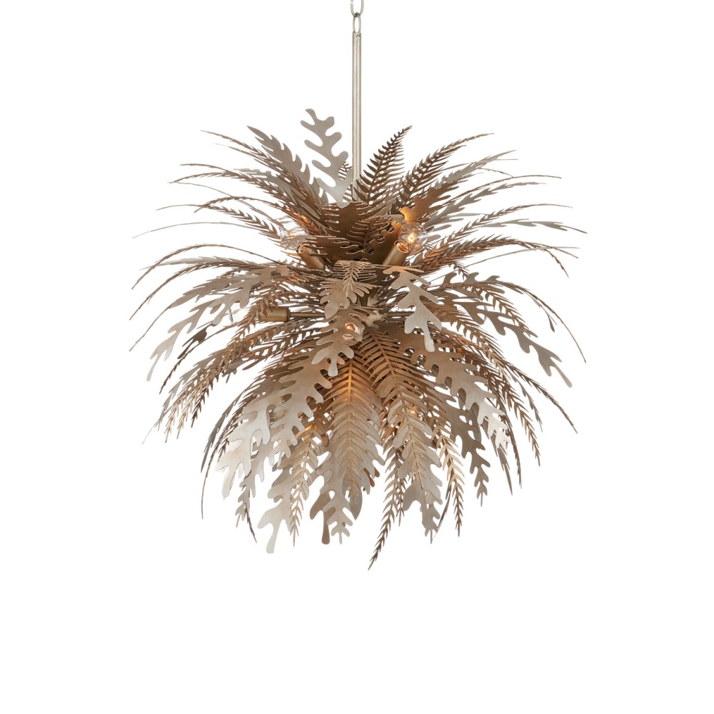 Wildly exuberant in its energy, the Abyssinia Chandelier is a sensational creation exploding with flora in varying wrought iron shapes. The organic, nature-inspired chandelier was seriously labor-intensive to create, as each of the leaves is individually laser cut and bent, then welded to a center core to mimic how a plant would grow from a planter. The intermingling of contemporary silver leaf and dark silver leaf finishes creates an even more intense sense of texture. The hanging rods are adjustable. Adjustable from 40" to 86" with use of included chain/rod kit/cable. If your space calls for a longer drop, additional chain/rods/cable is available for purchase.