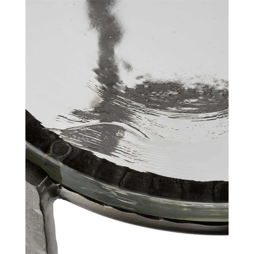 The point at which art and fine craftsmanship meet is where the Acea Graphite Drinks Table resides. Made of cast aluminum poured into a hammered mold to create even greater texture, the silver drinks table is topped with a cast glass disc that is equally textural and luminous. This table will be a piece of jewelry in a space.