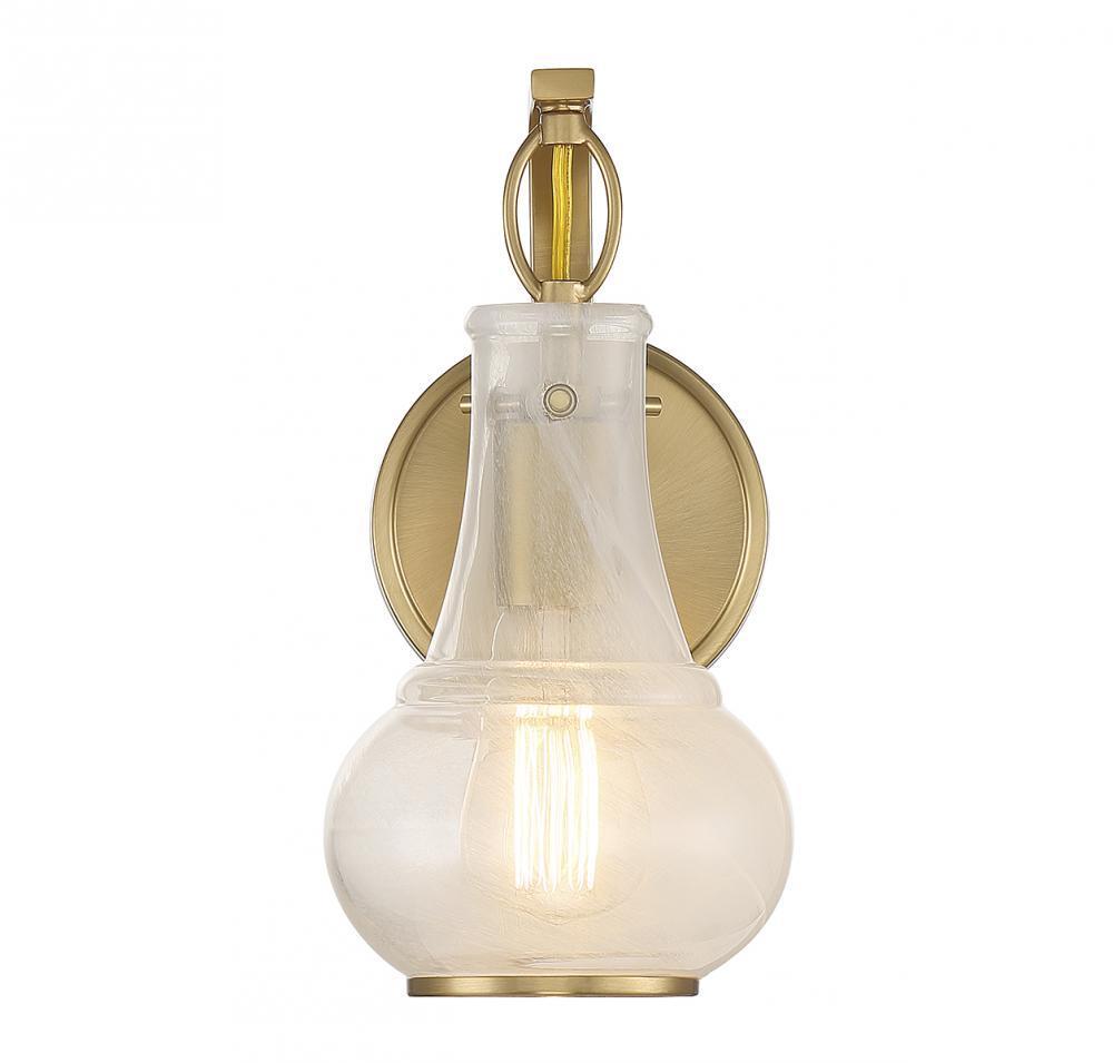 For the Adams 1-light sconce, Savoy House took traditional lighting style and gave it a fashionable twist for today's stylish homes! A molded, curving shade of white strie glass offers an extra touch of eye-catching detail to go with the warm brass finish. Adams is 11" in height, 7" in width and extends 7.5" from the wall. Uses a standard size bulb with a max of 60 watts (bulb not included).