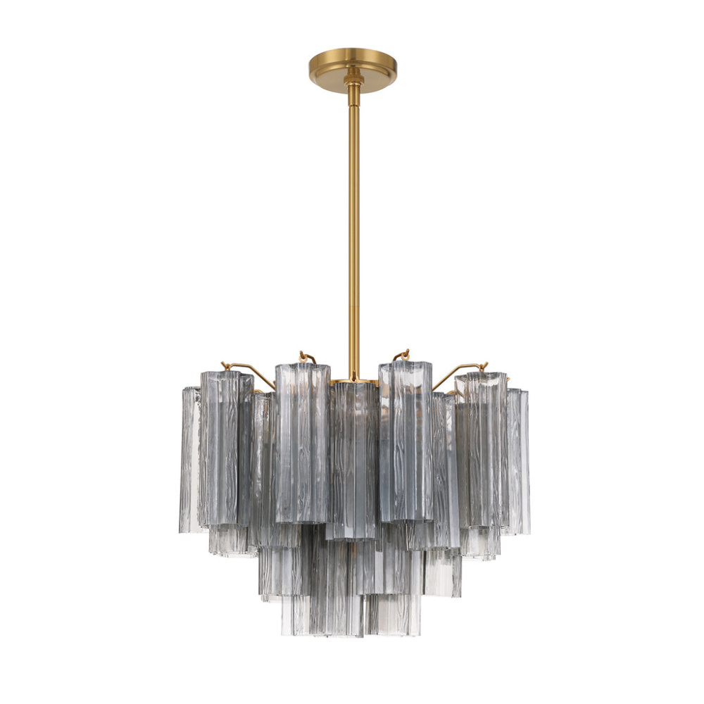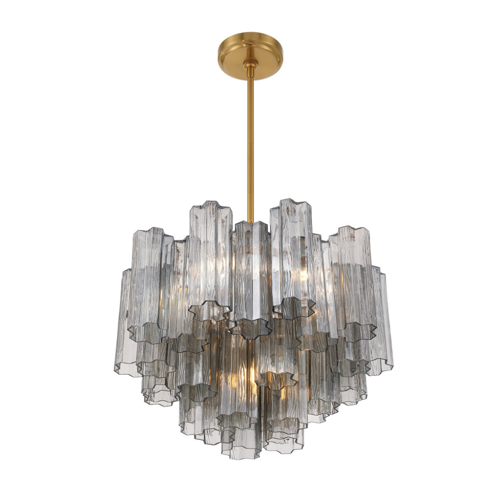 The captivating Addis Lighting Collection is a modern-day interpretation of the iconic mid-century Tronchi chandelier. Inspired by its predecessor's sleek lines and geometric shapes, the Addis features a polished Chrome or Aged Brass metal frame that exudes sophistication and style. Its unique design showcases transparent tiers of textured Tronchi glass tubes, forming a mesmerizing 5-point rounded star shape. Choose from a range of glass colors, including clear, amber, smoke, and white, or the stunning Autumn option, which features a captivating multicolor disposition of amber, clear, and smoke Tronchi glass. The Addis Lighting Collection offers various sizes and finishes, allowing you to find the perfect fit for your space while adding a touch of timeless elegance.