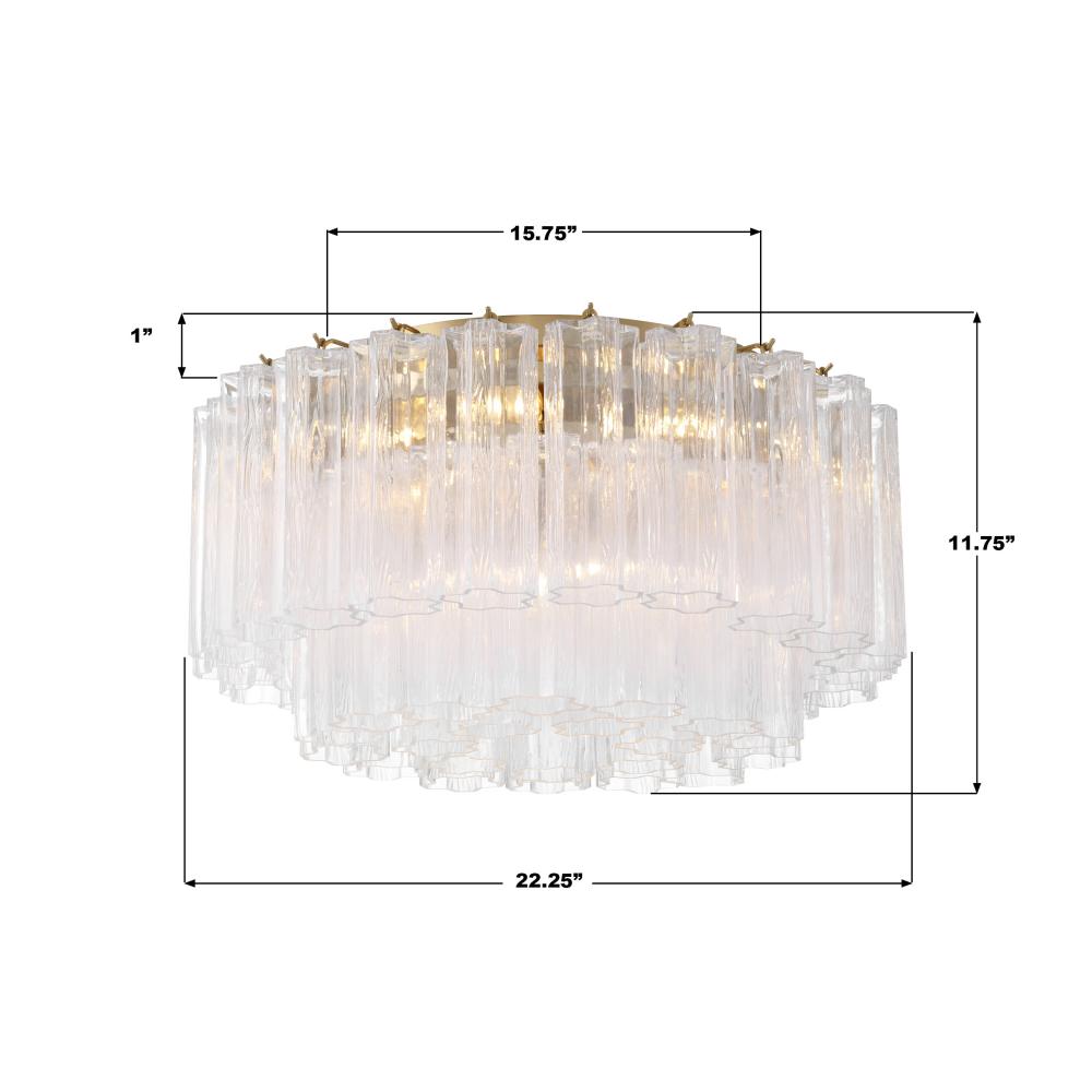 The captivating Addis Lighting Collection is a modern-day interpretation of the iconic mid-century Tronchi chandelier. Inspired by its predecessor's sleek lines and geometric shapes, the Addis features a polished Chrome or Aged Brass metal frame that exudes sophistication and style. Its unique design showcases transparent tiers of textured Tronchi glass tubes, forming a mesmerizing 5-point rounded star shape. Choose from a range of glass colors, including clear, amber, smoke, and white, or the stunning Autumn option, which features a captivating multicolor disposition of amber, clear, and smoke Tronchi glass. The Addis Lighting Collection offers various sizes and finishes, allowing you to find the perfect fit for your space while adding a touch of timeless elegance.