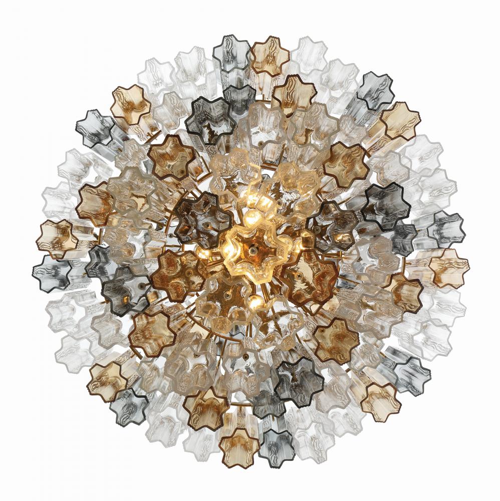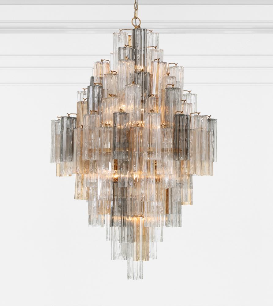 The captivating Addis Lighting Collection is a modern-day interpretation of the iconic mid-century Tronchi chandelier. Inspired by its predecessor's sleek lines and geometric shapes, the Addis features a polished Chrome or Aged Brass metal frame that exudes sophistication and style. Its unique design showcases transparent tiers of textured Tronchi glass tubes, forming a mesmerizing 5-point rounded star shape. Choose from a range of glass colors, including clear, amber, smoke, and white, or the stunning Autumn option, which features a captivating multicolor disposition of amber, clear, and smoke Tronchi glass. The Addis Lighting Collection offers various sizes and finishes, allowing you to find the perfect fit for your space while adding a touch of timeless elegance.