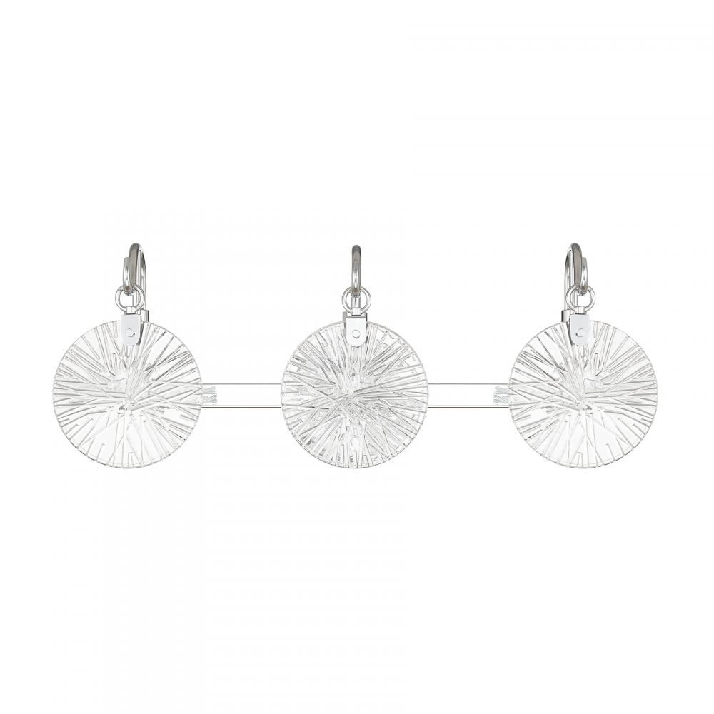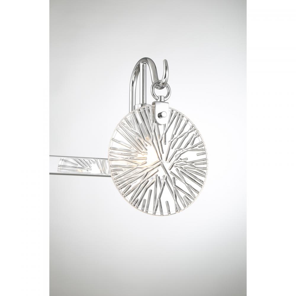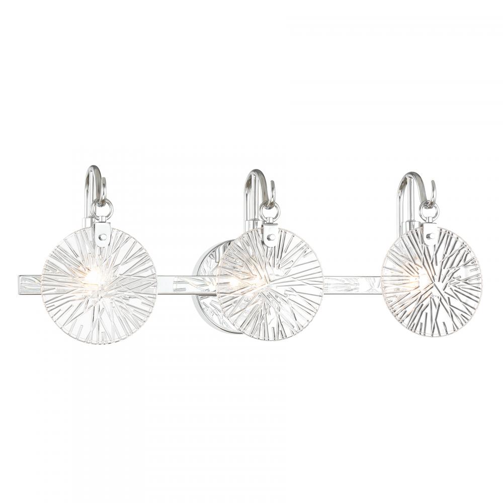 It is often said that lighting is the jewelry of the home. With its fun hook-style arms that hold flat, round, starburst clear glass shades, the Savoy House Addison 3-light bath light is a great example of this saying. The backplate is finished in Chrome and mimics the shape of the glass shades. Addison is 9" in height, 24" in width and extends 6.5" from the wall. Uses three candelabra size bulbs of up to 60 watts per bulb. Bulbs not included. This bath bar is damp area rated and must be installed as shown.
