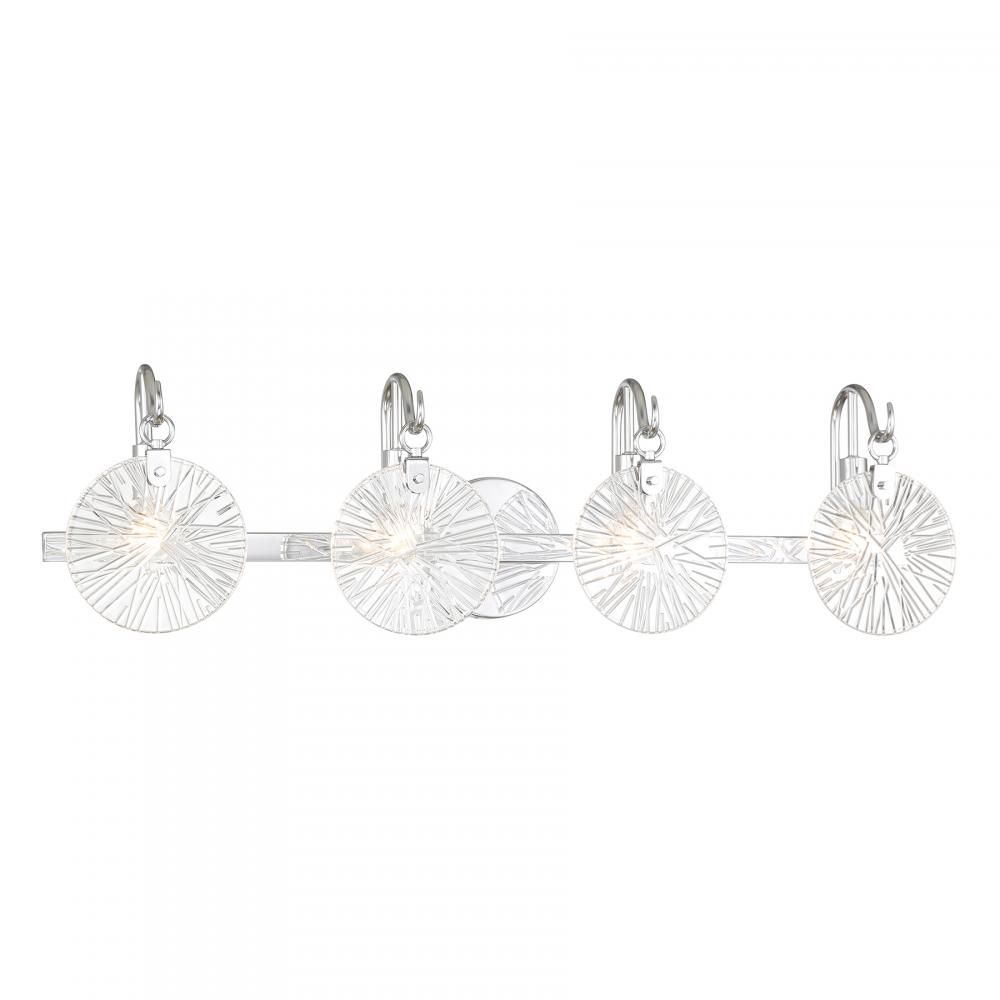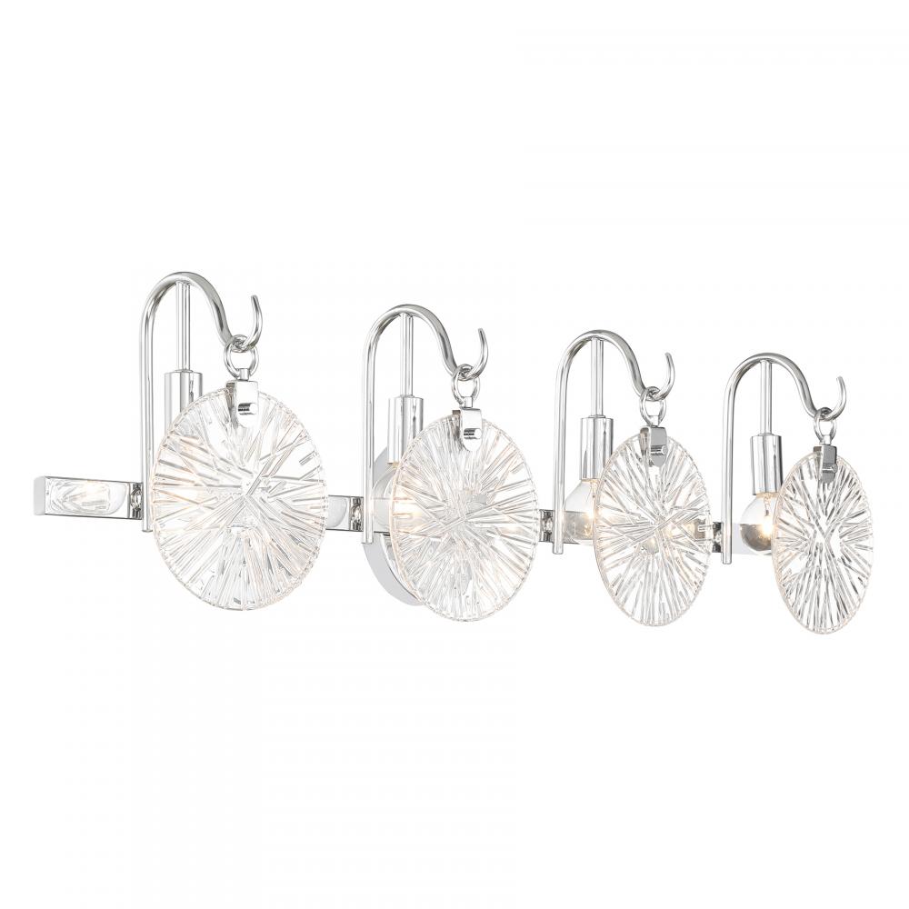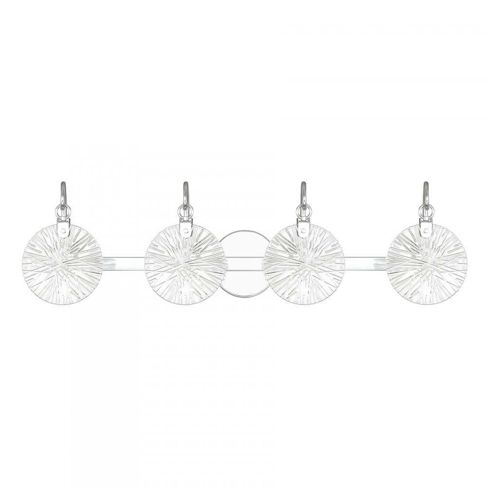 It is often said that lighting is the jewelry of the home. With its fun hook-style arms that hold flat, round, starburst clear glass shades, the Savoy House Addison 4-light bath light is a great example of this saying. The backplate is finished in Chrome and mimics the shape of the glass shades. Addison is 9" in height, 32" in width and extends 6.5" from the wall. Uses four candelabra size bulbs of up to 60 watts per bulb. Bulbs not included. This bath bar is damp area rated and must be installed as shown.