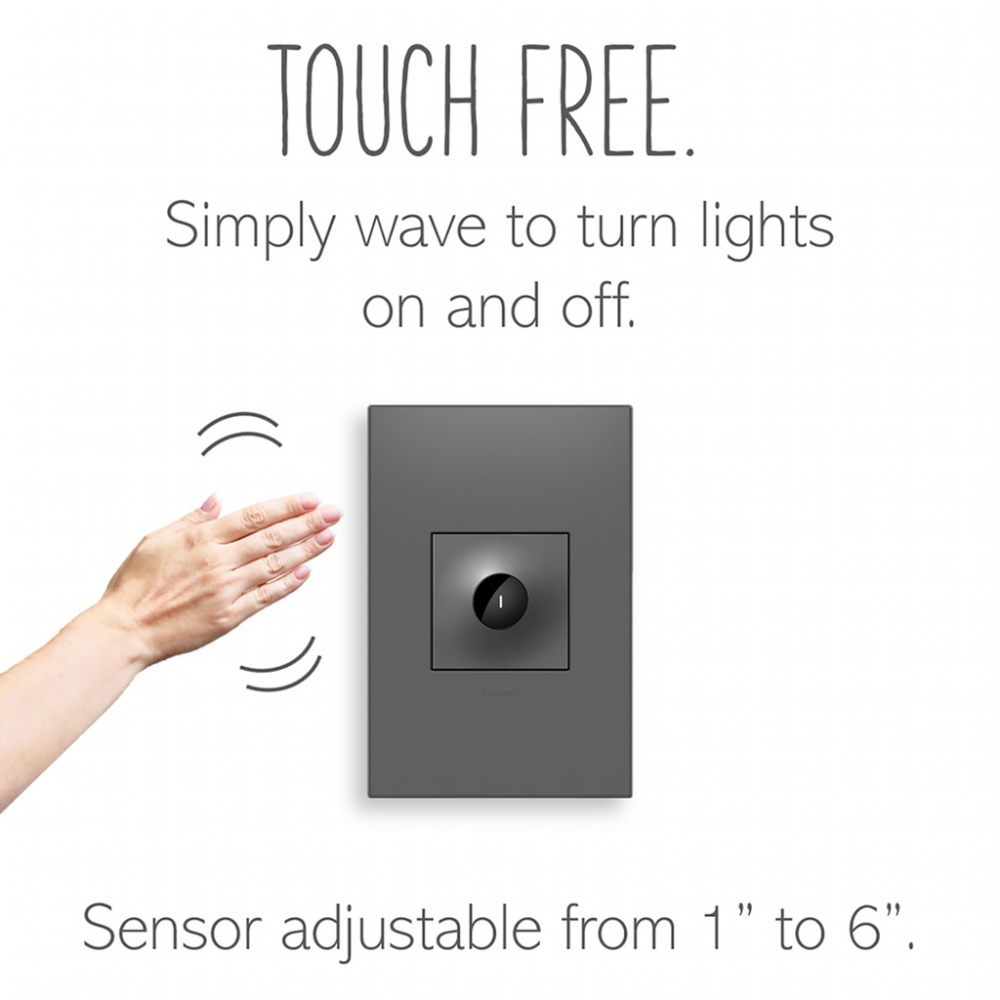 Perfect for turning the lights on or off when your hands are full or messy, especially in entryways or next to the kitchen sink. This touchless, practically hands-free light switch features innovative technology that allows you to control lights with a wave of your hand, for a germ-and-worry free option that also adds contemporary style to any space. Use the sleek, modern switch its own to control a light or fixture from a single location, or pair with a second switch to control a single light source from two locations.This switch* features enduring Microban? antimicrobial technology that works to reduce the growth of bacteria, around the clock, for the lifespan of the product.* Existing inventory of switches, dimmers and plastic wall plates from the adorne? Collection at some partner locations may not yet include Microban? protection. To confirm that a specific Legrand product is protected with Microban?, check that the exterior of the product packaging includes a green dot or a ""Protected with Microban"" label.Made exclusively for use with screwless Wall Plates from the adorne? Collection, sold separately.No antimicrobial efficacy claims are being made or are valid with respect to products sold in Canada.